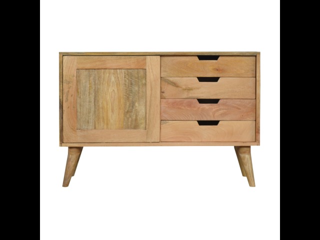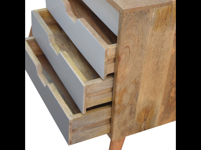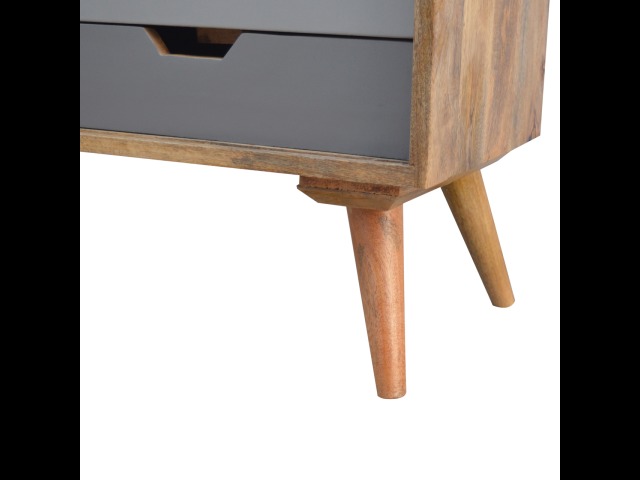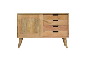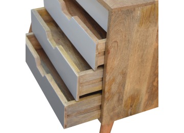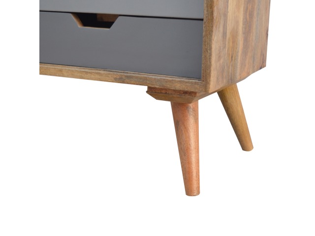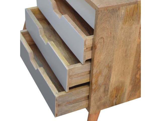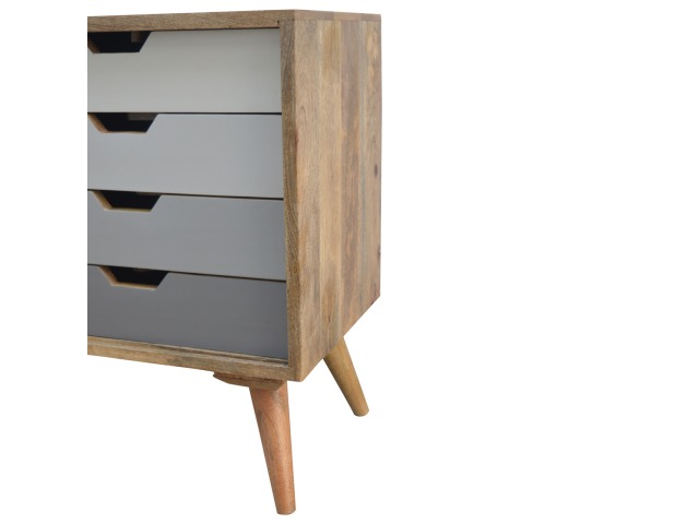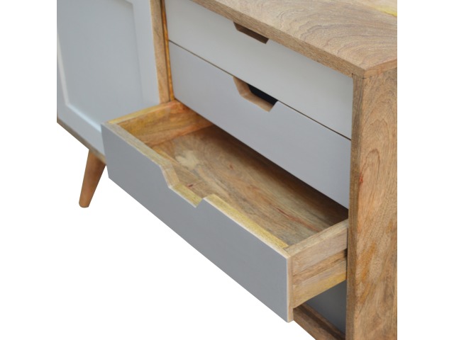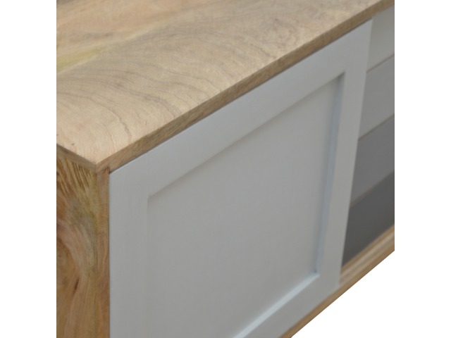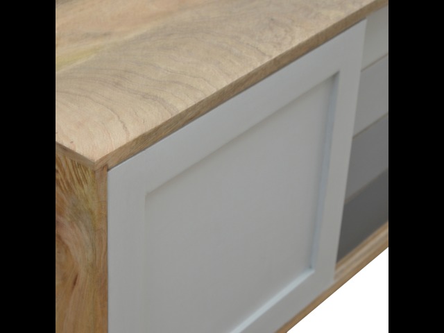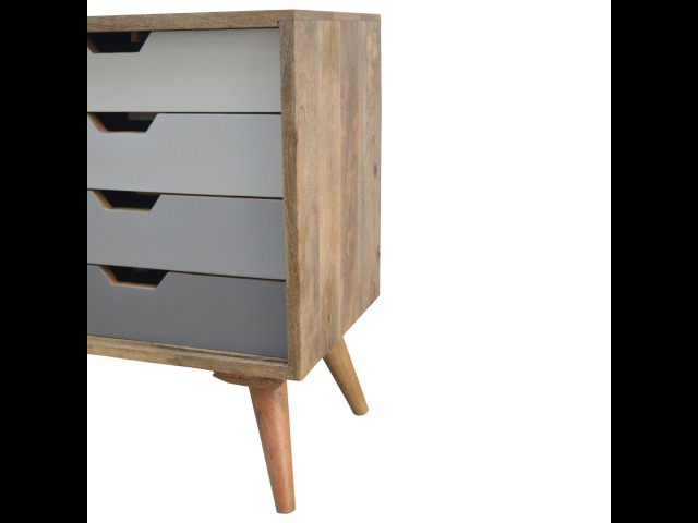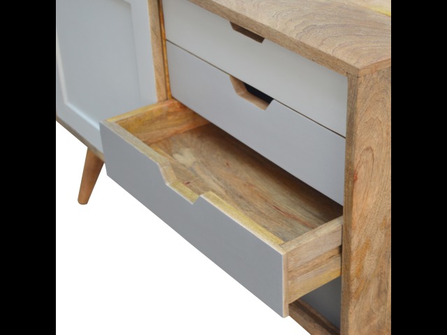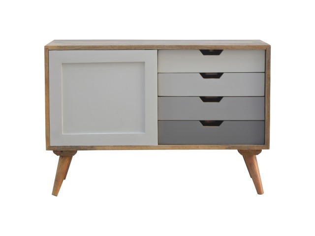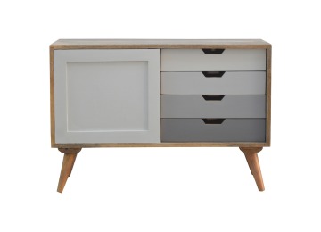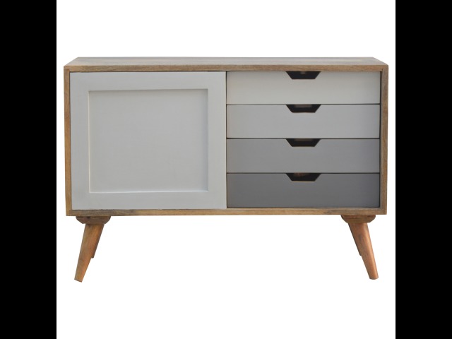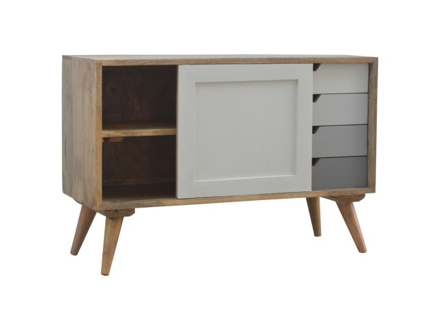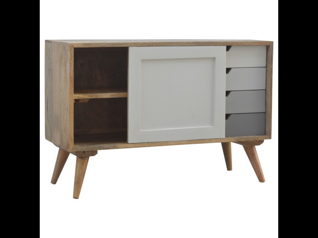 Our solid timber sliding sideboard is expertly constructed from 100% solid mango wood and has a clean & simple Nordic gradient design to suit most homes. This piece has a lovely oak-ish finish and the drawers are hand-painted in different tones of grey. It is carefully finished in a durable lacquer to help protect and enhance the look of this solid piece of furniture.