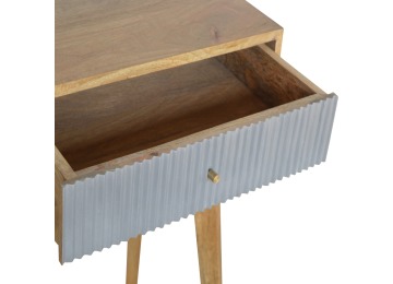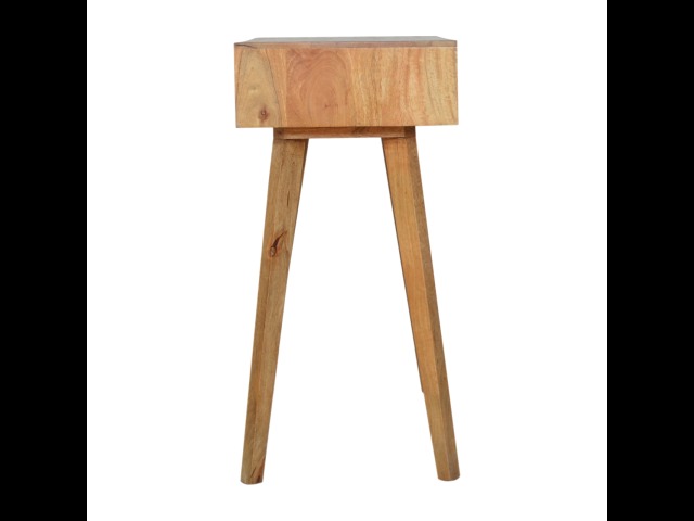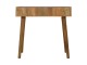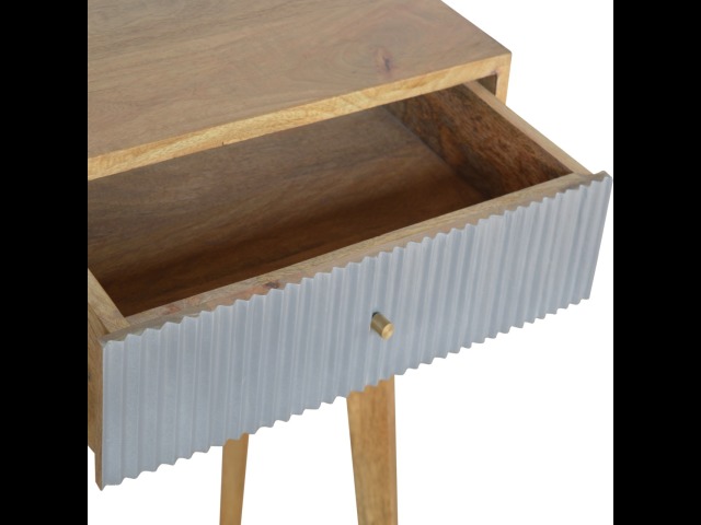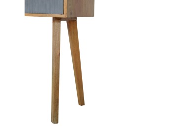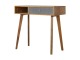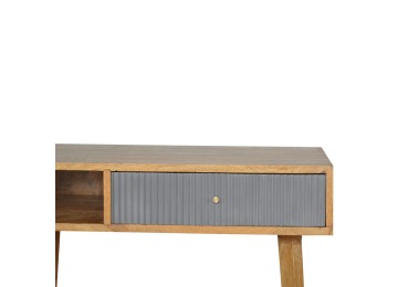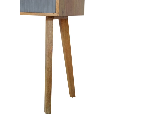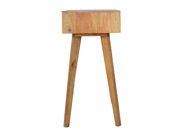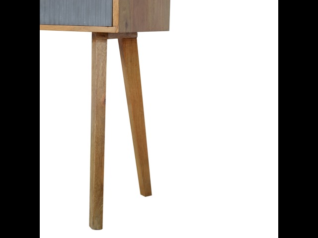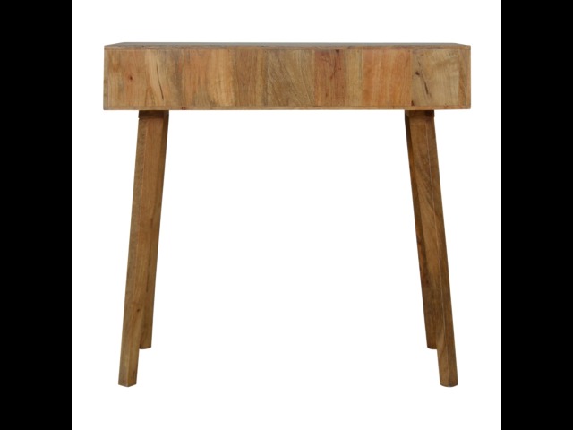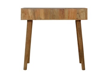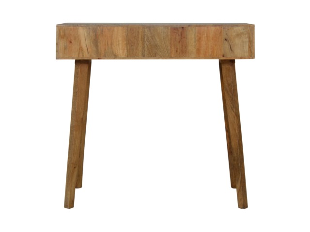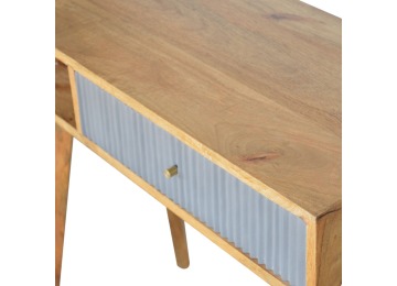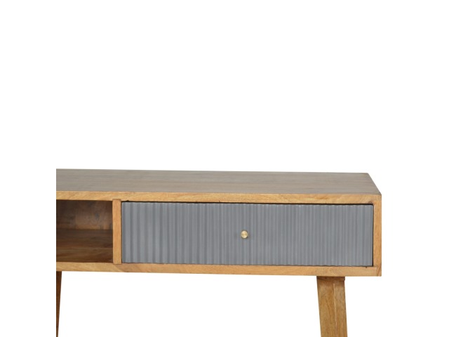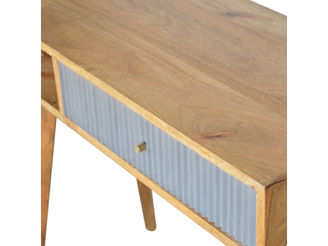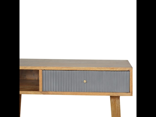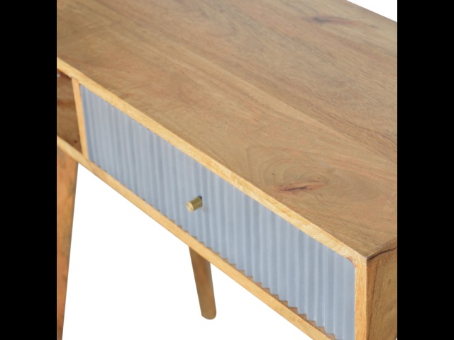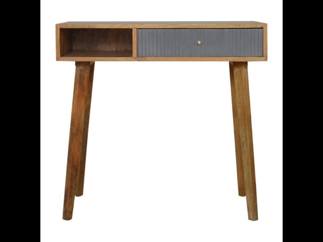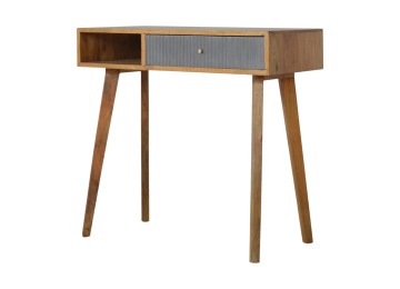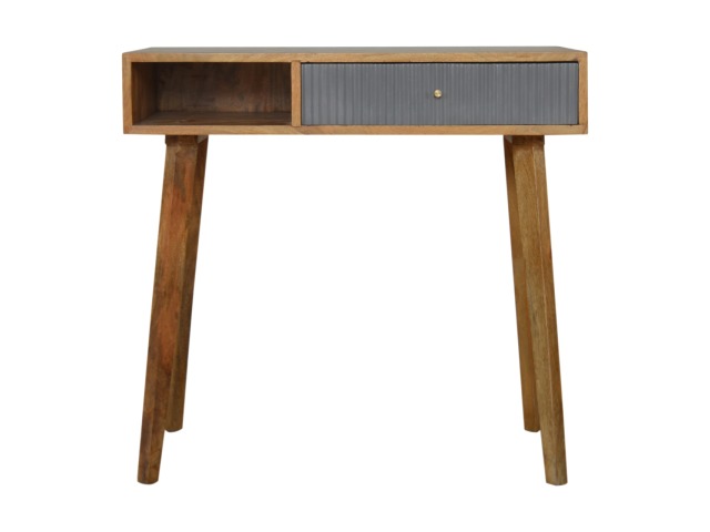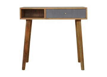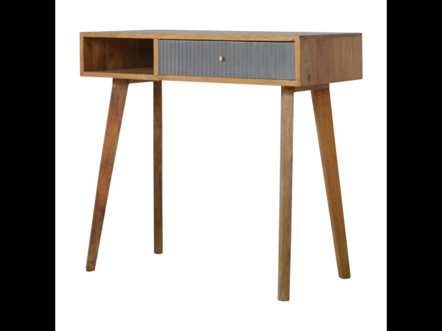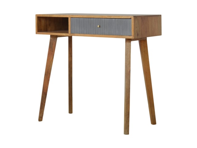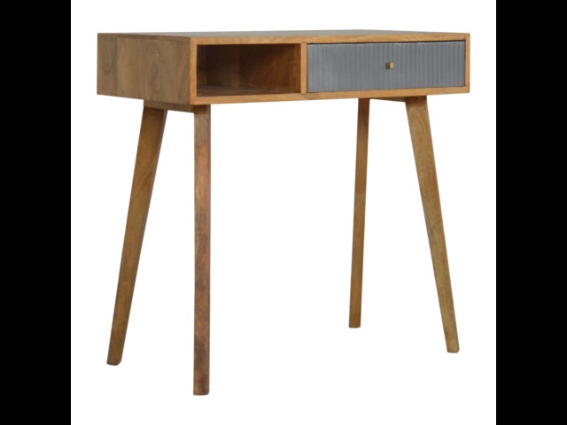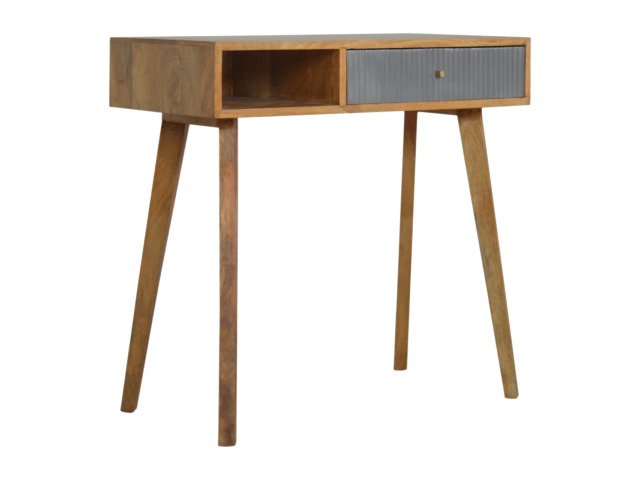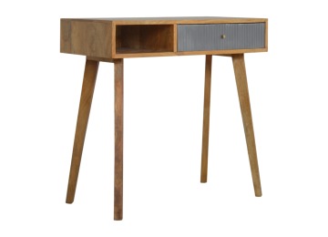 This divine writing desk has been constructed from 100% solid mango wood with an oak-ish finish body and has a grey hand painted, hand carved drawer front which has a candle knob for easy access to and from the drawers. The modern and simple piece would compliment any living room or bedroom and is ideal for compact city homes.