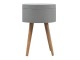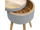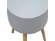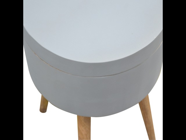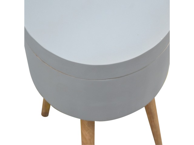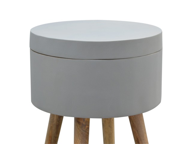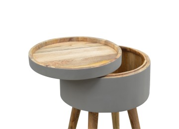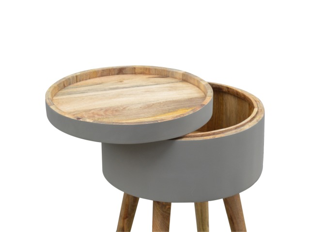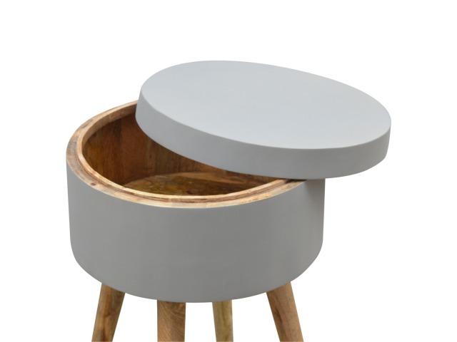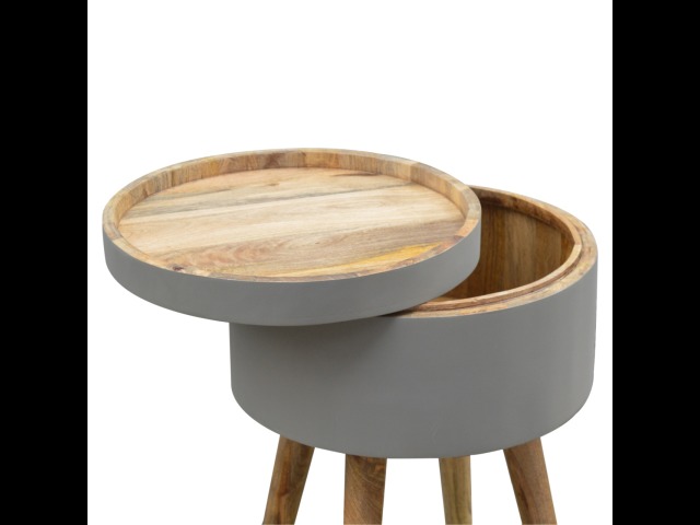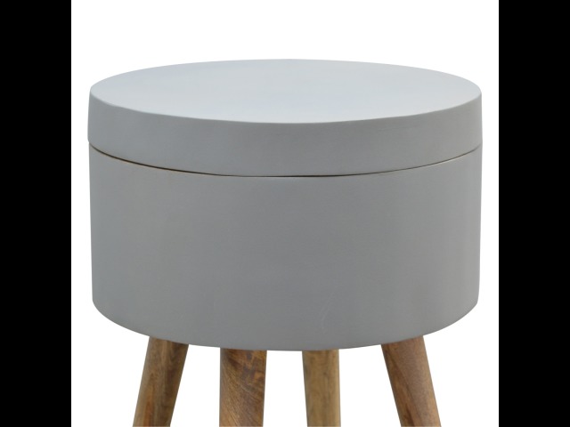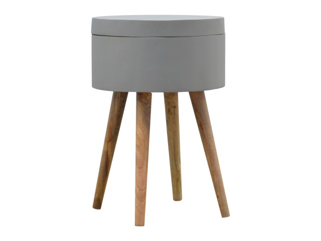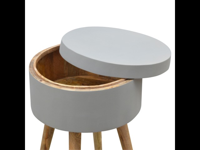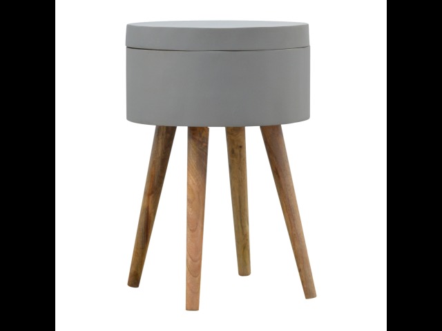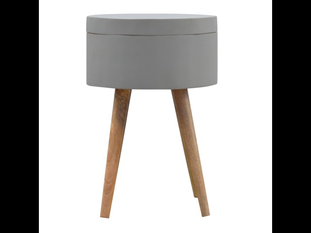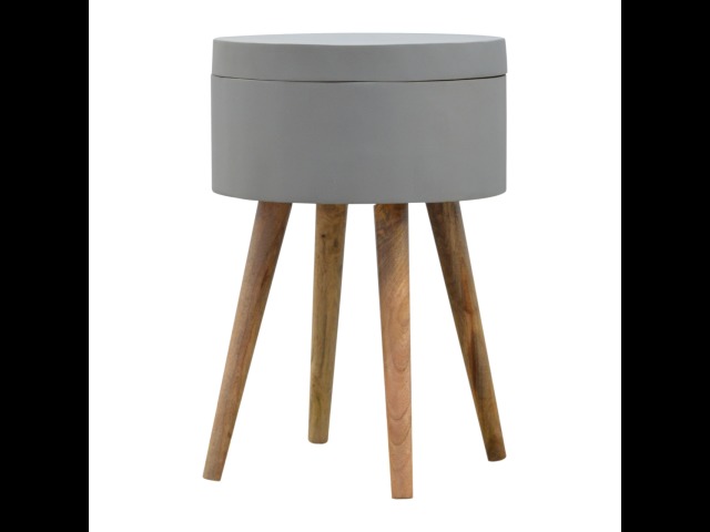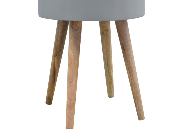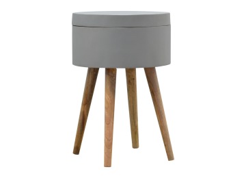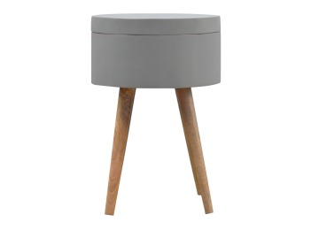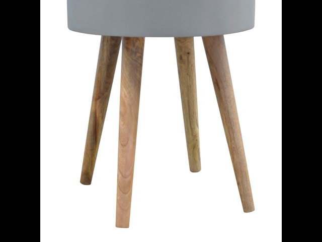 This round table and drawer unit is perfect for the side of the bed or sofa. It contains one deep drawer, providing ample storage space for any bits and pieces you wish to have close to you. It has been painted in a grey paint and features 4 Nordic style legs in an oak-ish finish.
