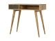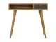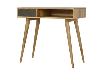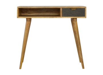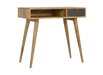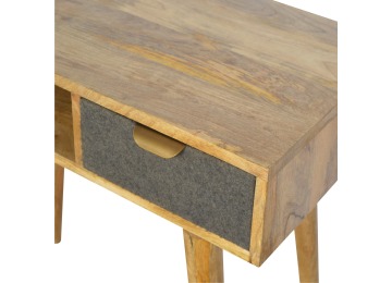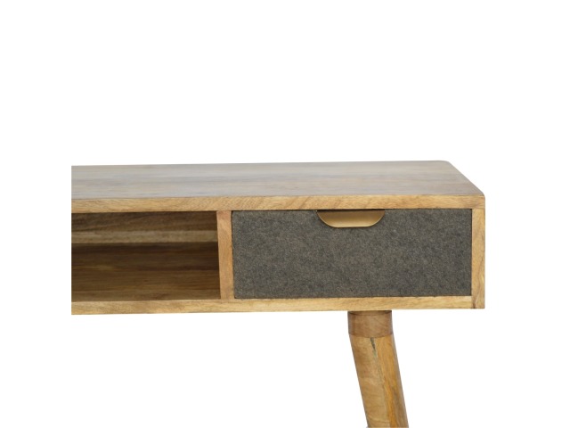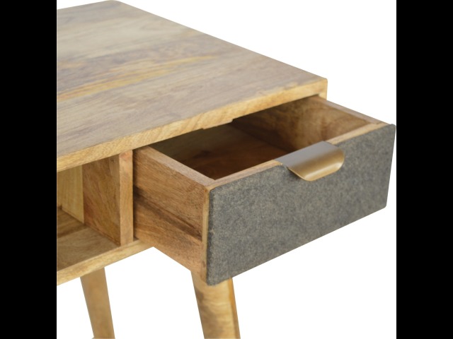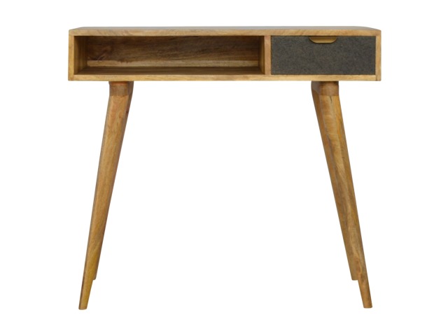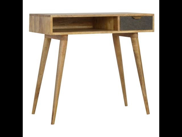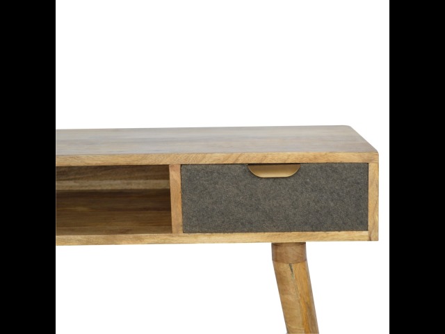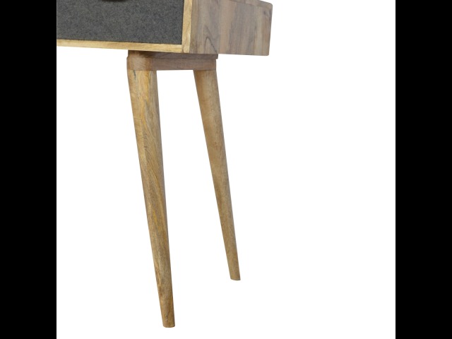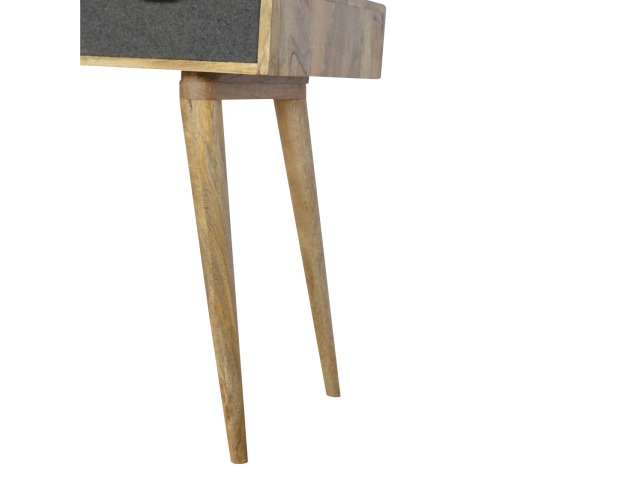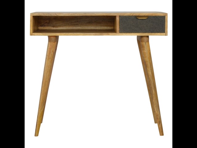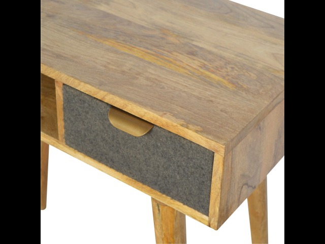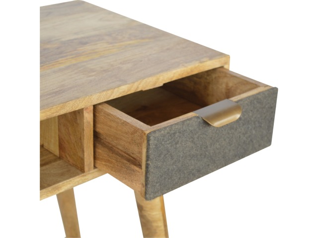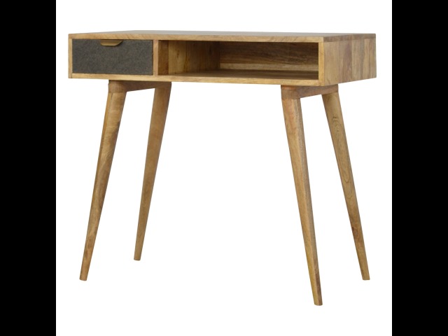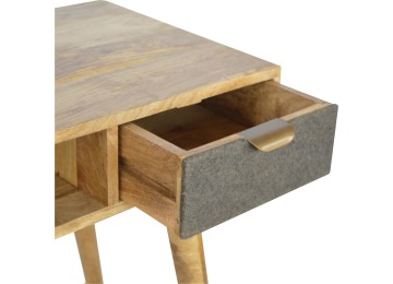 Finished with a fabric front drawer, and upholstered in a grey tweed to match perfectly with the fabric front bedside table, this writing desk takes a different twist on furniture by incooporating 2 materials and combining them together. It features a solid wood body finished in an oak-ish finish and a golden pull-out handle with 4 Nordic style legs. It is the perfect addition to both modern and country homes and also open slot which is perfect for studying and keeping any papers, notes or stationary.