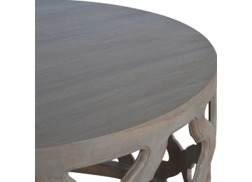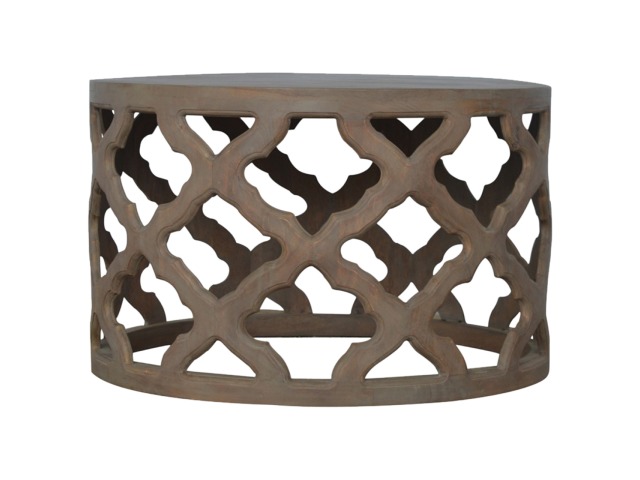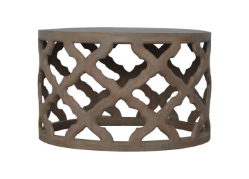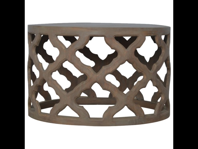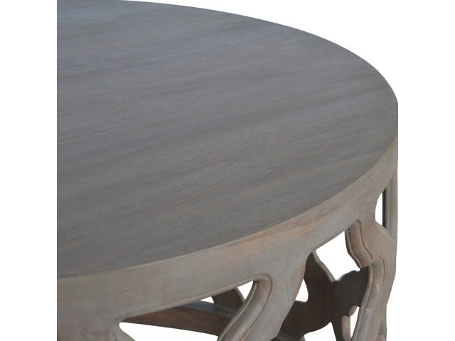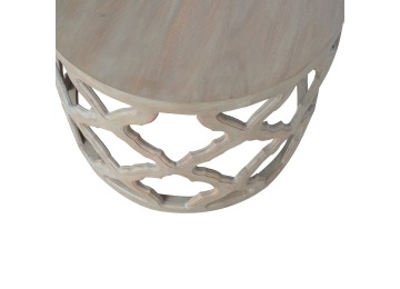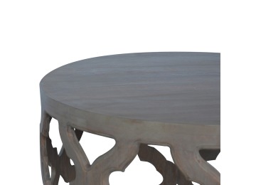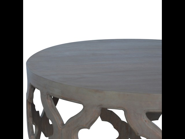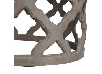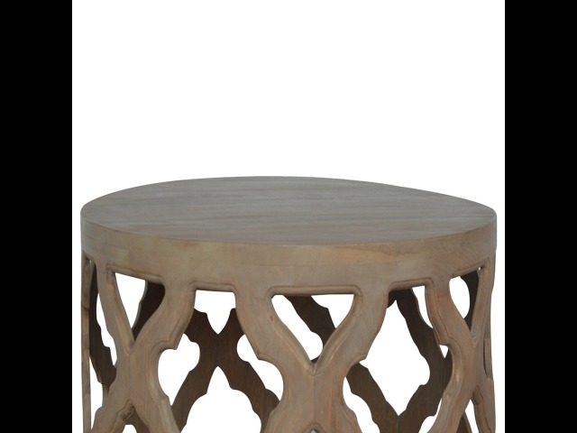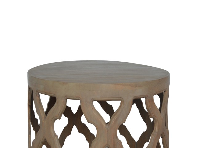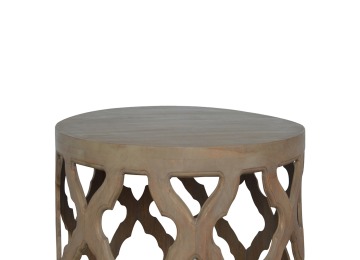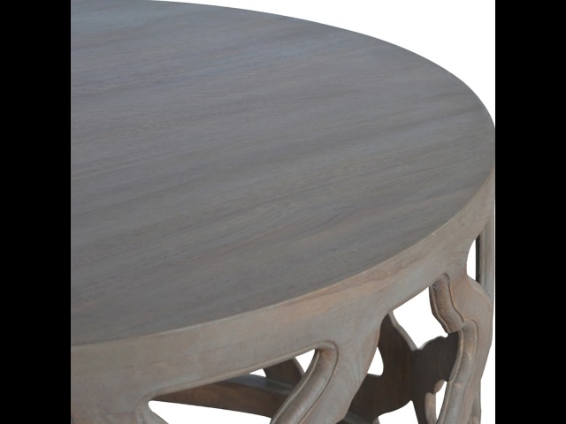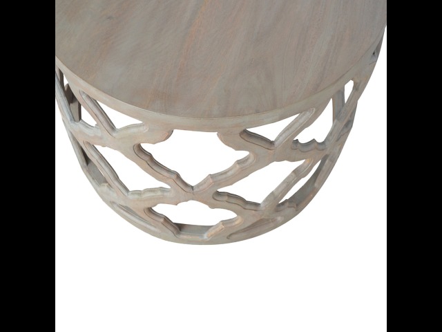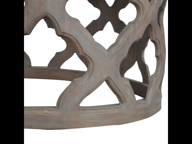This round stool is constructed from 100% solid mango wood and has a smooth grey wash finish. It is beautifully hand-carved from skilled artisans, with a carefully carved floral base. A lovely addition to your home.