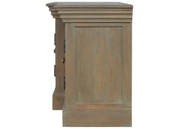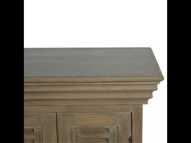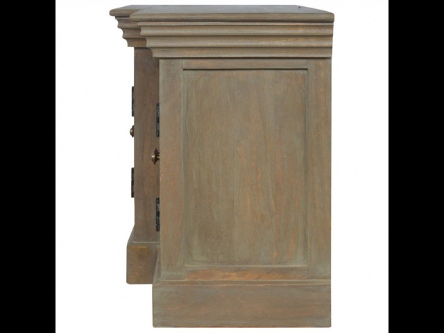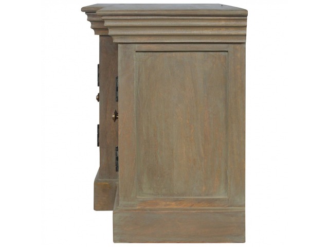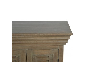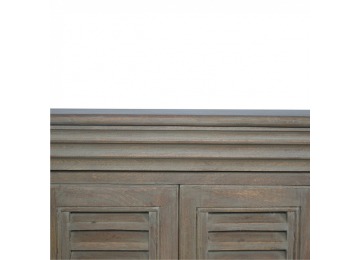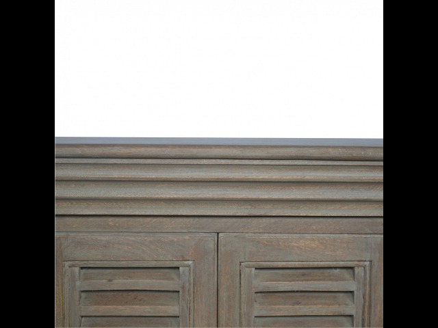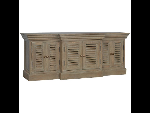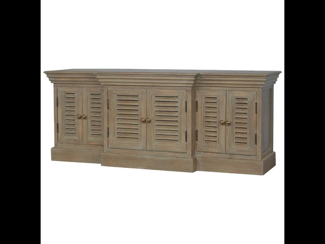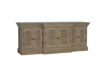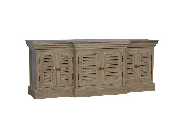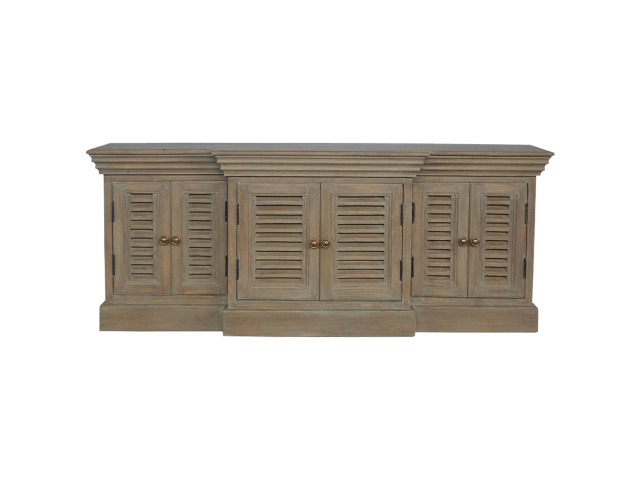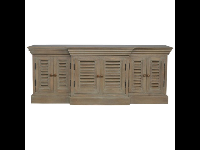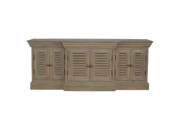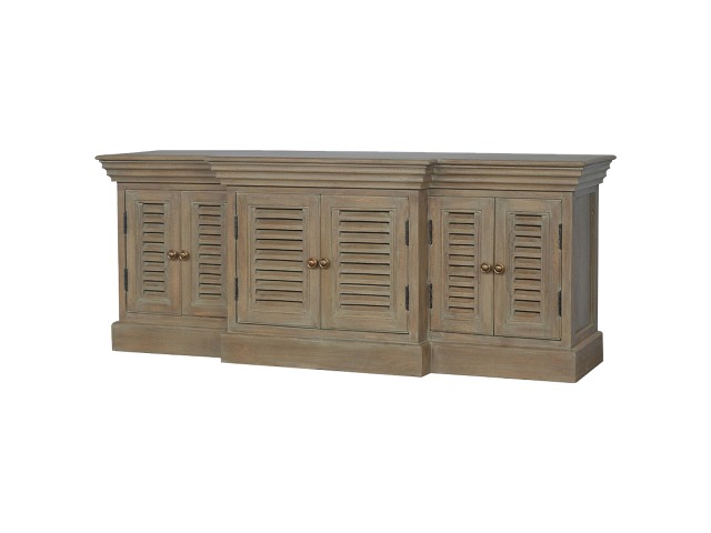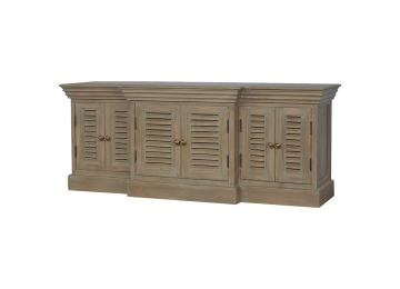 The TV Unit has been made from 100% Mango Wood and finished in a grey wash bleached finish is the epitome of coastal elegance. It comes with 6 French inspired shutters cabinet doors that have round knob handles. A few other features include a decent sized top to place your TV, also this media unit is floor mounted.