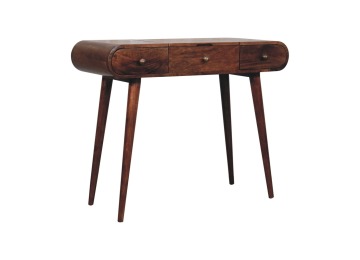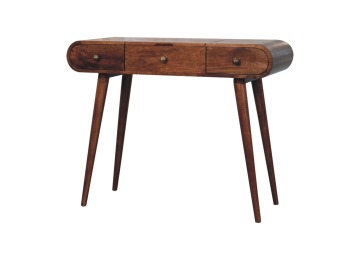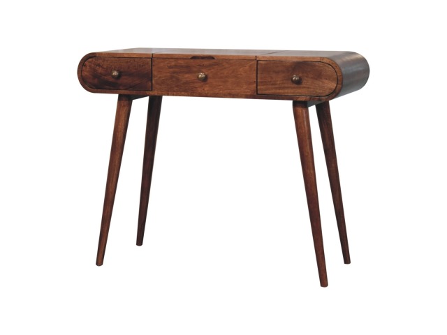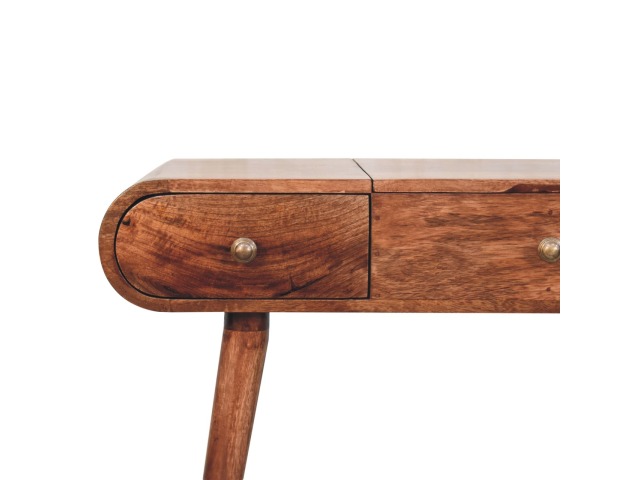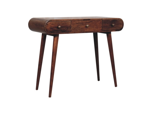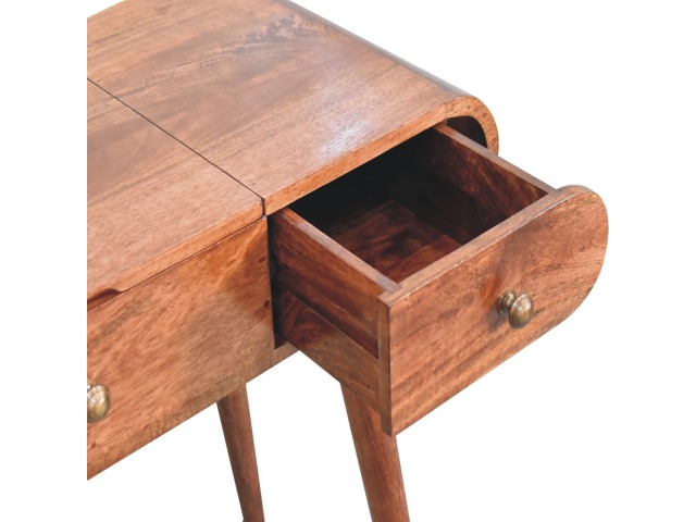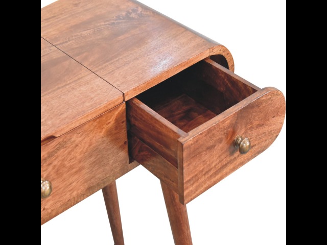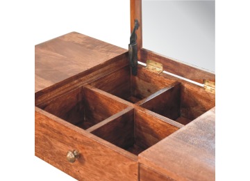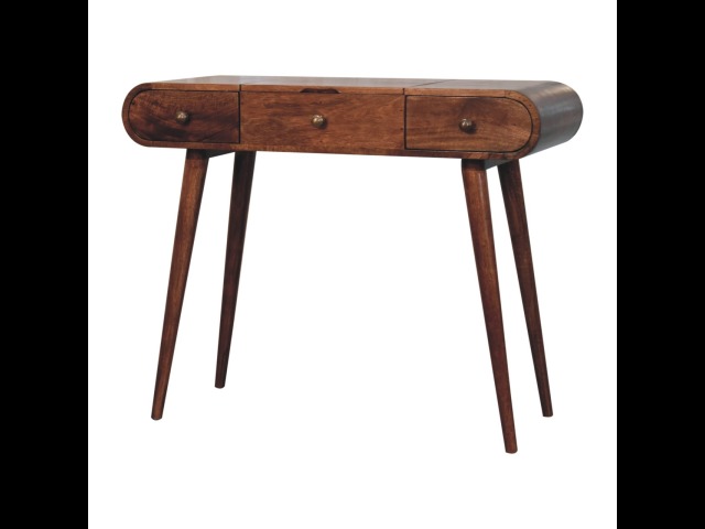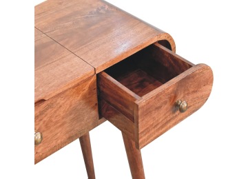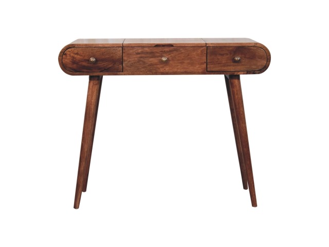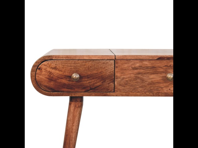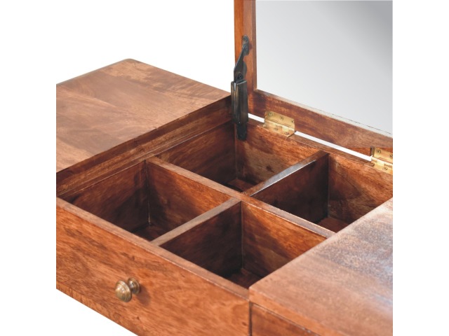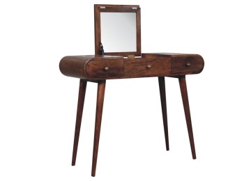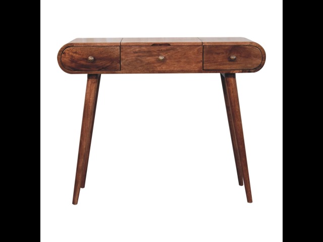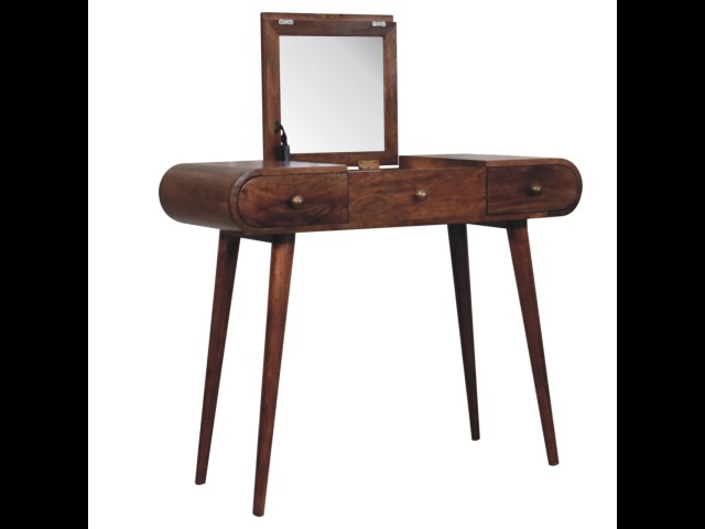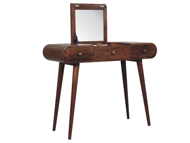 Add this beautiful yet simple dressing table to your home. Constructed from 100% solid mango wood with 3 drawers, it features Nordic style legs, a foldable mirror, and storage compartments for storing any bits and pieces such as jewellery and makeup. This is a lovely and versatile piece that will complement any room beautifully.