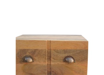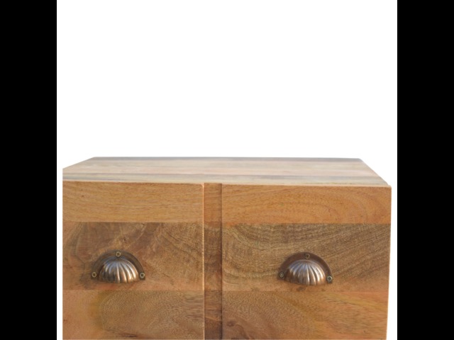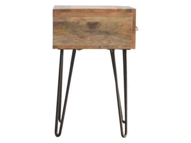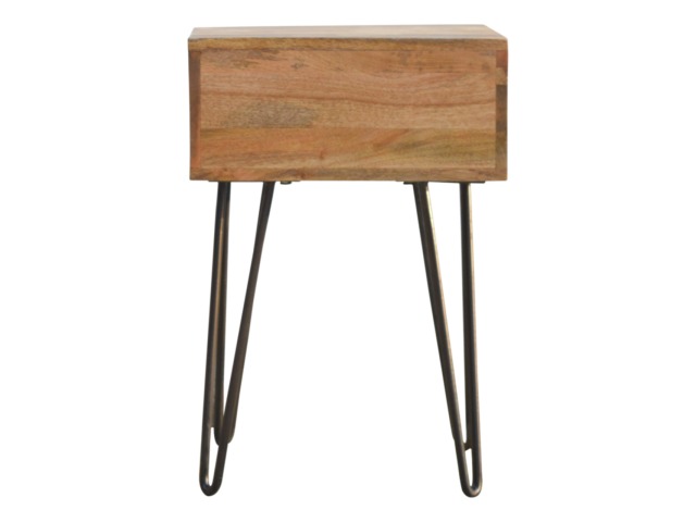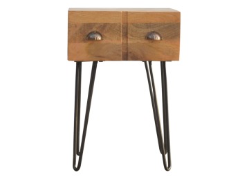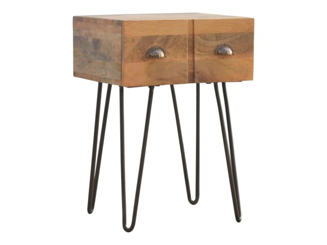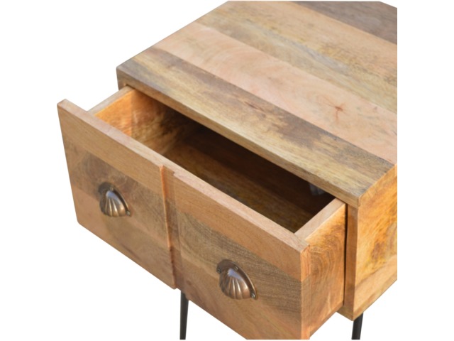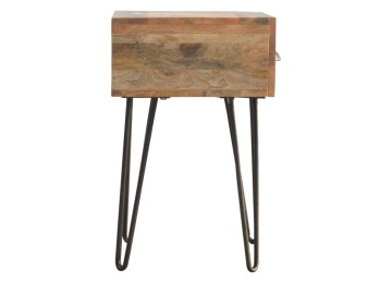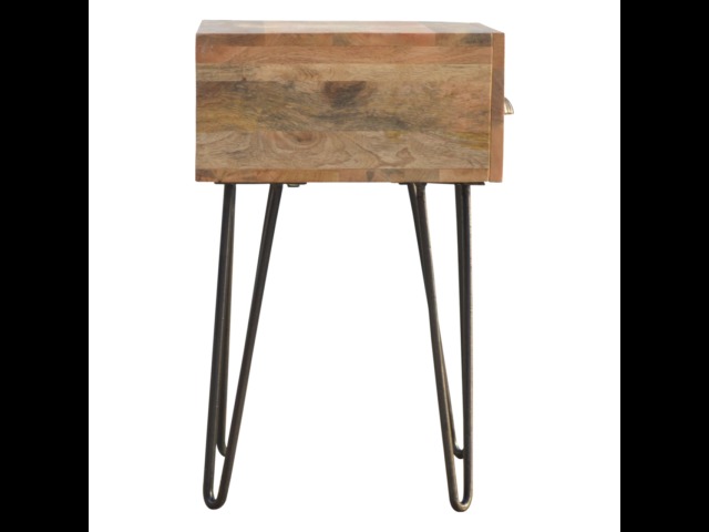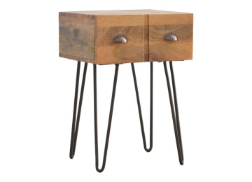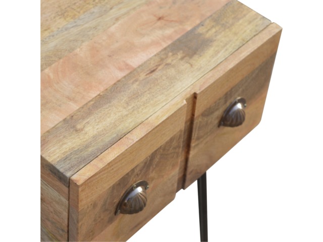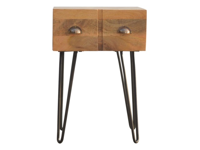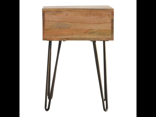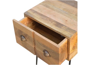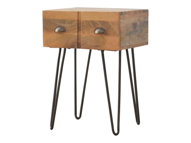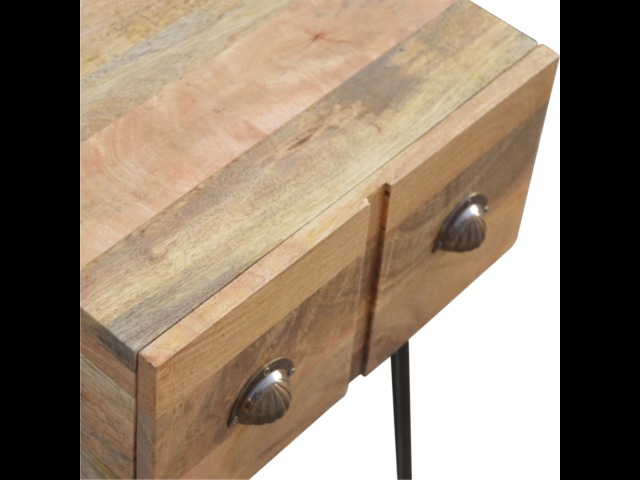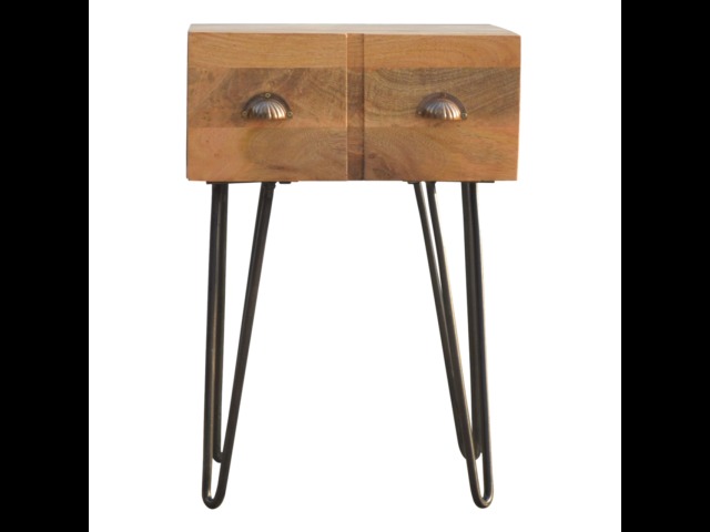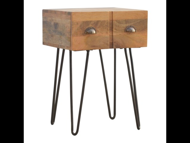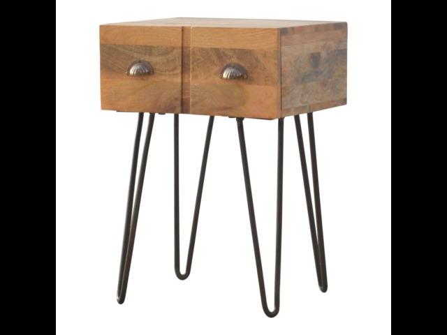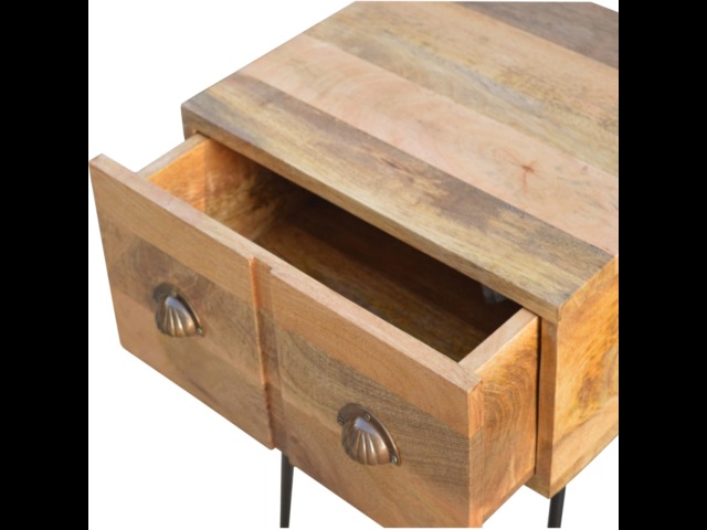 This solid wood industrial design bedside is a fabulous addition to your home adding a more modern feel your bedroom. It is constructed from 100% solid mango wood and the base/legs are constructed from 100% metal Iron. Useful storage space is available with 1 drawer and a decent sized top to place a lamp, books etc. Other features include a smooth oak-ish finish on the wood, triangular metal legs which have a pewter finish and are knock down but very easy to assemble, the drawers also come with 2 shell handles which are.