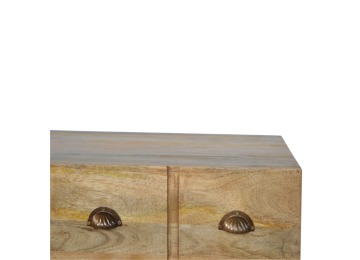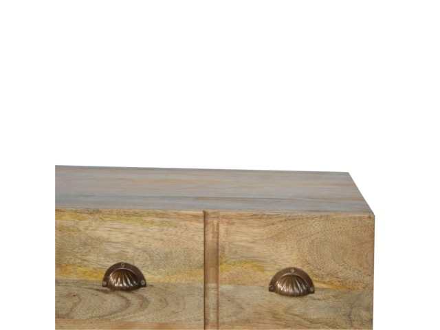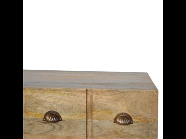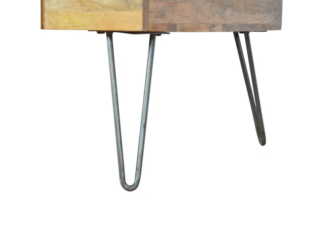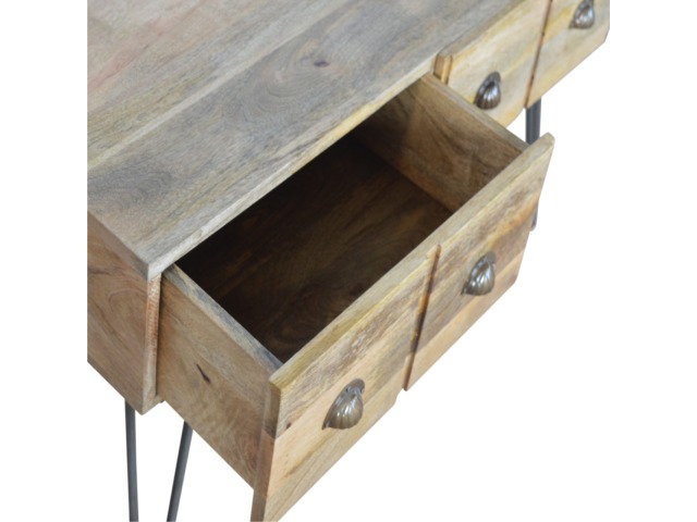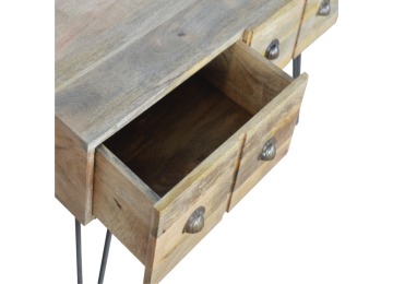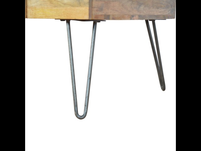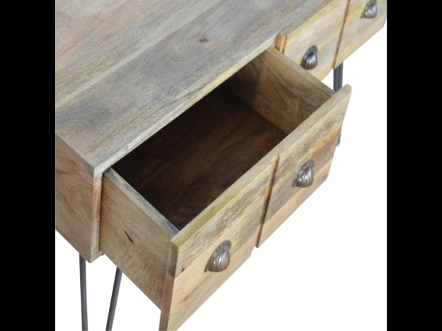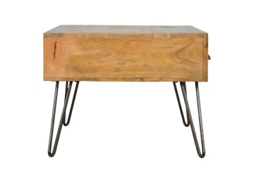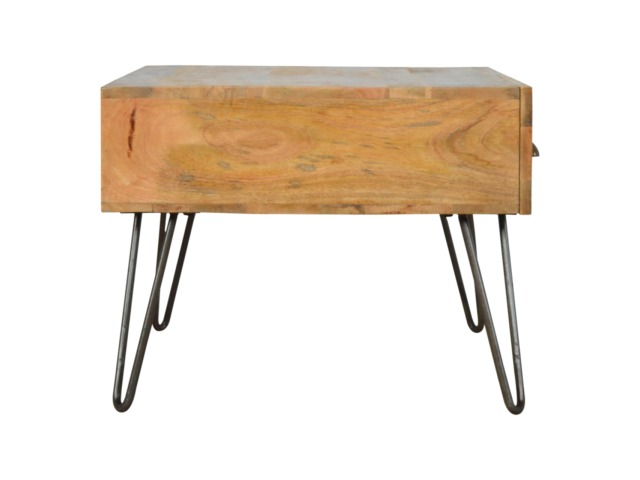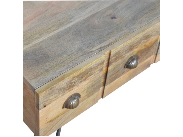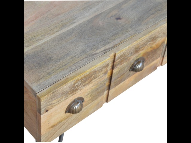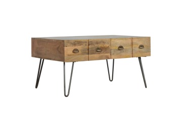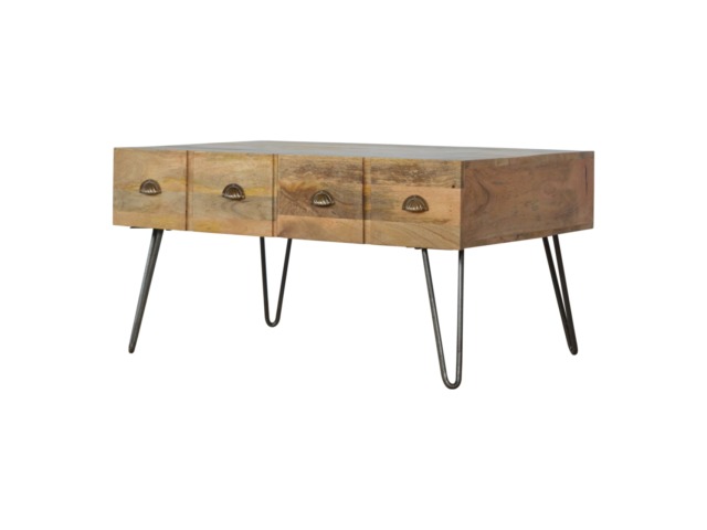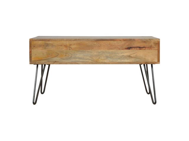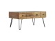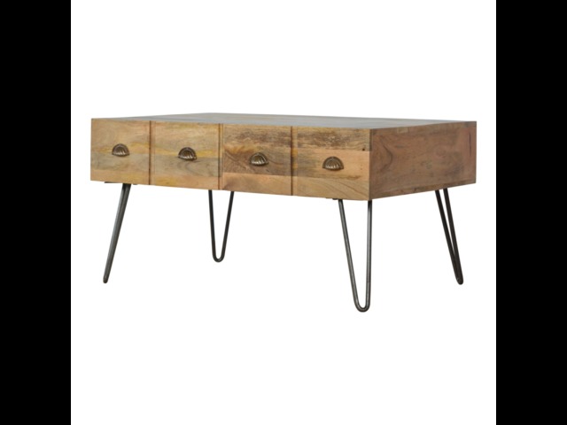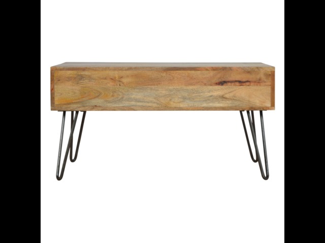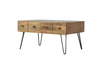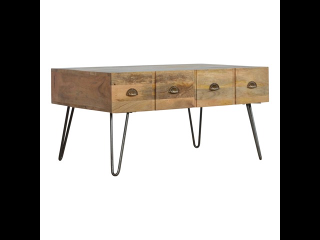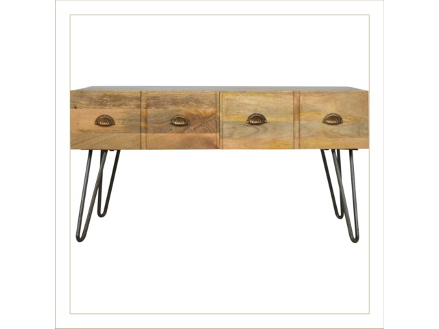 This solid wood industrial design central table is a fabulous addition to your home adding a more modern feel to your front room. It is constructed from 100% solid mango wood, and the base/legs are constructed from 100% metal Iron. Useful storage space is available with 2 drawers, a smooth oak-ish finish on the wood, triangular metal legs which have a pewter finish and shell handles.