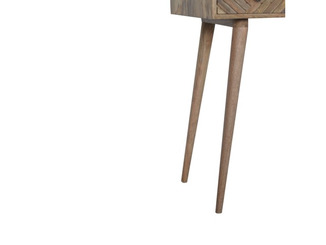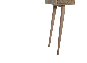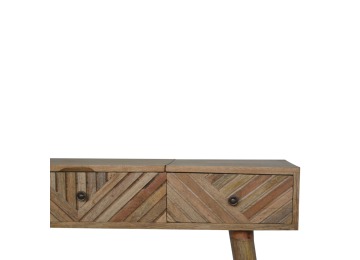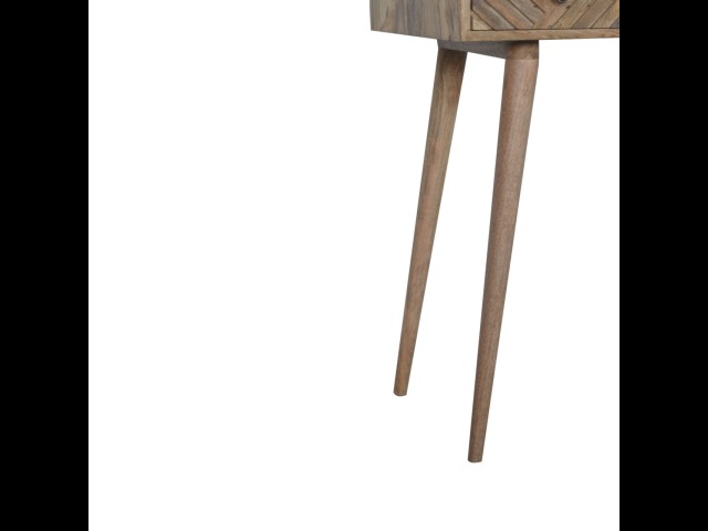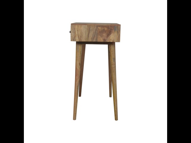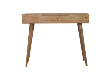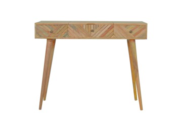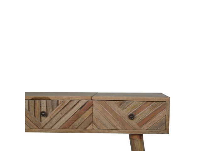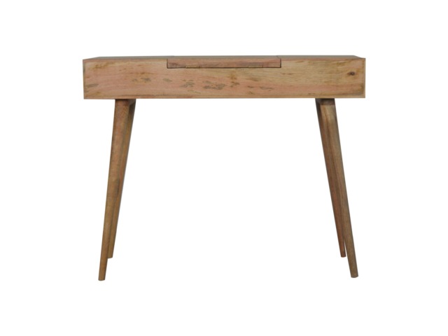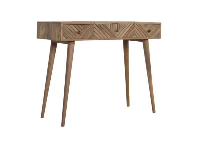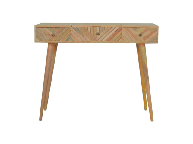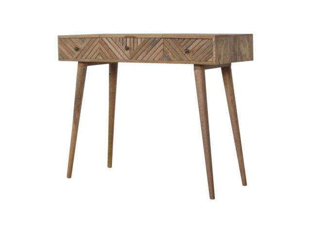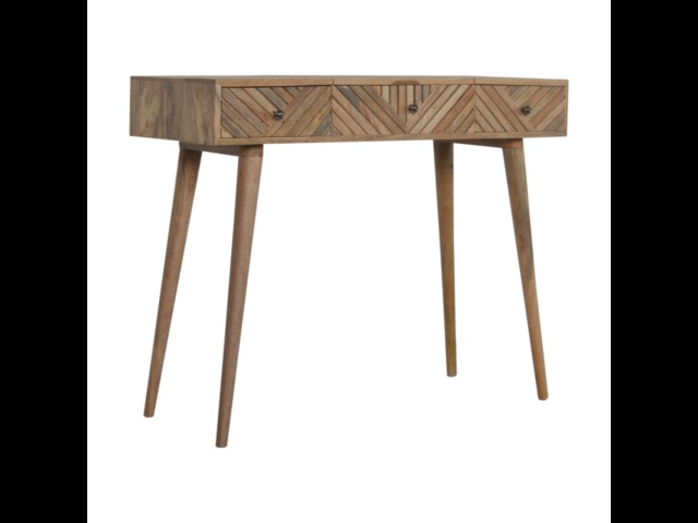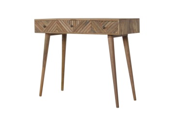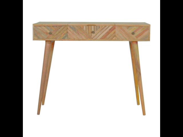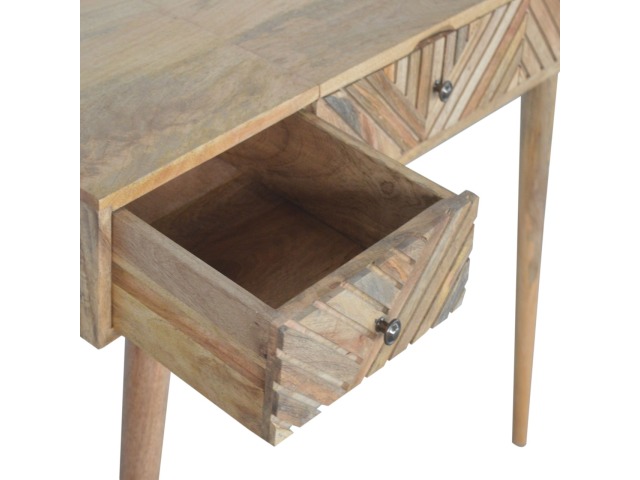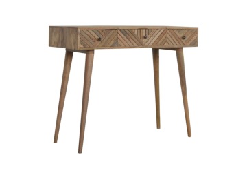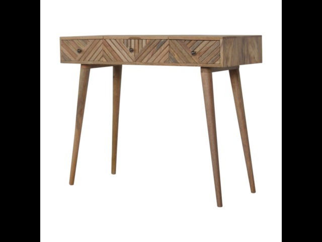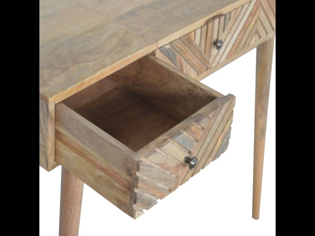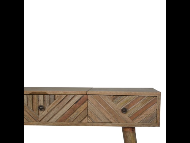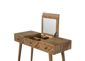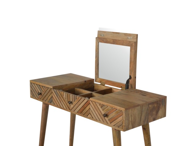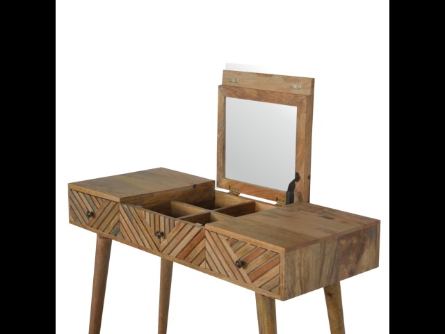 Add this beautiful dressing table to your home. Constructed from 100% solid mango wood with 3 storage drawers which offer a unique carved design, it also features a foldable mirror and mini storage compartments for storing any bits and pieces. Some other products features include Nordic style legs and shiny brass knobs. A lovely versatile piece that will compliment any room beautifully.
