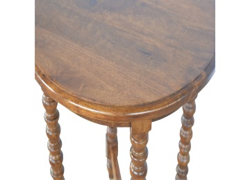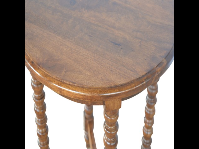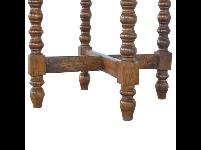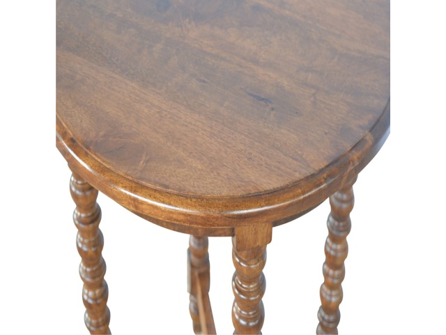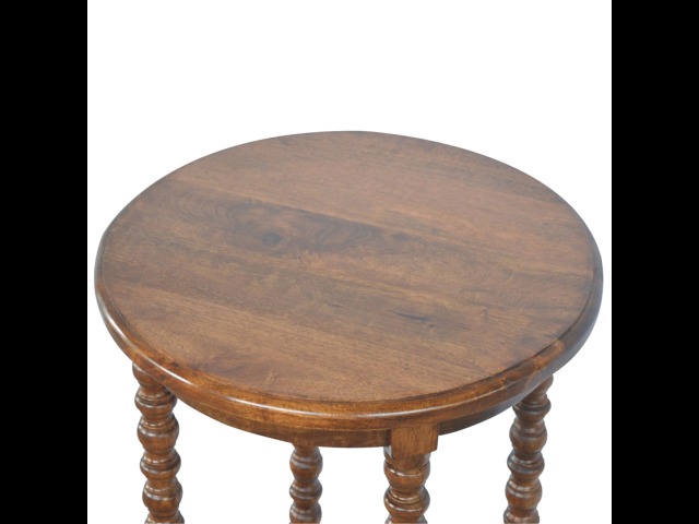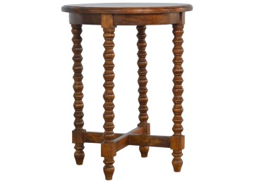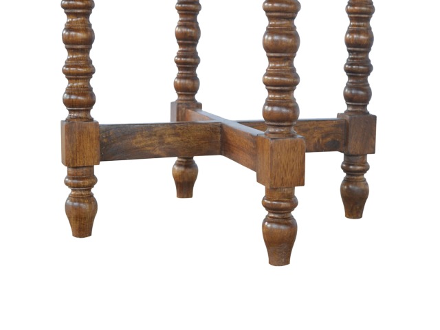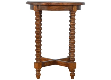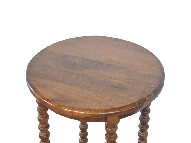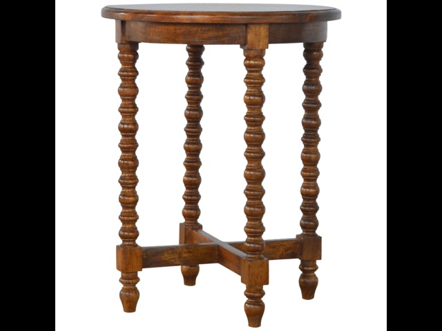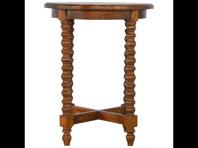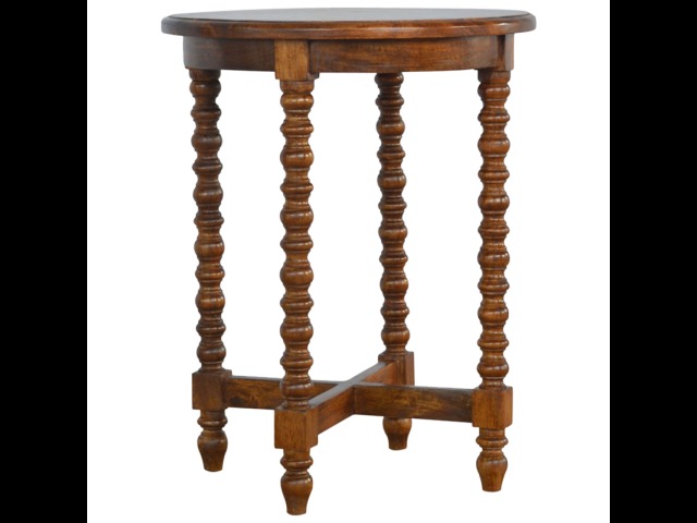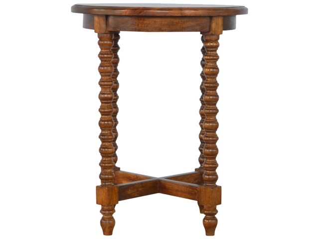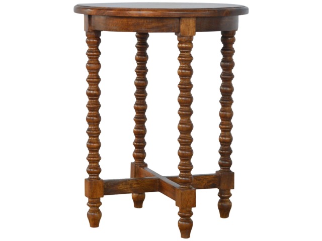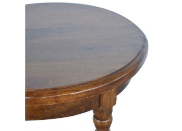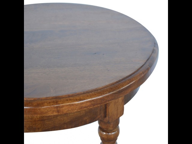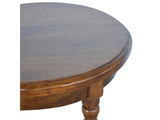 This petite round coffee table is constructed from 100% solid mango wood and has a fine, smooth chestnut finish. Other features include hand turned legs, add this practical and beautiful piece of furniture to your home.