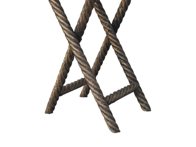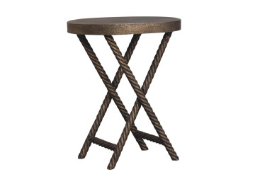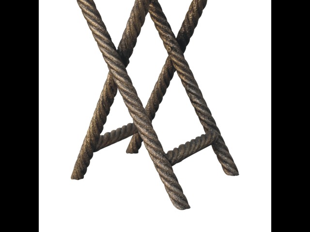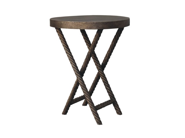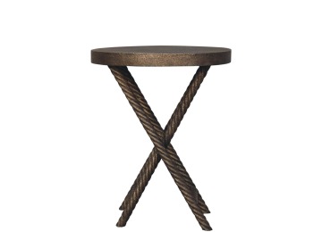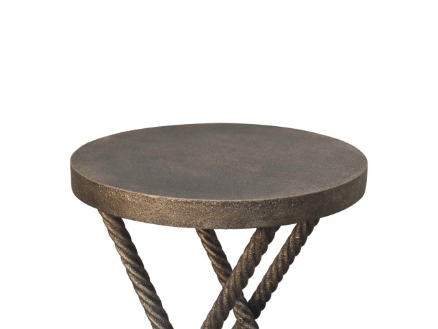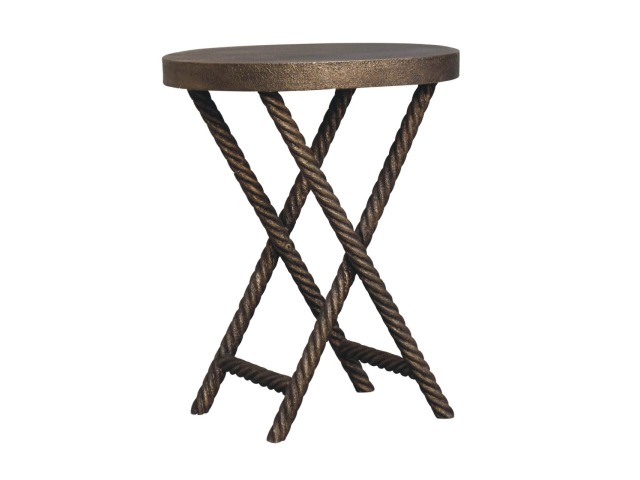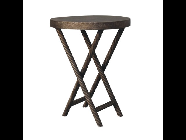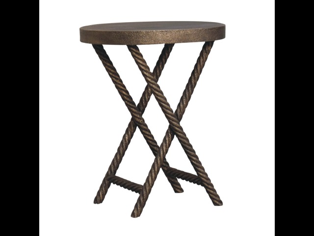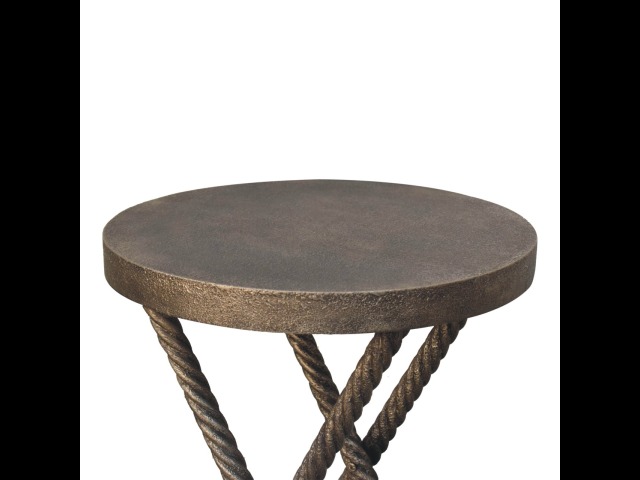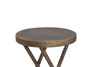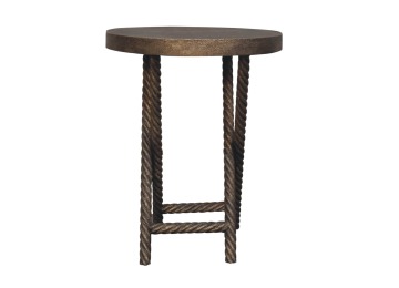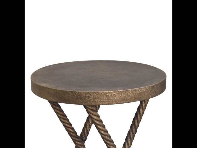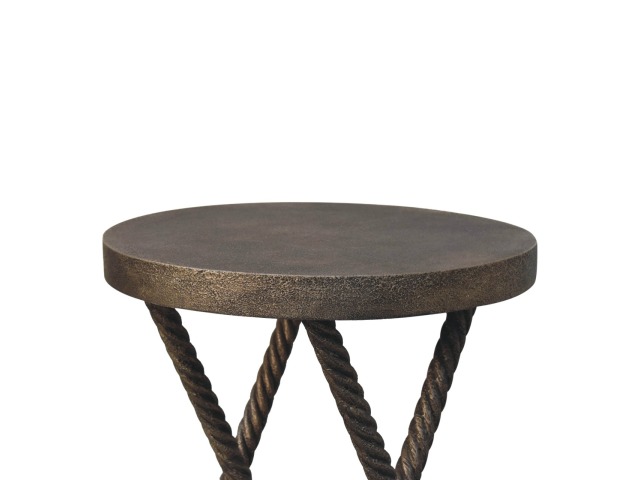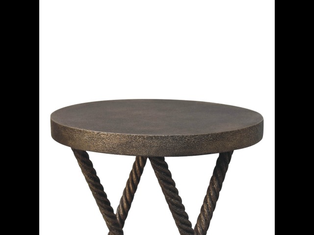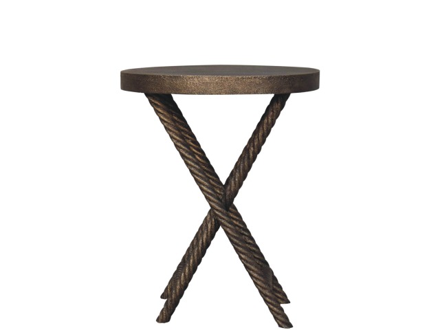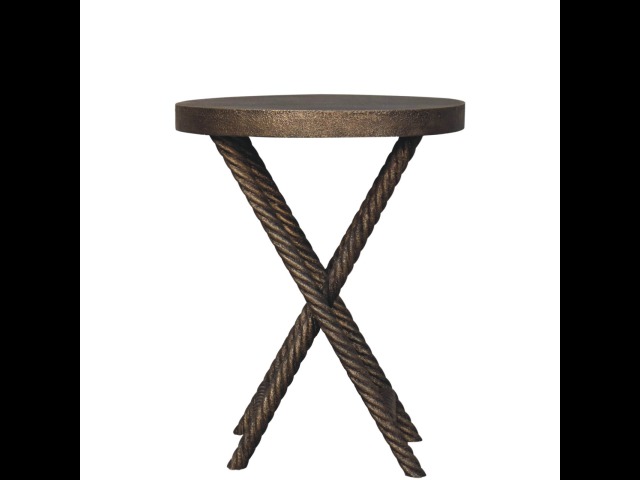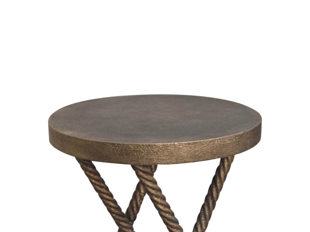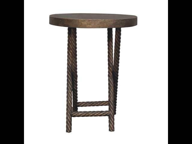 This small side table is perfect for the living room. Made from 100% solid mango wood, it's strong and has a unique rope design on the legs. It's finished with a shiny metallic look, adding a special touch to any space. Great for holding lamps, drinks, or decorations, it fits well with many room styles.