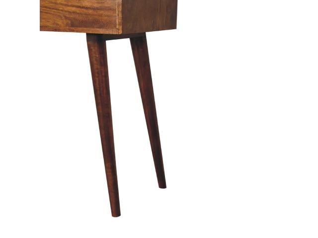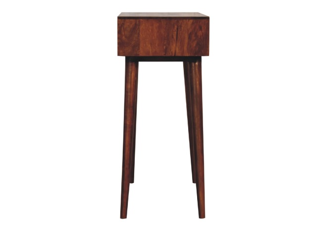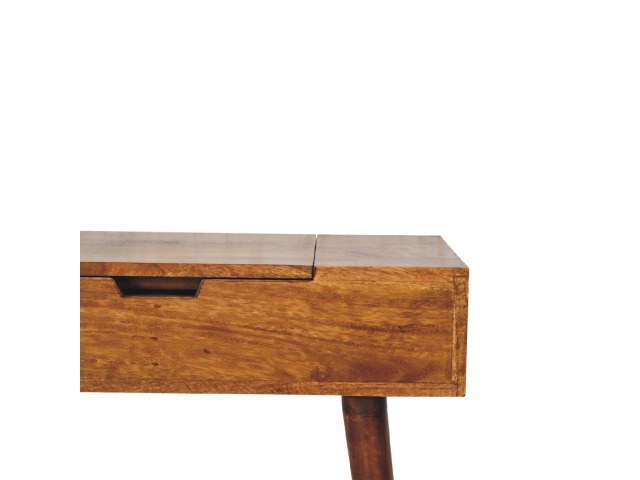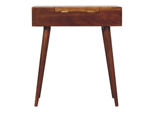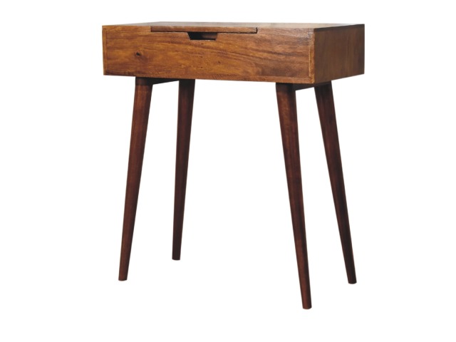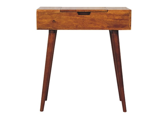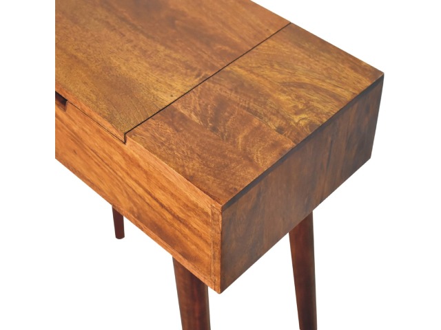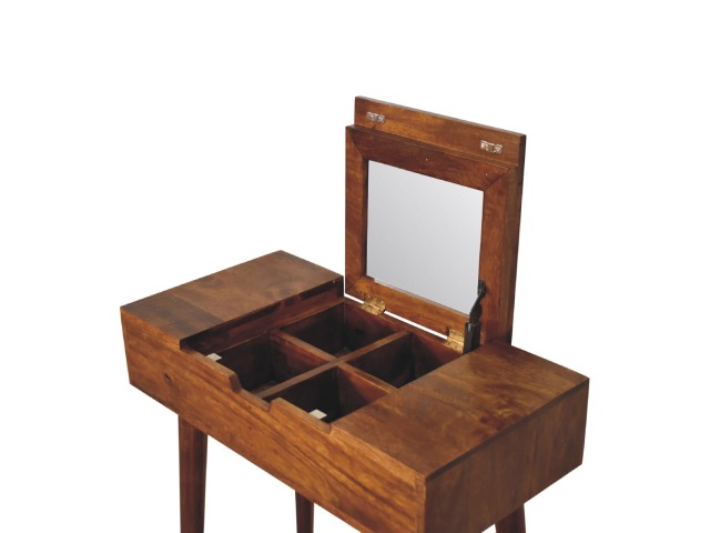 Add this beautiful dressing table to your home. Constructed from 100% solid mango wood in an chestnut finish with 1 drawer, it features a foldable mirror and storage compartments for storing any bits and pieces. Other product features - include Nordic-style legs and a cutout slot for easy access into the drawer. A lovely versatile piece that will complement any room beautifully. This petite product is part of Recession Collection.