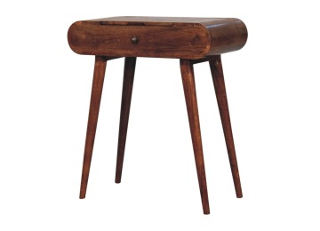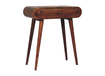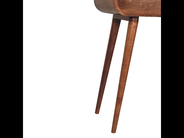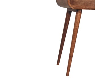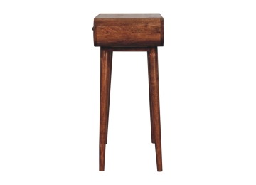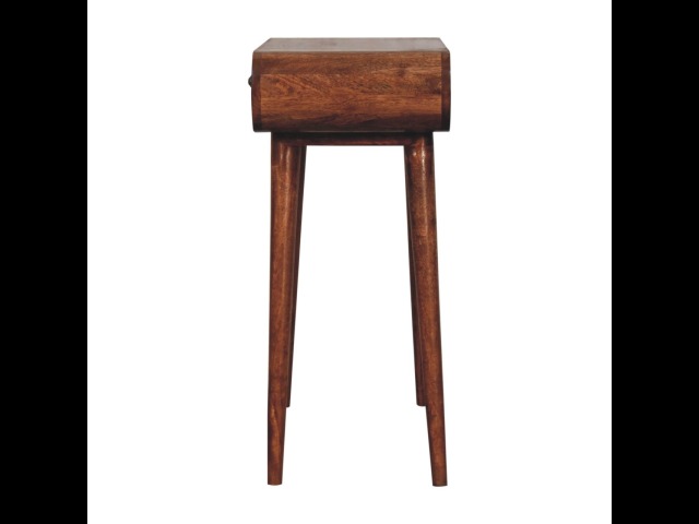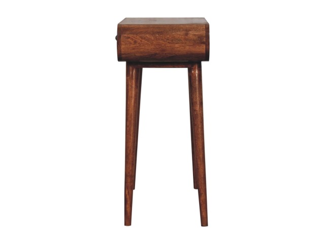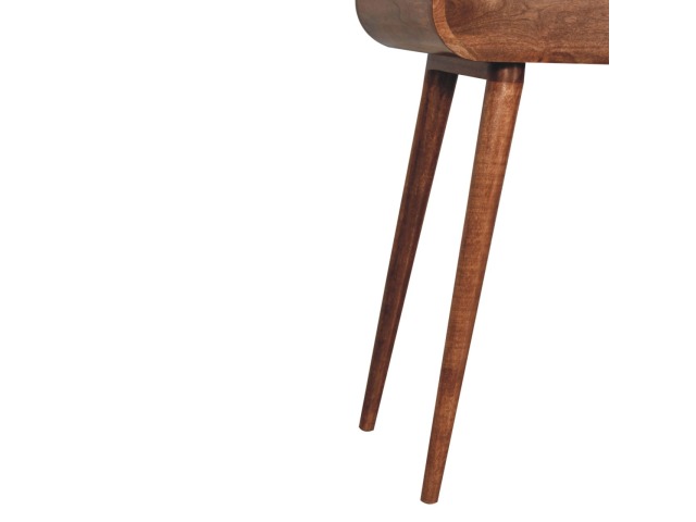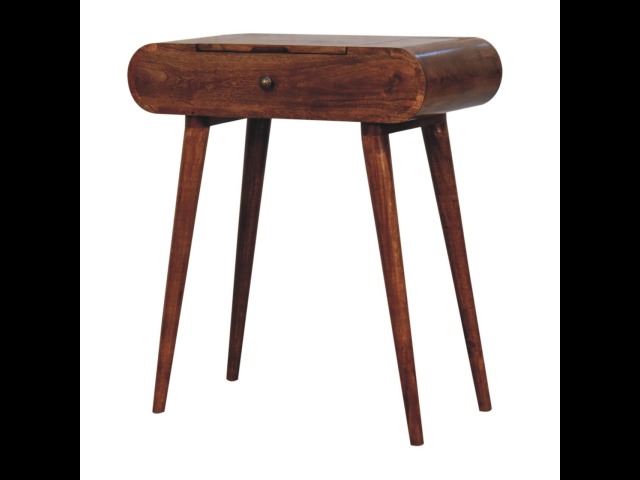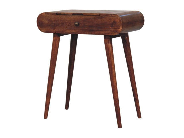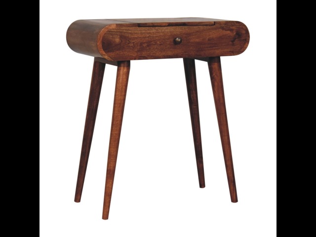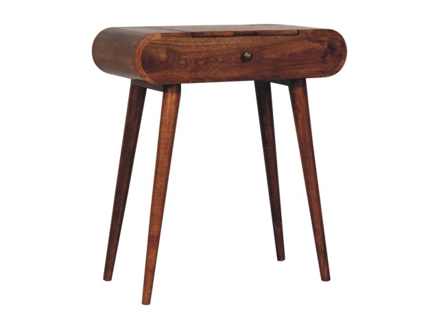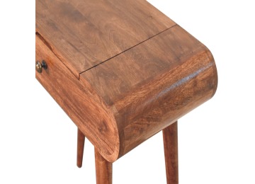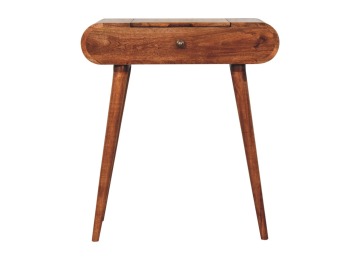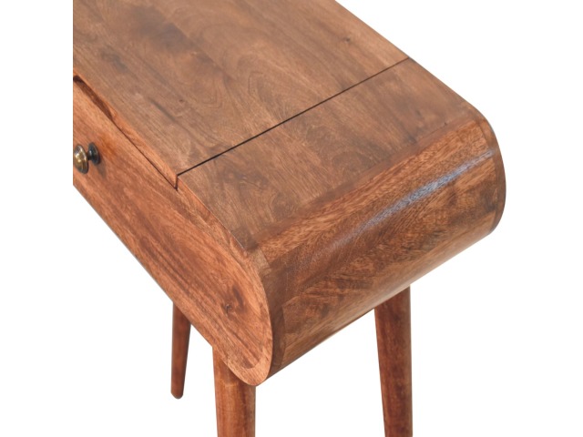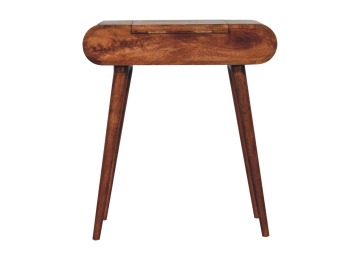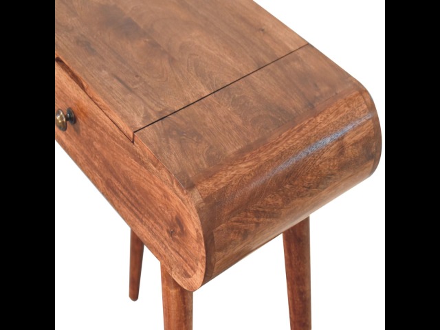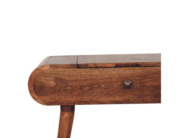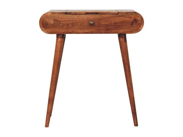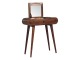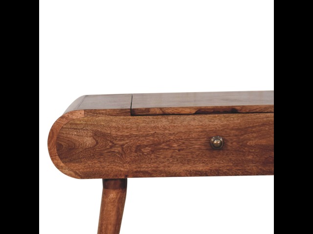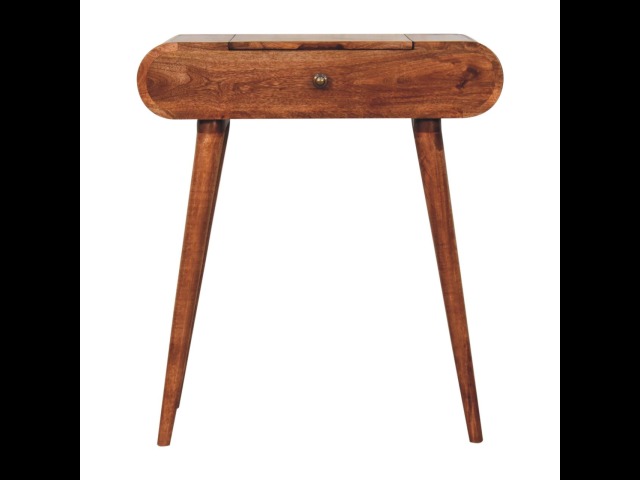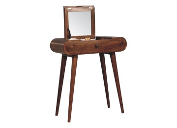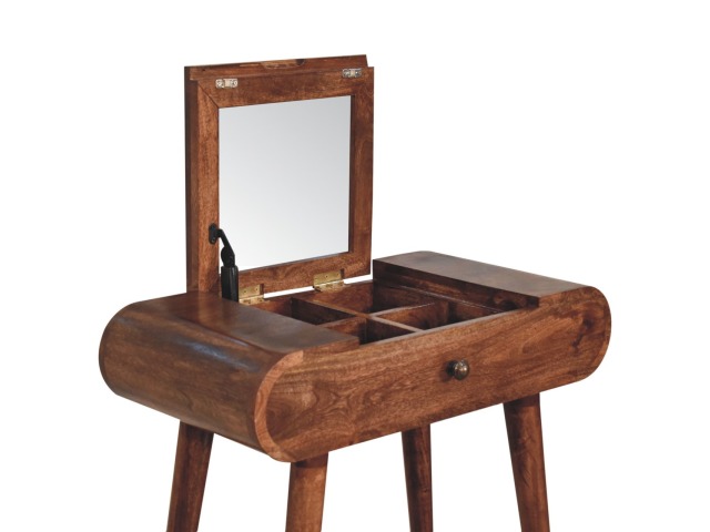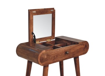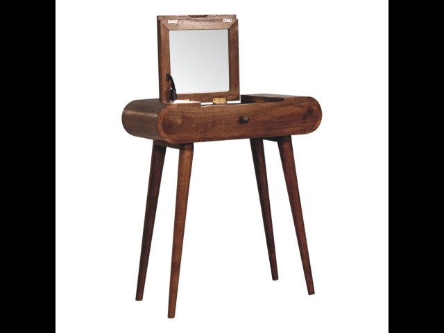 Add this mini dressing table to your bedroom. Constructed from 100% solid mango wood in an honey caramel finish with 1 drawer it features Nordic-style legs, a foldable mirror, and storage compartments for storing any bits and pieces such as jewelry and makeup. This is a lovely and versatile piece that will complement any room beautifully.
