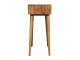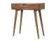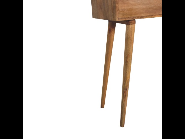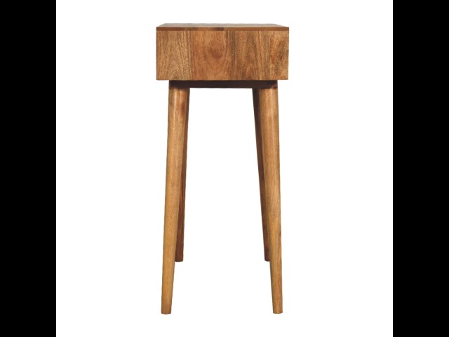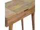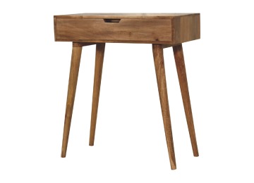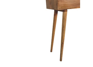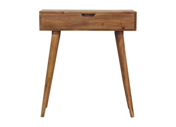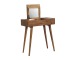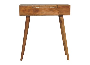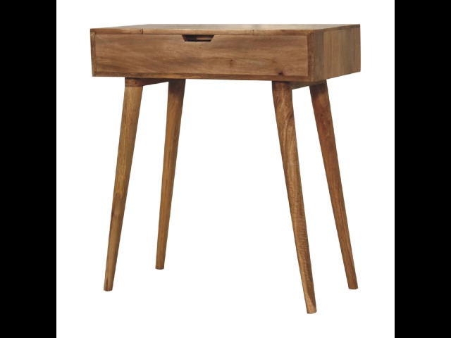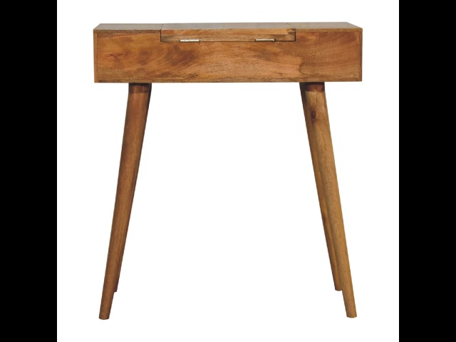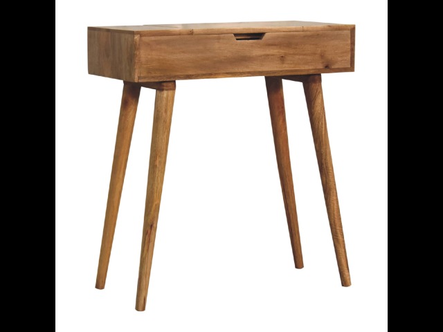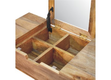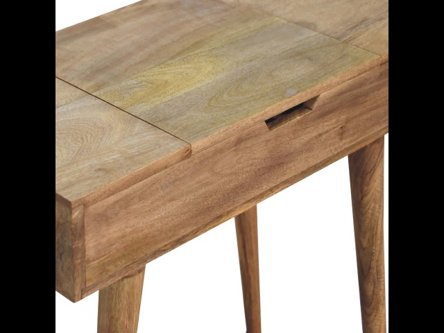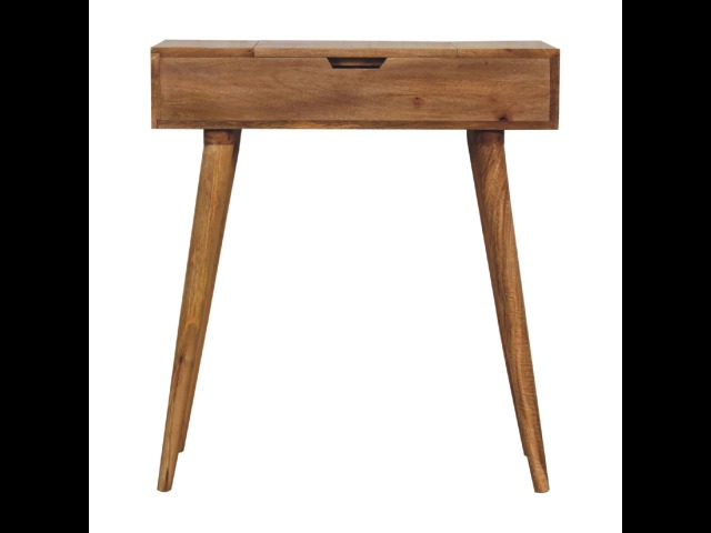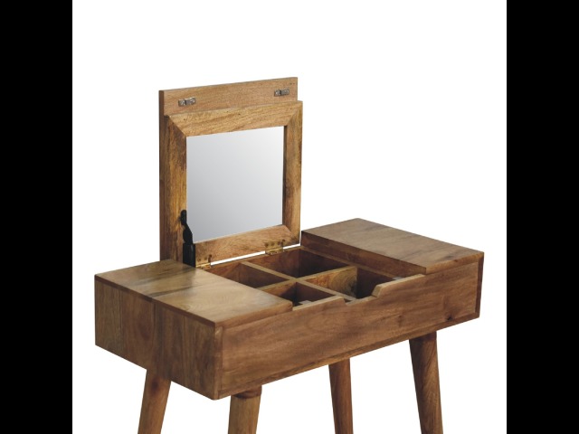 Add this beautiful dressing table to your home. Constructed from 100% solid mango wood in an Oak ish finish with drawer, it features a foldable mirror and storage compartments for storing any bits and pieces. Other product features - include Nordic-style legs and a cutout slot for easy access into the drawer. A lovely versatile piece that will complement any room beautifully. This petite product is part of Recession Collection.