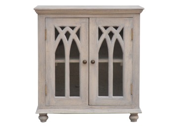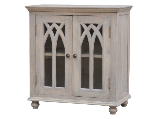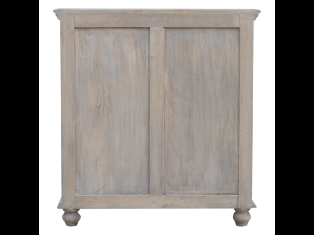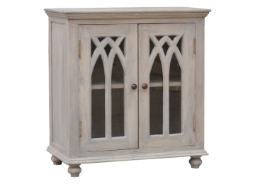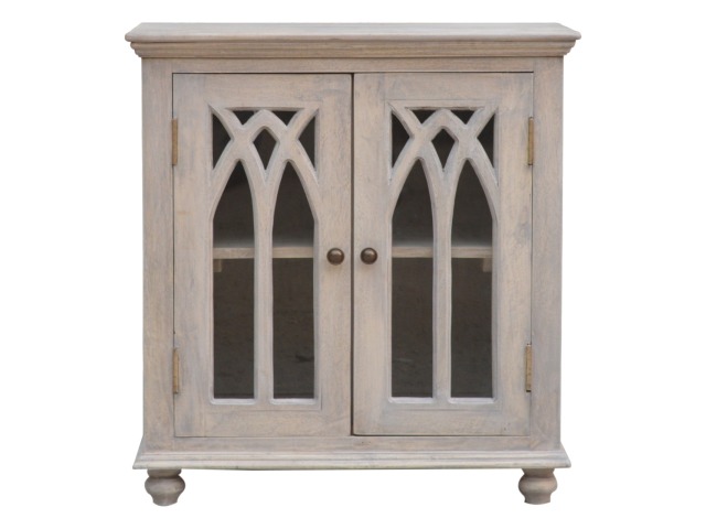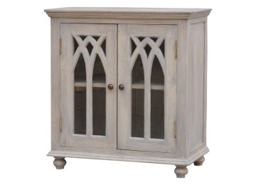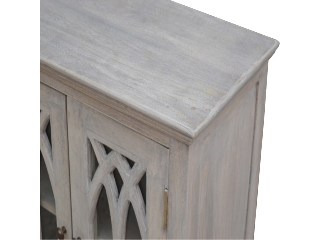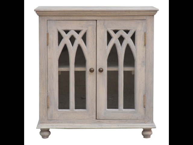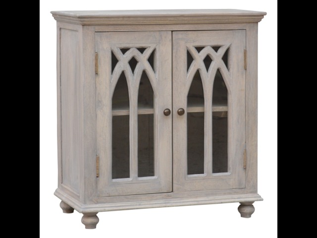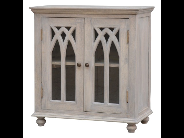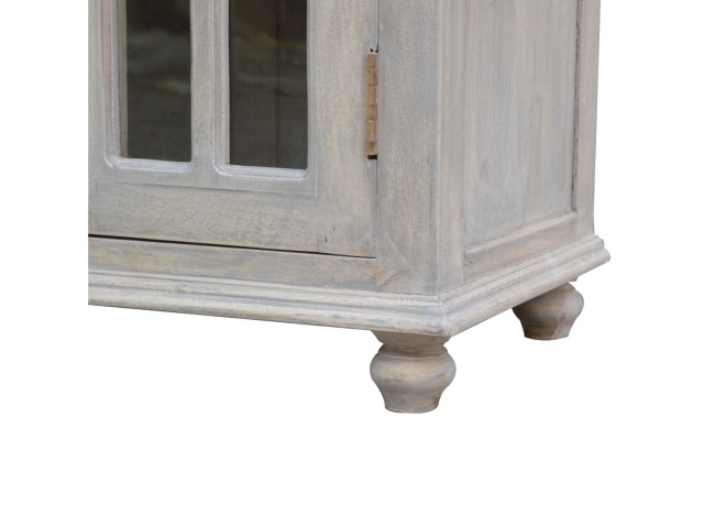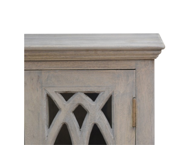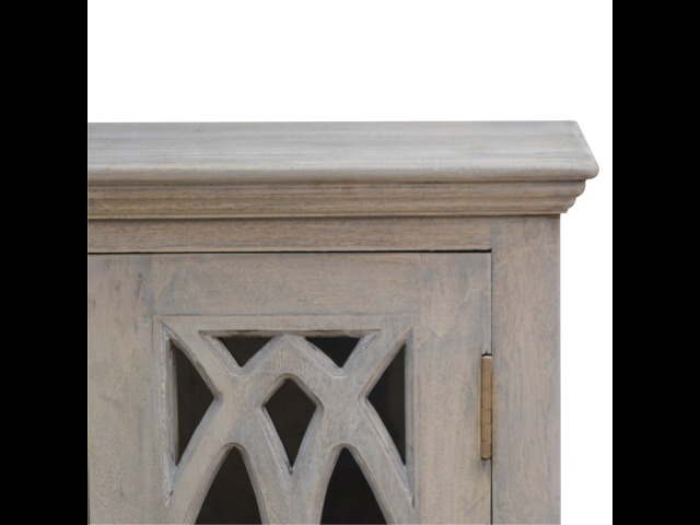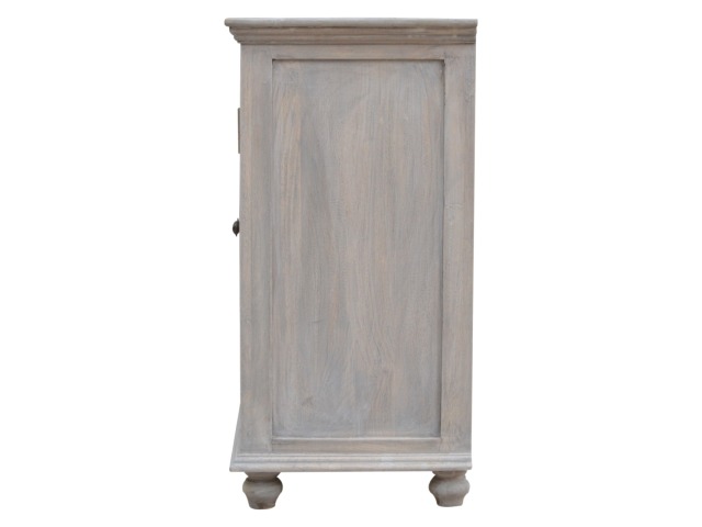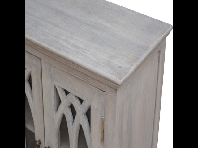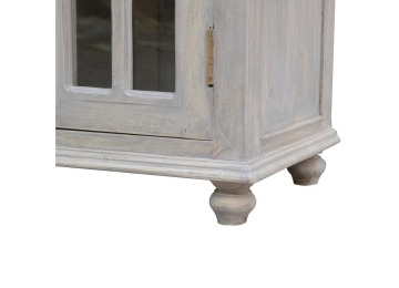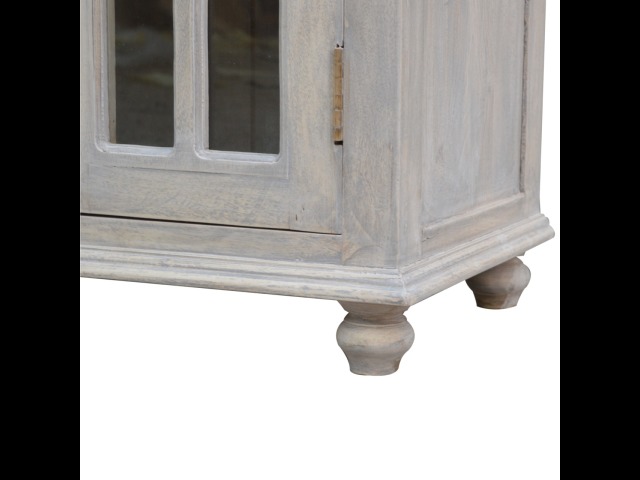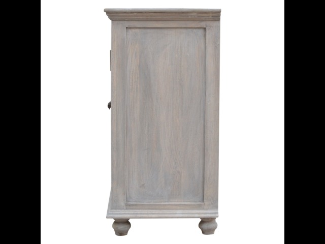 This sideboard is made from 100% solid mango wood and has smooth acid wash stone finish. This product offers excellent storage space with 2 drawers and 2 glazed door cabinets which have a solid wood pattern, and a decent size top to place pictures and special ornaments etc. Other features include 4 bun feet, round knob handles made from brass metal and a thick top. Add this stunning sideboard to your home.