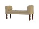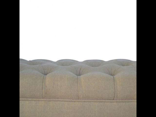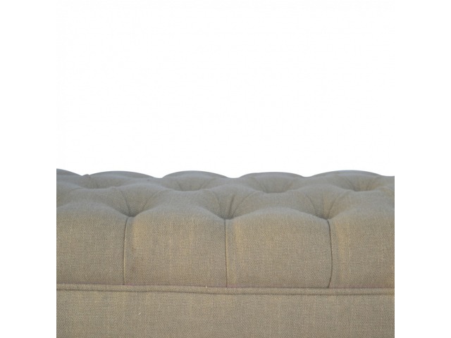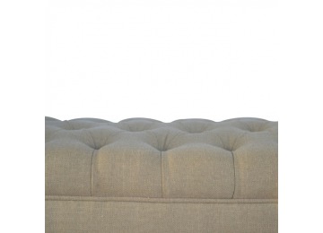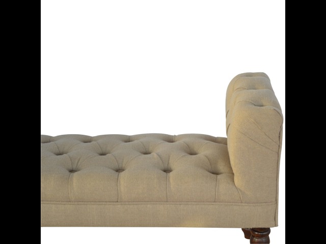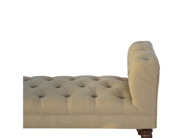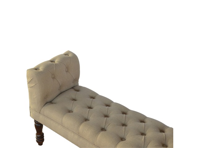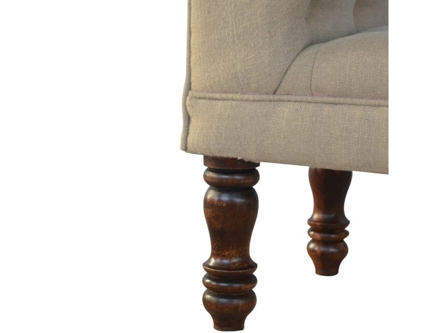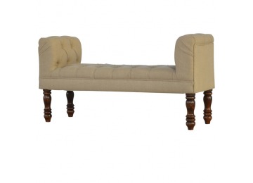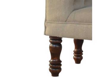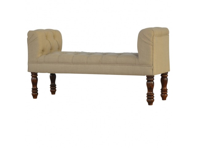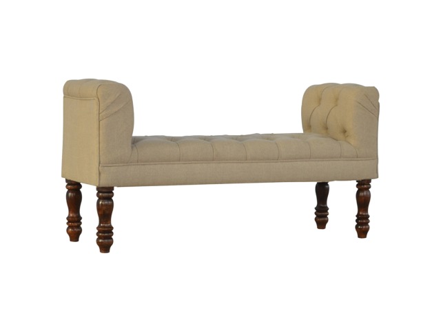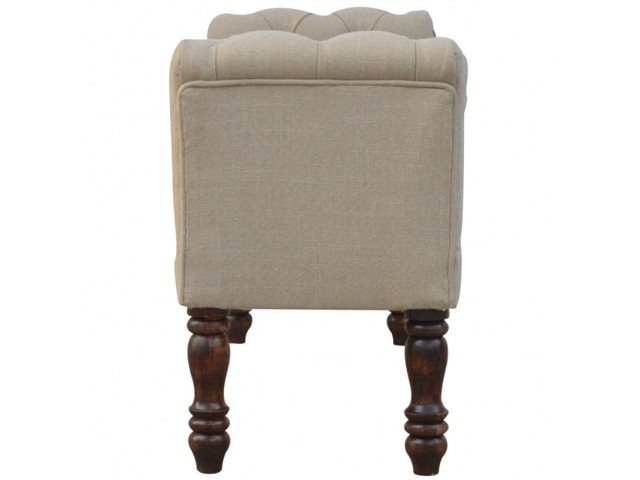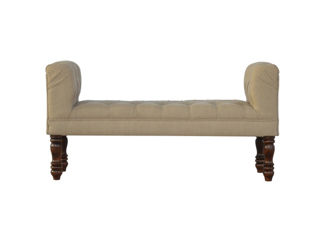 Update your home decor with this lovely mud linen upholstered bench constructed from 100% solid mango wood. It is the perfect piece of furniture for a bedroom or living area, and this bench is ideal for extra seating. Other features include hand turned legs that have a fine light walnut finish, deep buttoned upholstered top and sheltering arms.