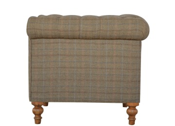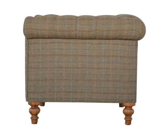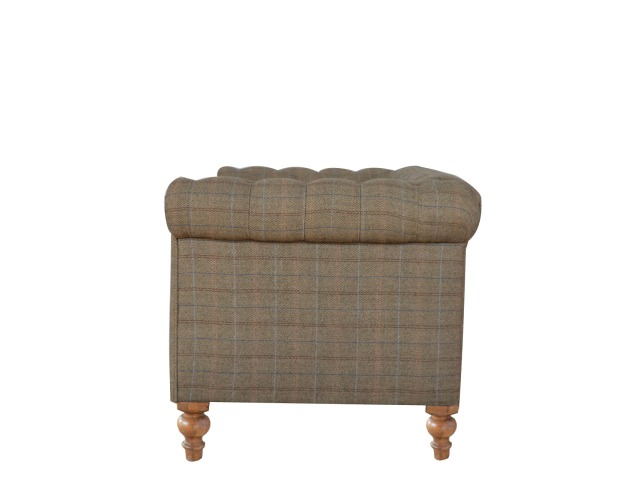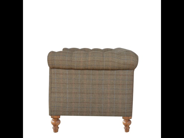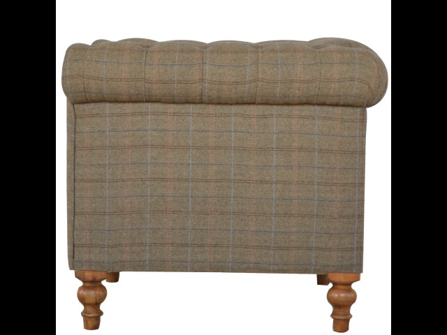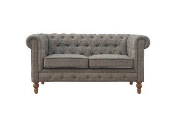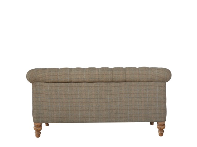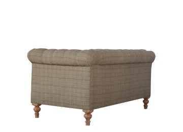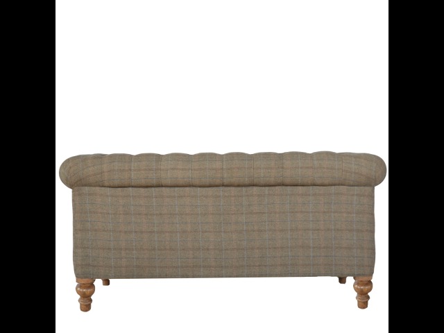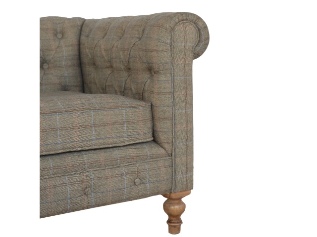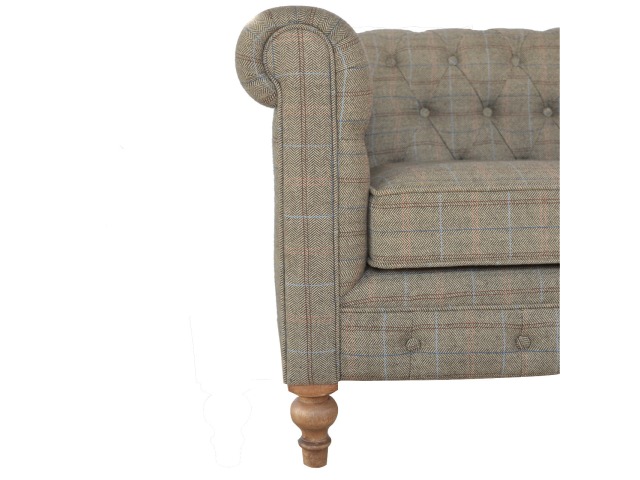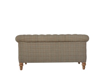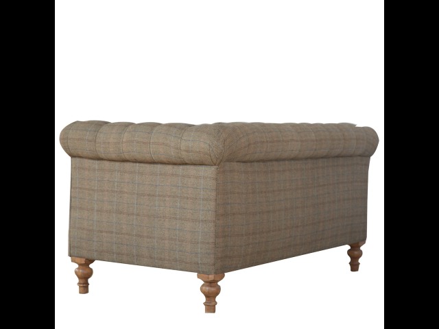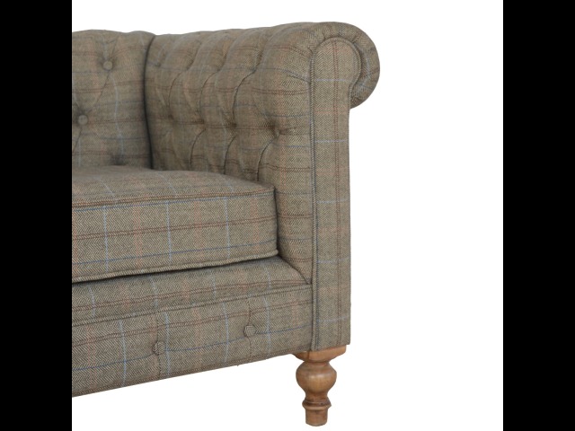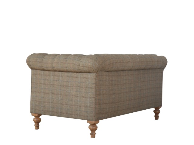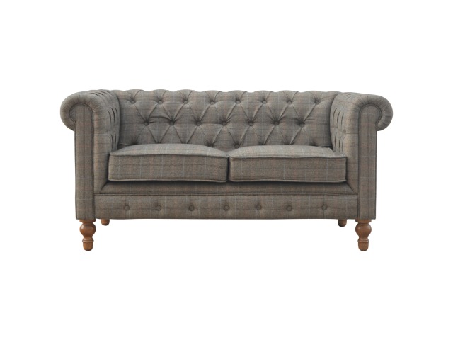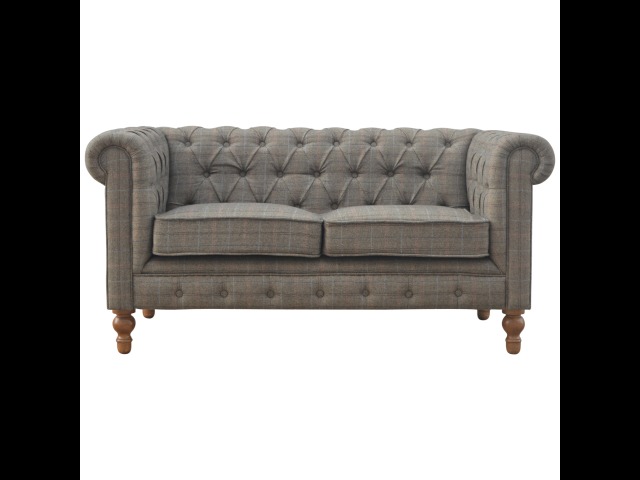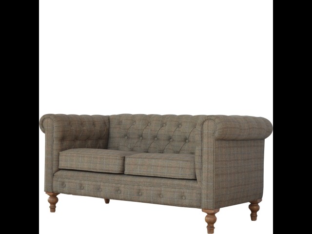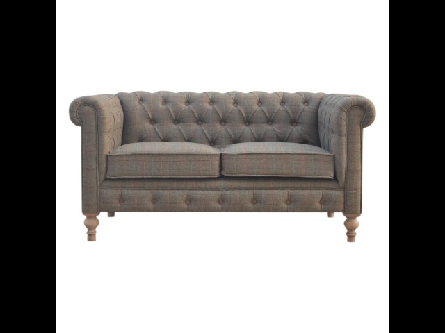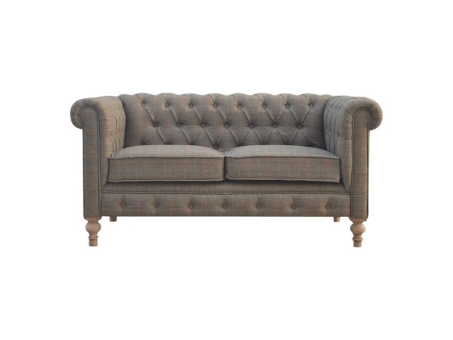 This Chesterfield 2 Seater Sofa is fully upholstered in multi tweed and is constructed from 100% solid mango wood. This 2 seater sofa is detailed with deep button tufts, piping and sheltering arms. This country tweed sofa also features hand turned legs with a fine natural bleach finish. You may encounter variations from batch to batch hence if you are looking to pair products under similar room settings; you can opt for a bespoke order or take an informed decision about the possible variations. Product to be delivered on the pallet as a pavement/kerbside delivery. Customer needs to dispose off or use it if they wish to. For possible returns, we would require the original pallet alongside full packaging as part of returns policy.