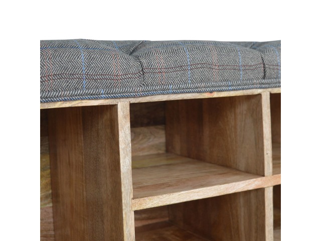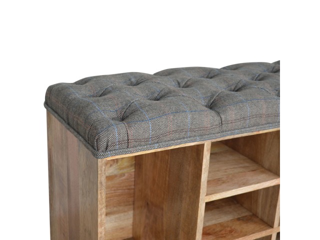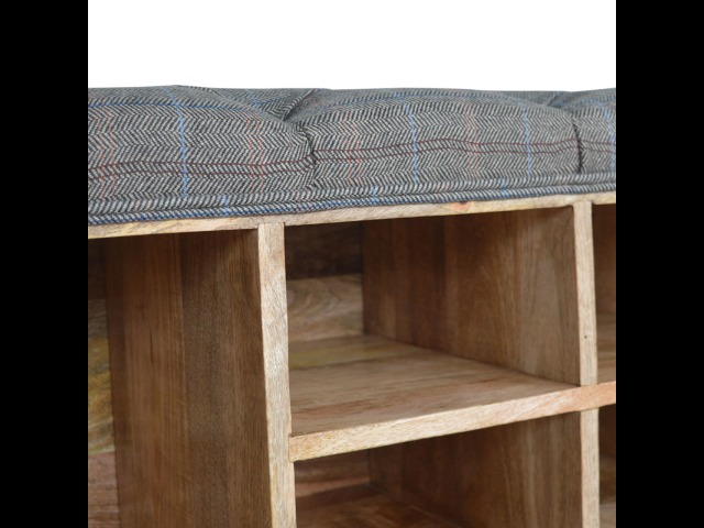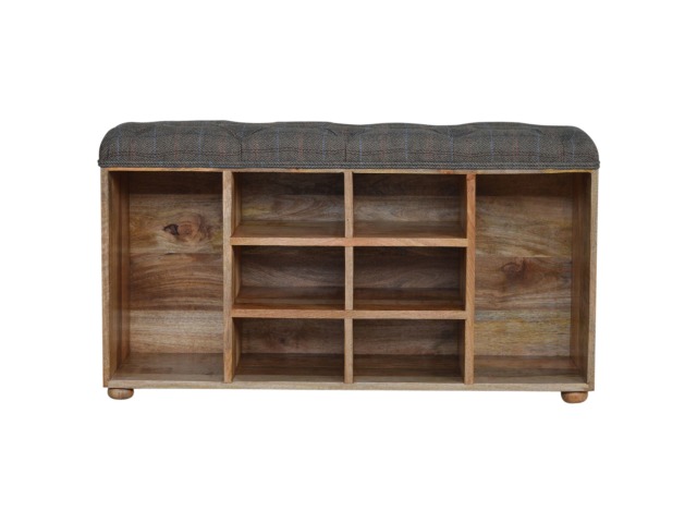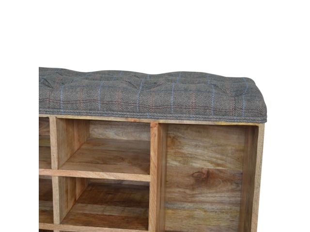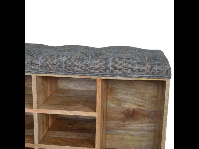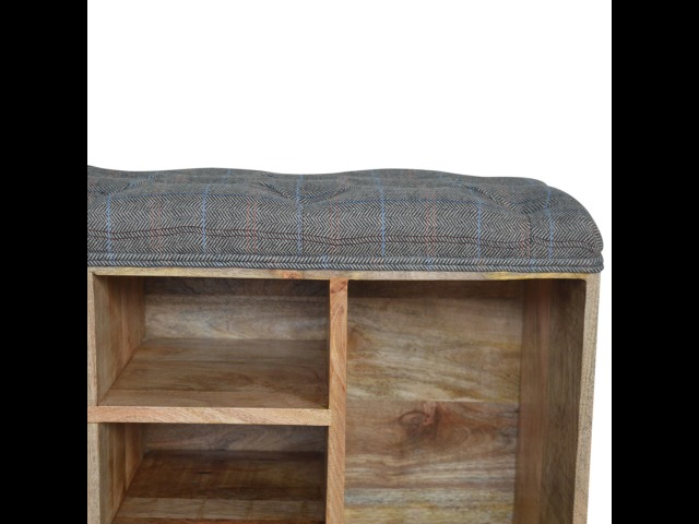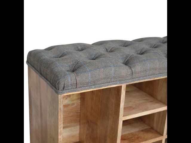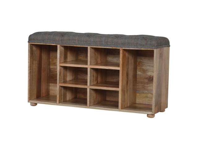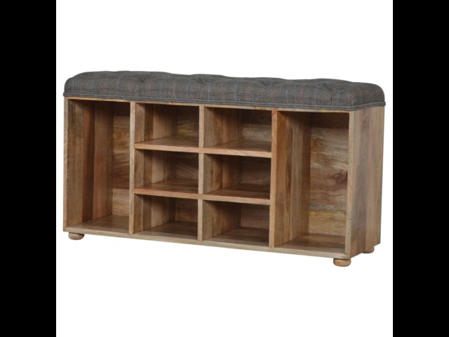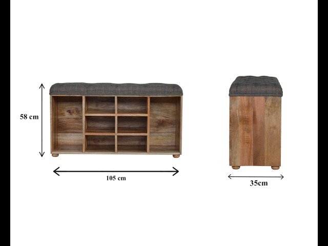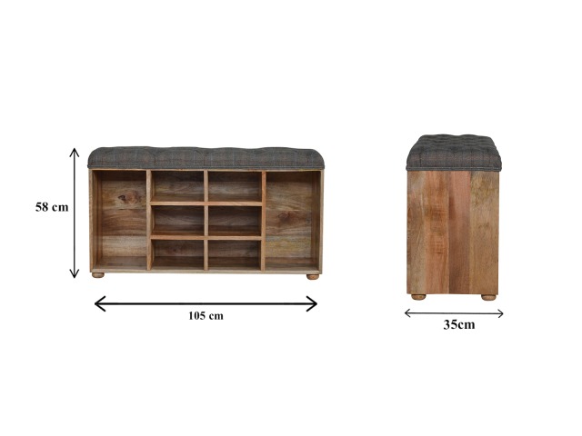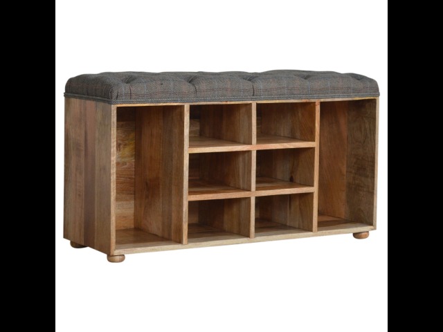 Smart, stylish, and built for daily convenience, this shoe storage bench is handcrafted from 100% Solid Mango Wood in a oak-ish finish and topped with a classic hand-tufted tweed cushion seat for added comfort. Designed with multiple open cubbies, it offers ample space to neatly organize shoes, boots, or accessories—perfect for entryways, mudrooms, or dressing areas. The soft-cushioned seat provides a cozy spot for slipping shoes on or off, while the sturdy wooden frame ensures long-lasting durability. A blend of traditional tailoring and practical design, this bench brings both charm and function to your everyday routine.
