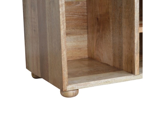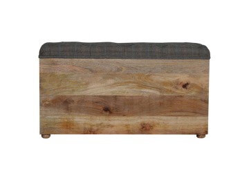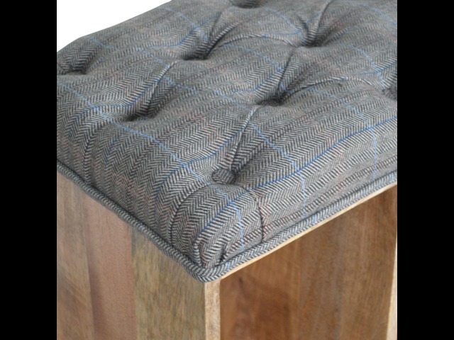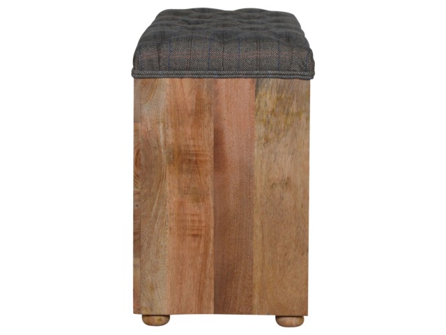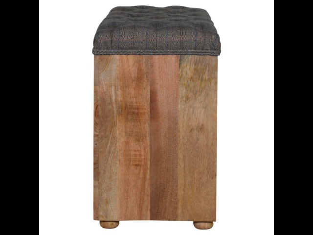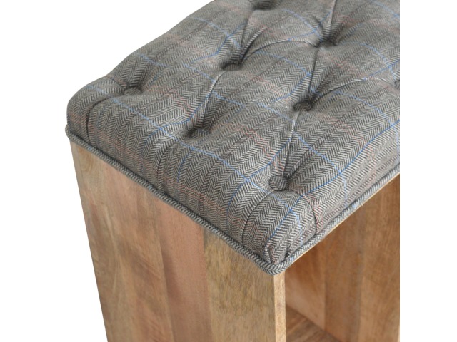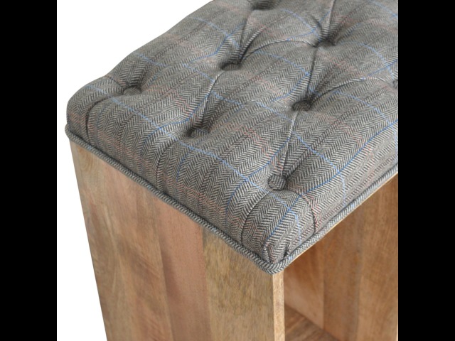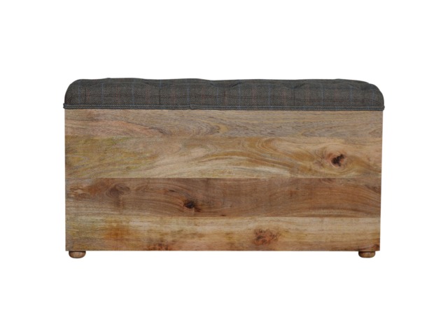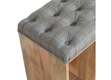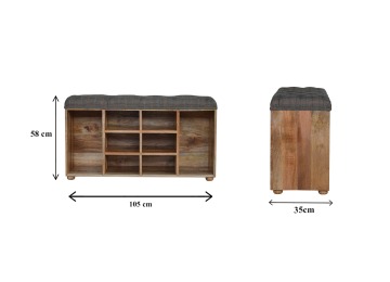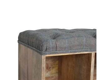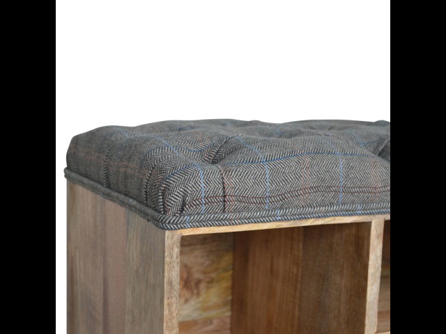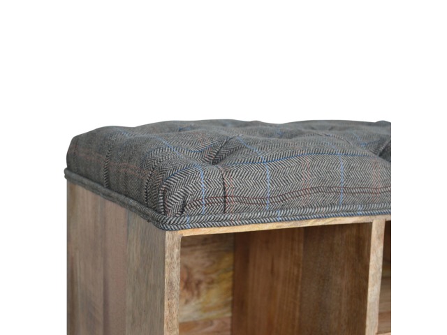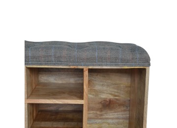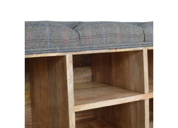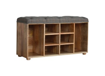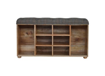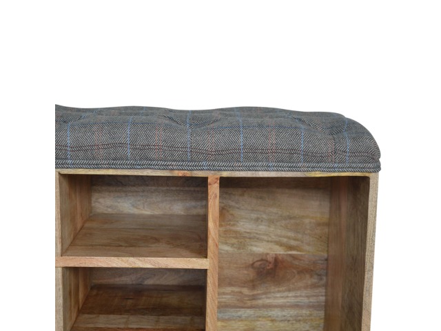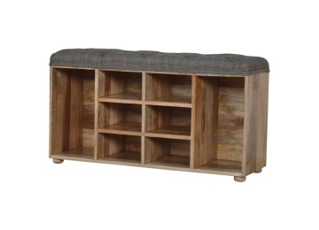 Smart, stylish, and built for daily convenience, this shoe storage bench is handcrafted from 100% Solid Mango Wood in a oak-ish finish and topped with a classic hand-tufted tweed cushion seat for added comfort. Designed with multiple open cubbies, it offers ample space to neatly organize shoes, boots, or accessories—perfect for entryways, mudrooms, or dressing areas. The soft-cushioned seat provides a cozy spot for slipping shoes on or off, while the sturdy wooden frame ensures long-lasting durability. A blend of traditional tailoring and practical design, this bench brings both charm and function to your everyday routine.