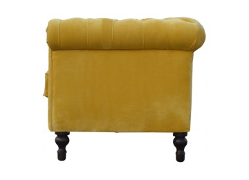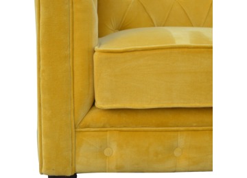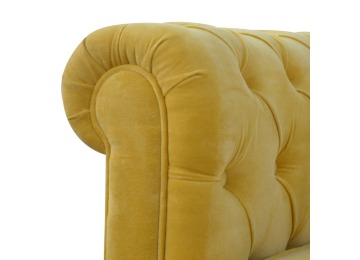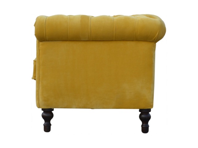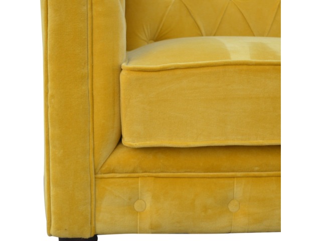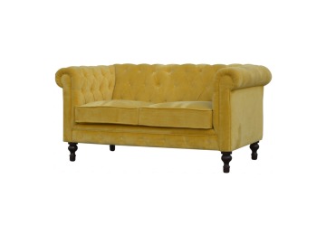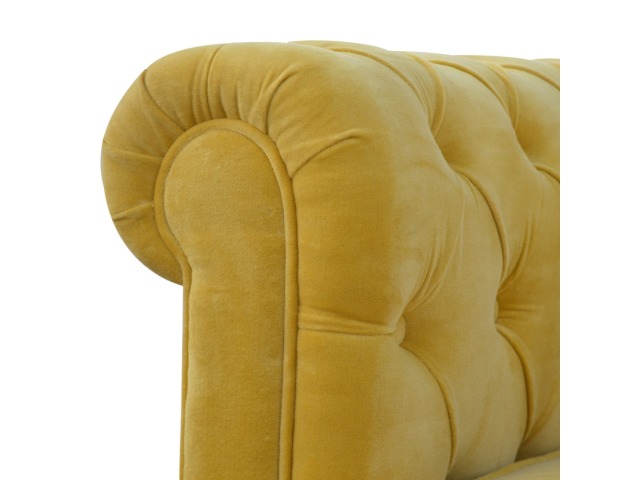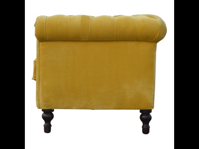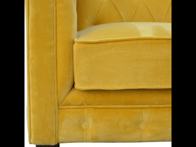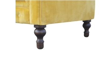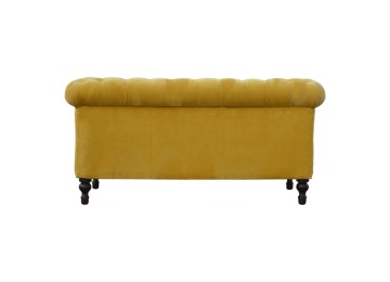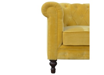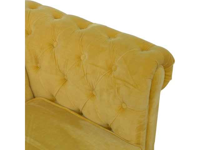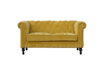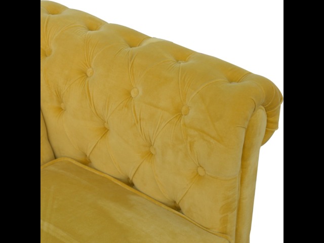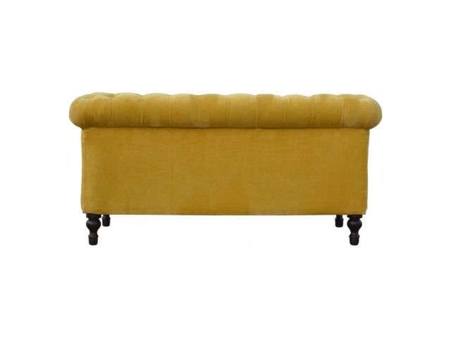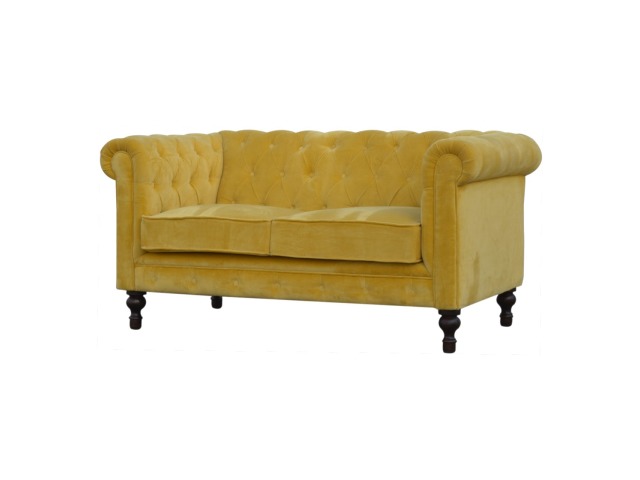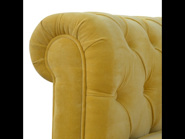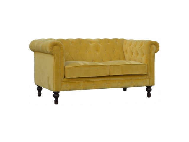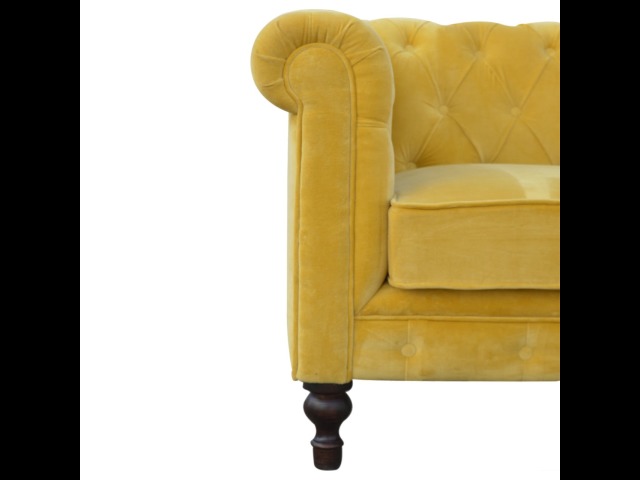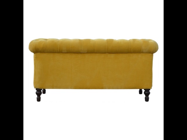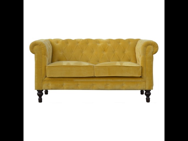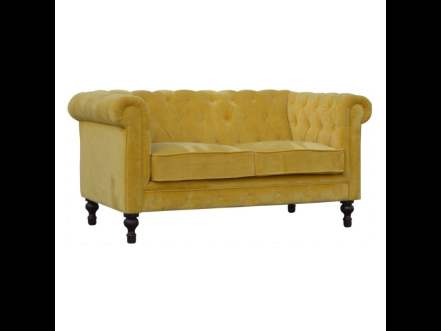 This beautiful 2 Seater Chesterfield Sofa has been upholstered in a luxurious mustard yellow cotton velvet and features 4 turned feet constructed from 100% solid mango wood in a walnut finish. This sofa is detailed with deep button tufts, piping and sheltering arms. This is a statement piece for the home which can be added as a pop of colour to any room in the home or can be suited well with many different styles and colours of interiors being modern or classic. Product to be delivered on the pallet as a pavement/kerbside delivery. Customer needs to dispose off or use it if they wish to. For possible returns, we would require the original pallet alongside full packaging as part of returns policy.