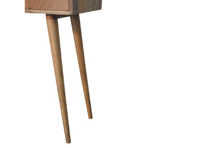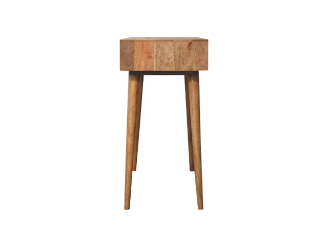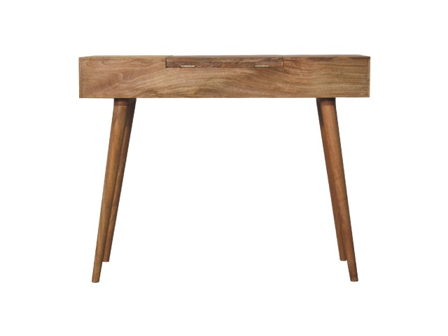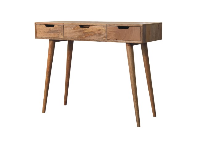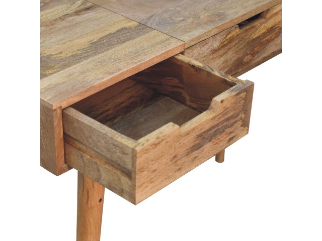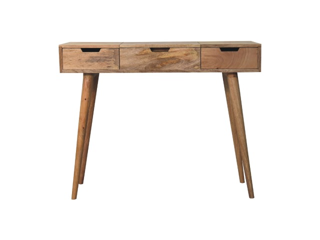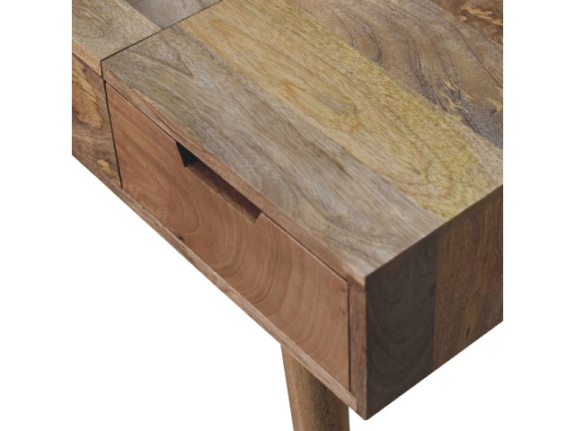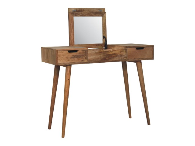 Add this beautiful dressing table to your home. Constructed from 100% solid mango wood in an oak-ish finish with 3 spacious drawers, it features a foldable mirror and storage compartments for storing any bits and pieces. Other product features - include Nordic style legs and cut-out slots for easy access to and from the drawers. A lovely versatile piece that will complement any room beautifully.
