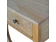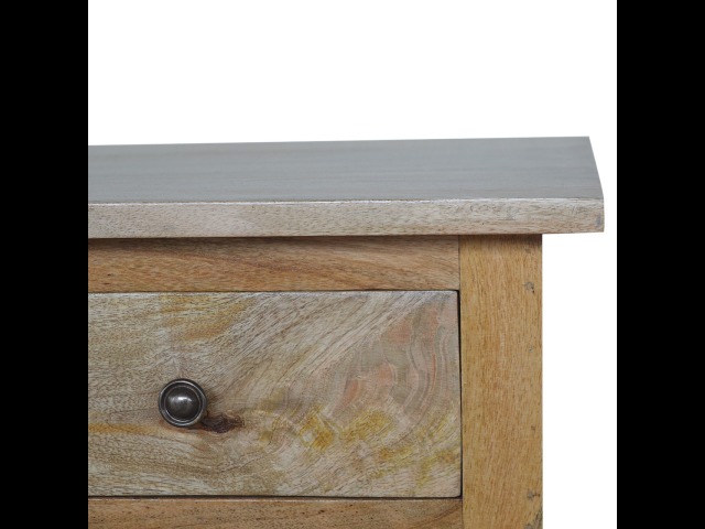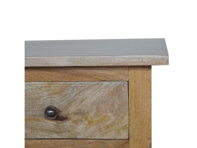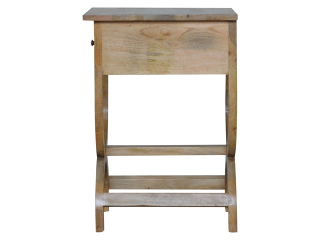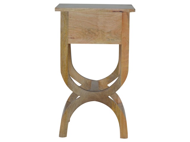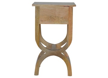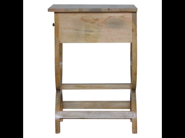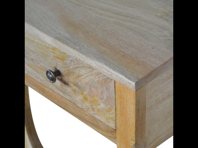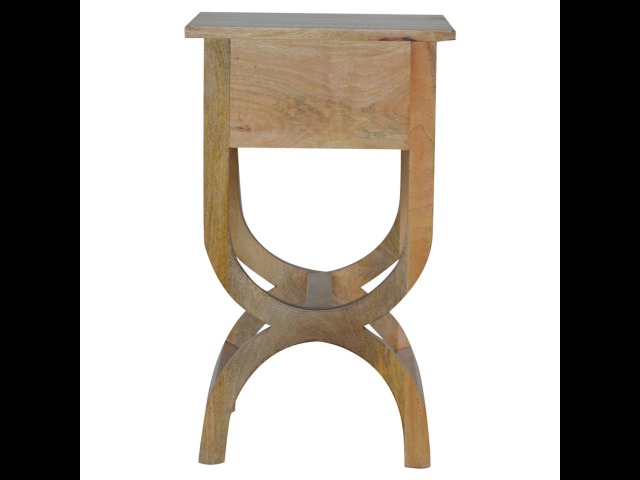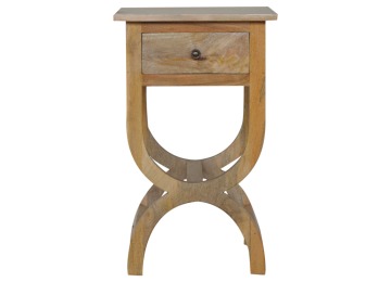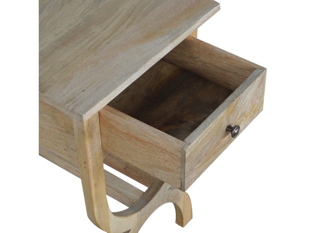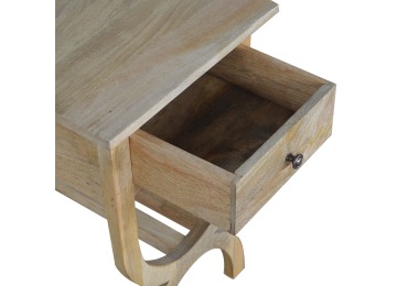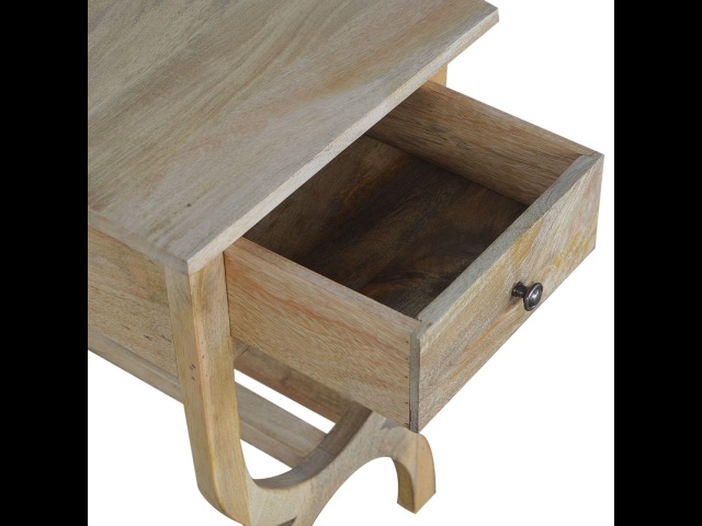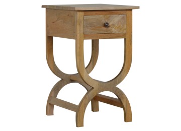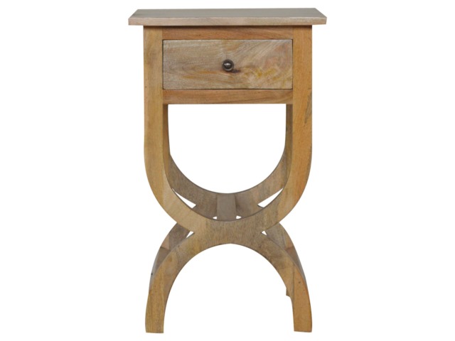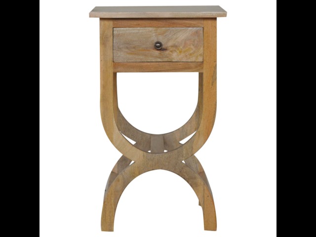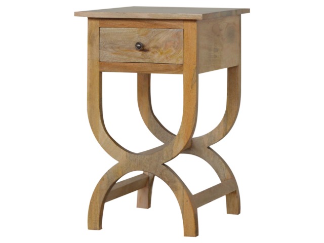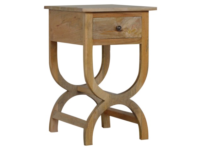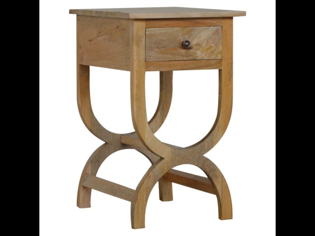 This bedside or end table has been constructed from 100% solid mango wood in an oak-ish finish. Some features of this include classic serpentine feet with a strong undercarriage support which give extra character to the piece. It has one handy drawer which has a shiny knob and is the perfect addition to any bedroom and home.