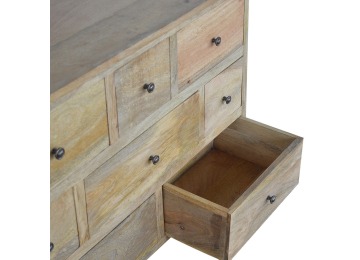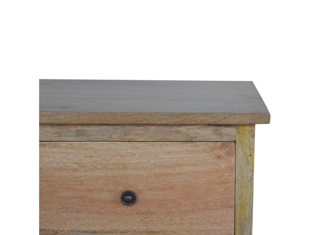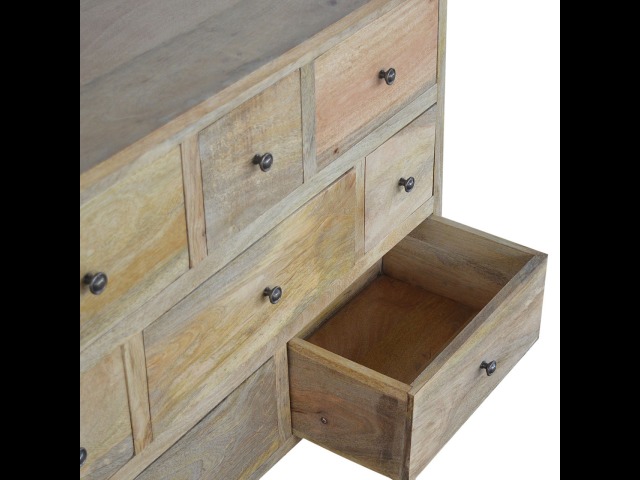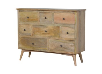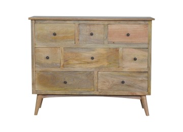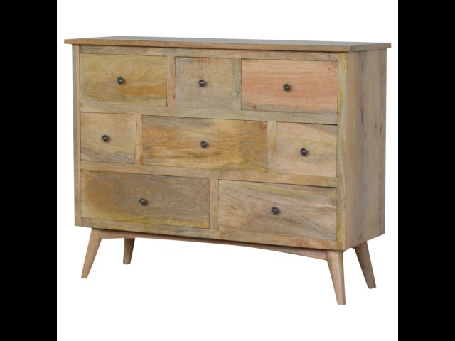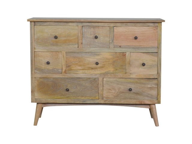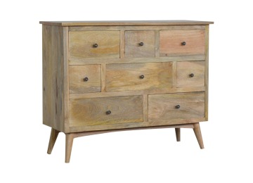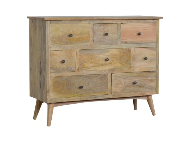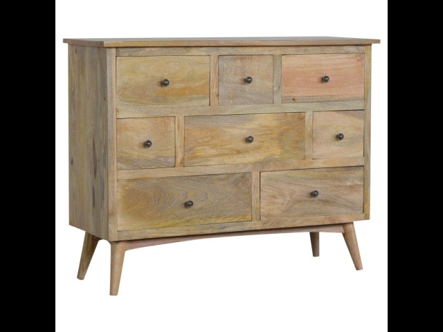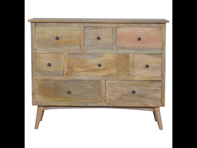 This Nordic wood style chest of drawers is hand finished which gives a truly rustic and romantic feel. It is an essential piece of household furniture, giving you space to store clothing as well as providing a surface for all your bits and pieces. It has features such as shiny knobs for all 8 drawers, made from 100% solid mango wood with a fine oak-ish finish. Add this perfect multiple chest of drawers to your home.
