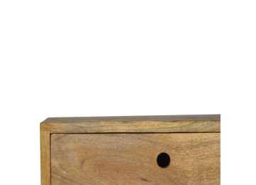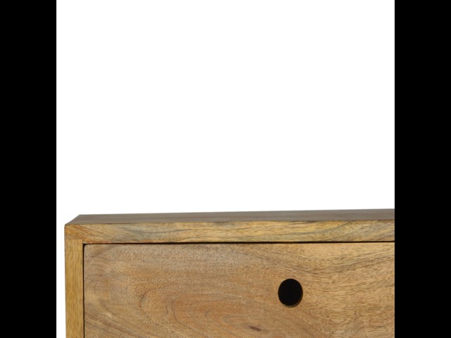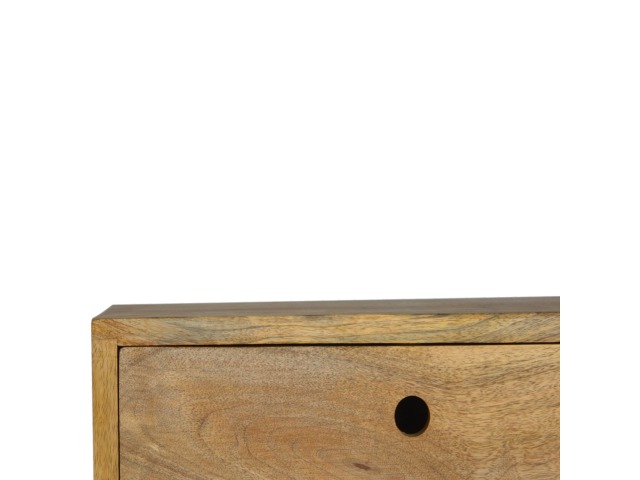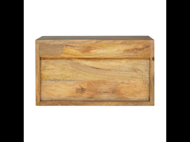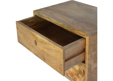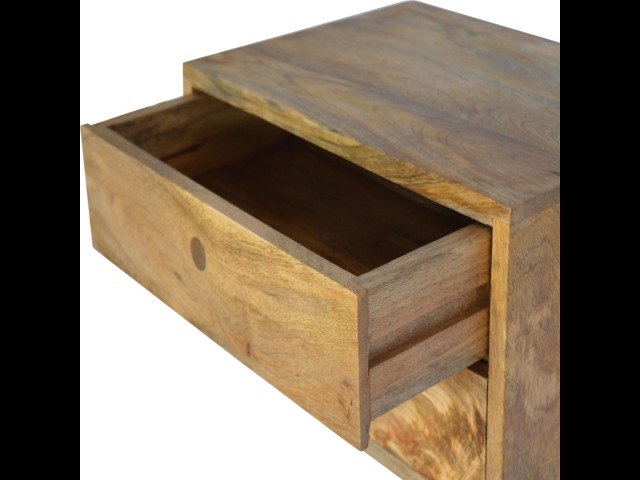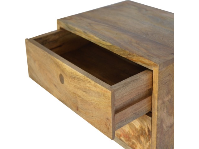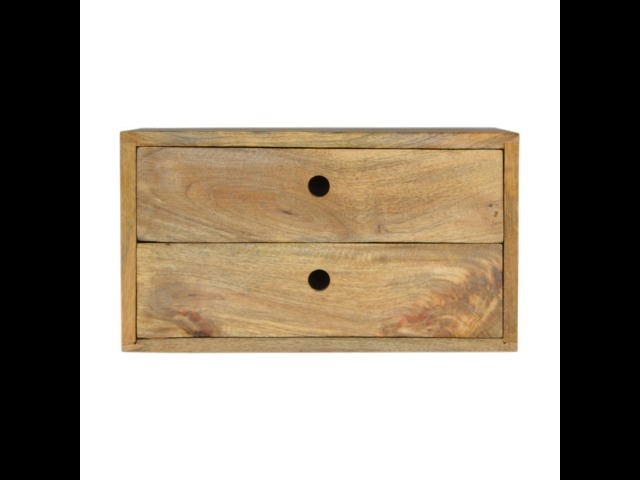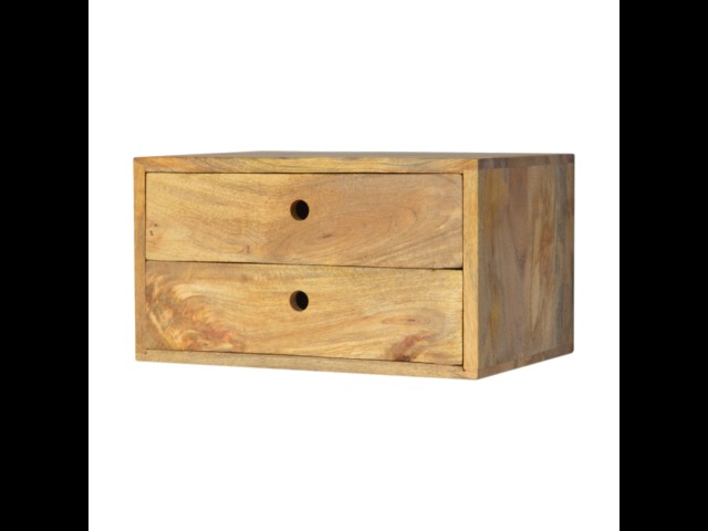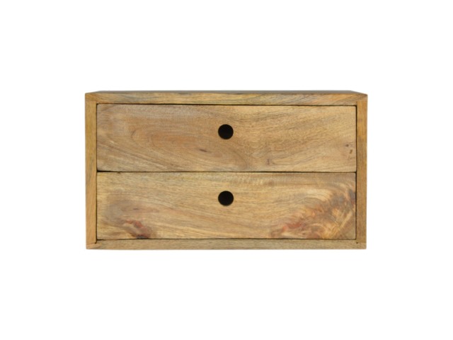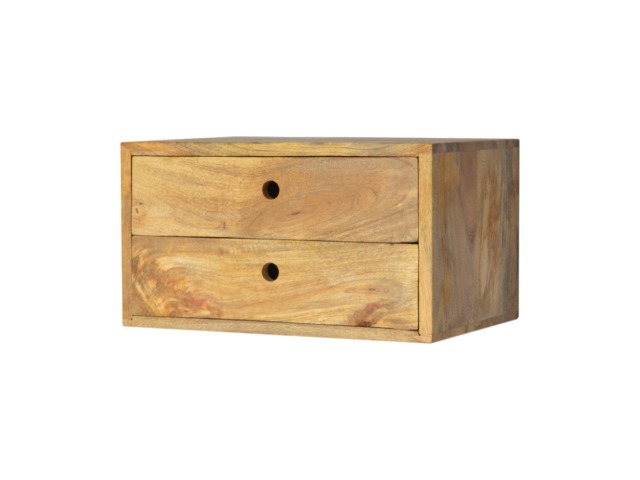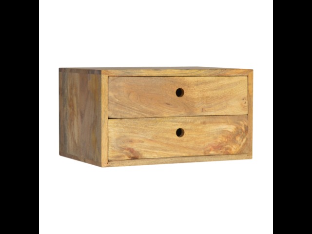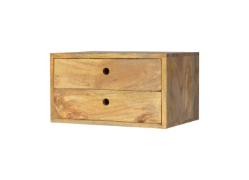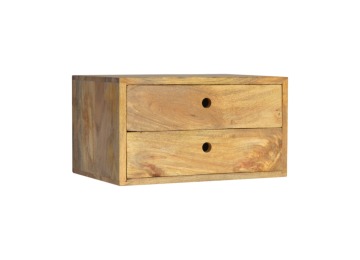This minimalistic wall mounted unit has been constructed from 100% solid mango wood and features 2 drawers for storing any bits and pieces you wish to keep close by before bedtime. It's neat and clean design can easily be mounted on the wall without the fuss of any legs.