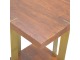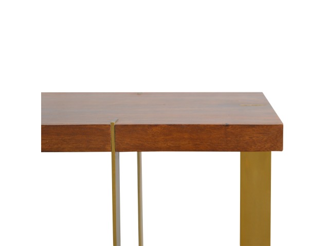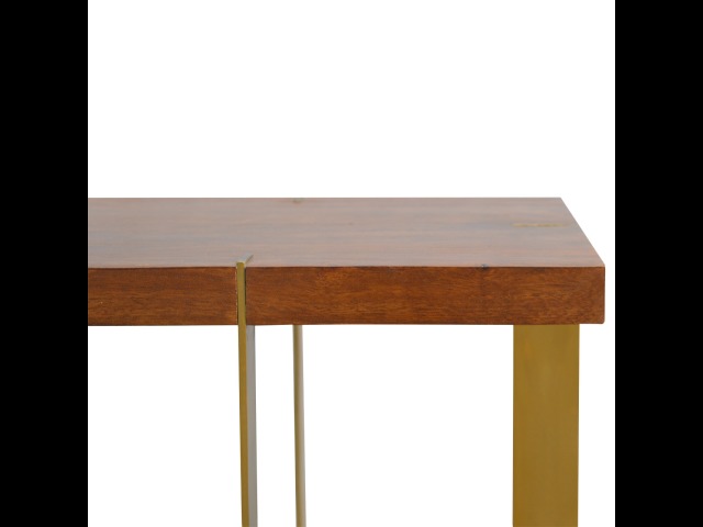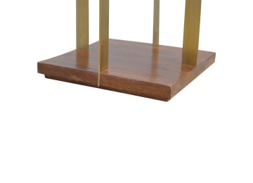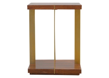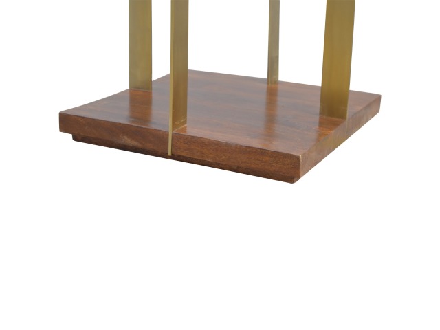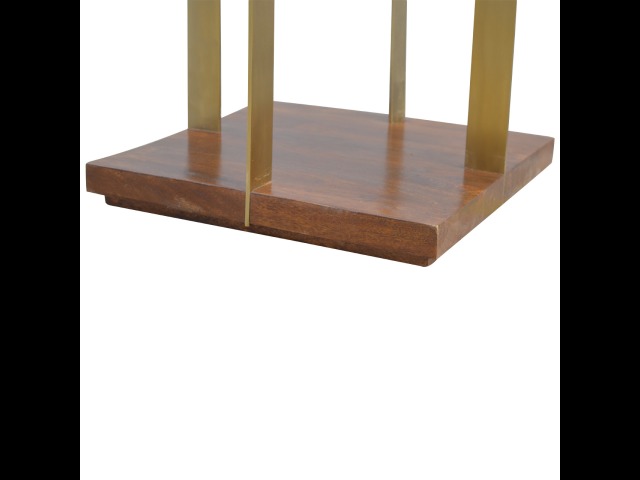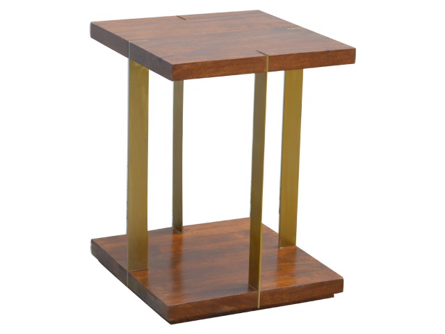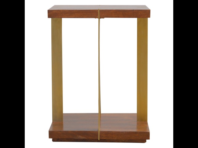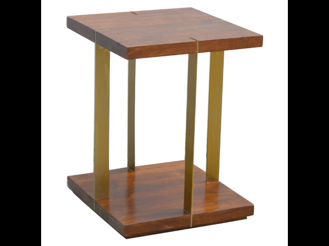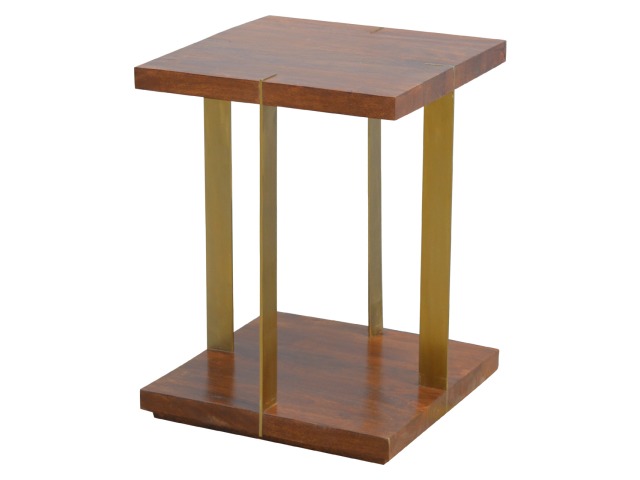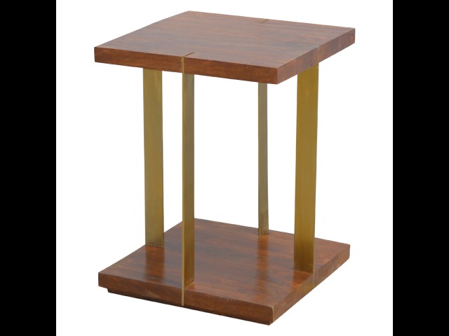 This end table has been constructed from 100% solid mango wood and finished in a chestnut finish and features a golden base with 4 gold panels which holds the 2 sqaure chunky bases together, it features space for placing any bits and pieces in between and has ample space for any photo frames, vases or small belongings you wish to keep close by your side.