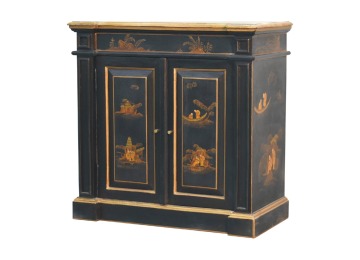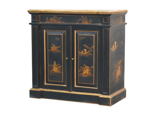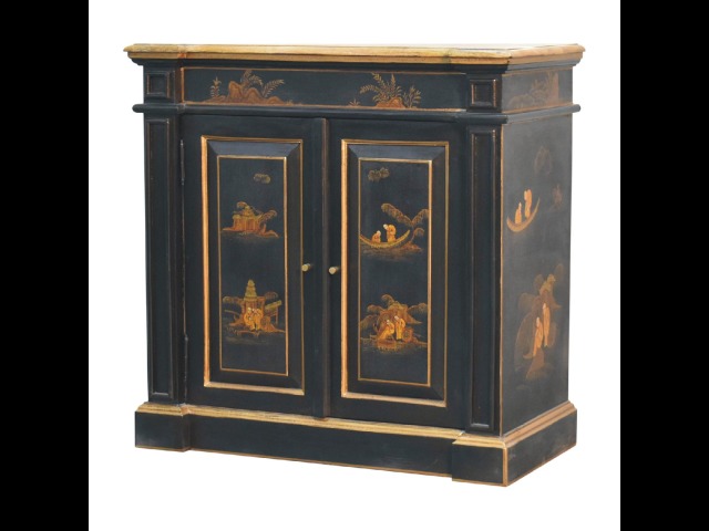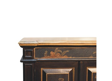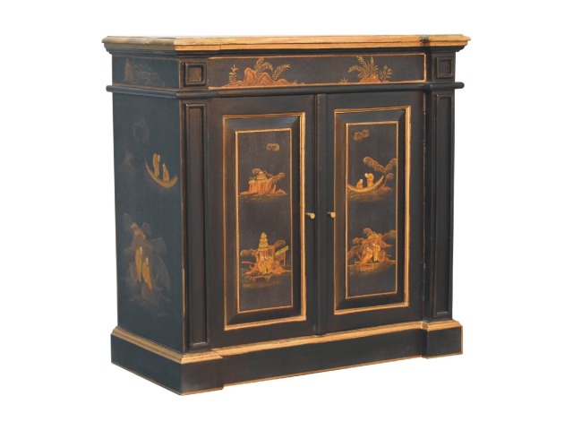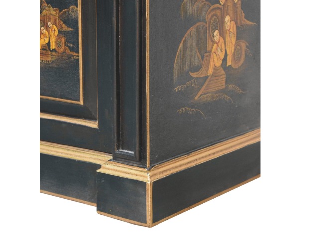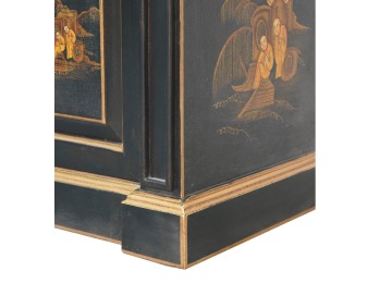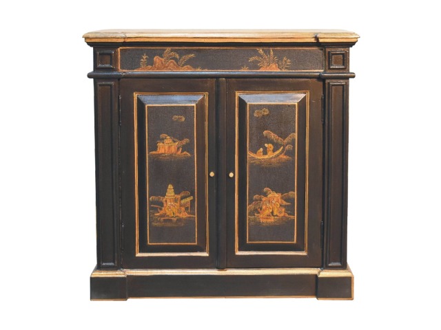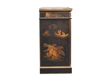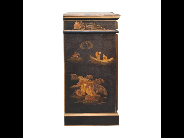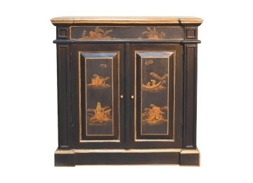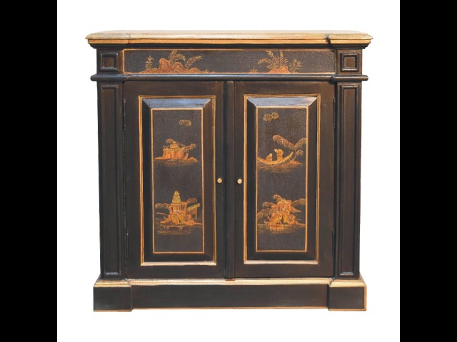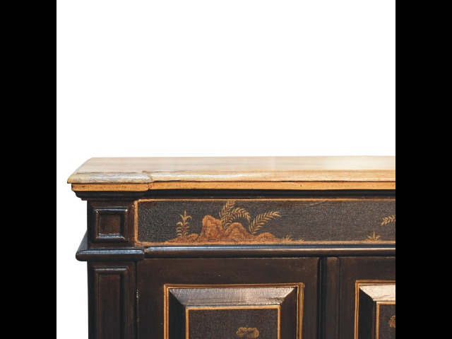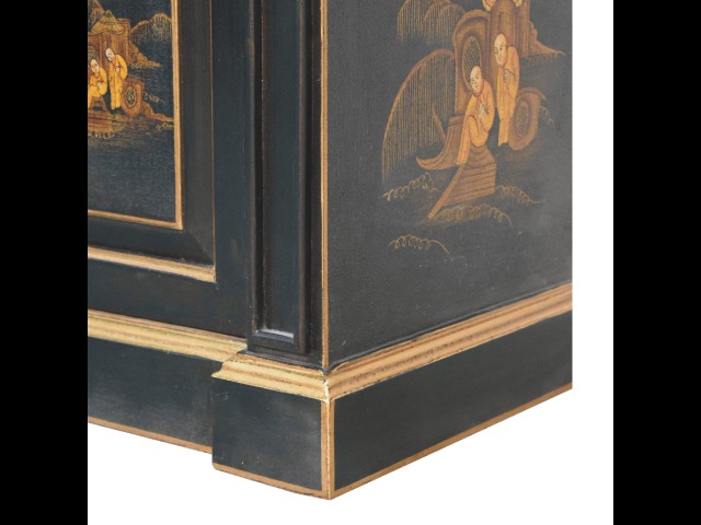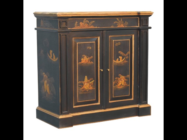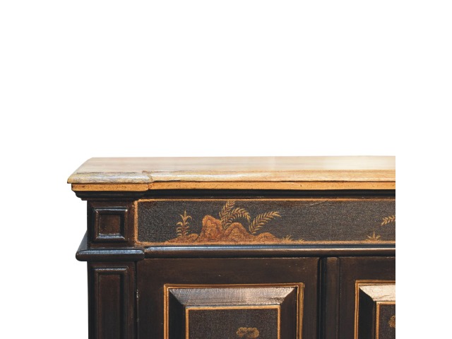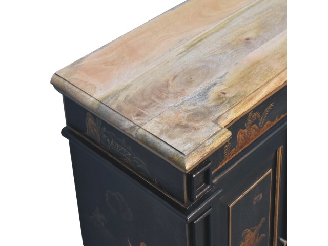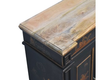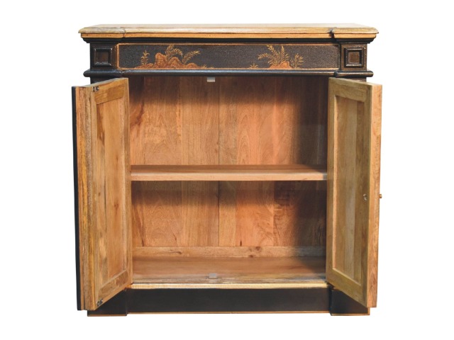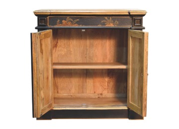 Embrace the essence of Peking art with the Oriental Elegance Wine Cabinet. Crafted from solid mango wood, this table features a hand-painted black base adorned with hand-sketched oriental characters, each telling a unique story. The design is highlighted by a plinth bottom, adding an elegant flow. A shiny brass knob complements the piece, ensuring functionality meets style.