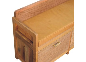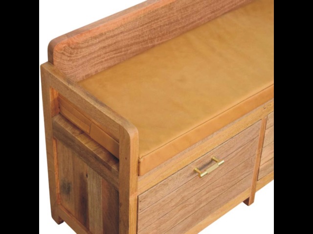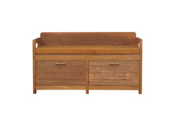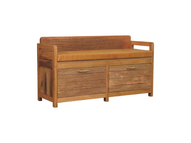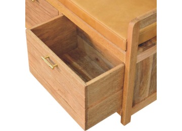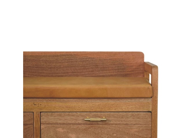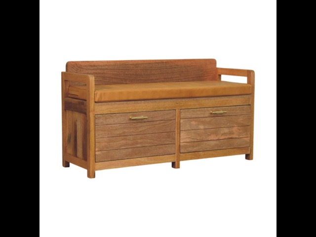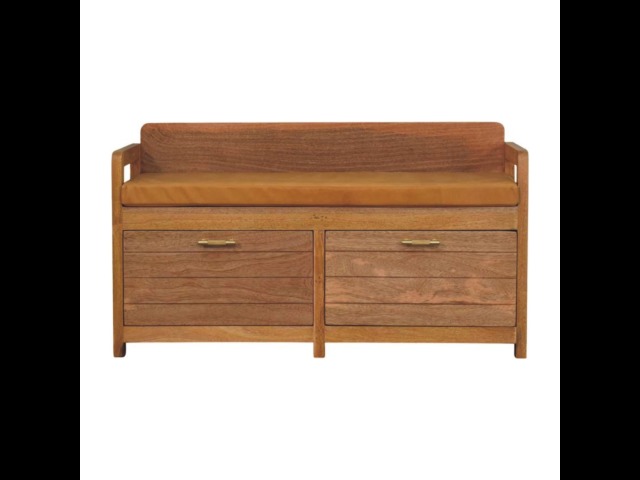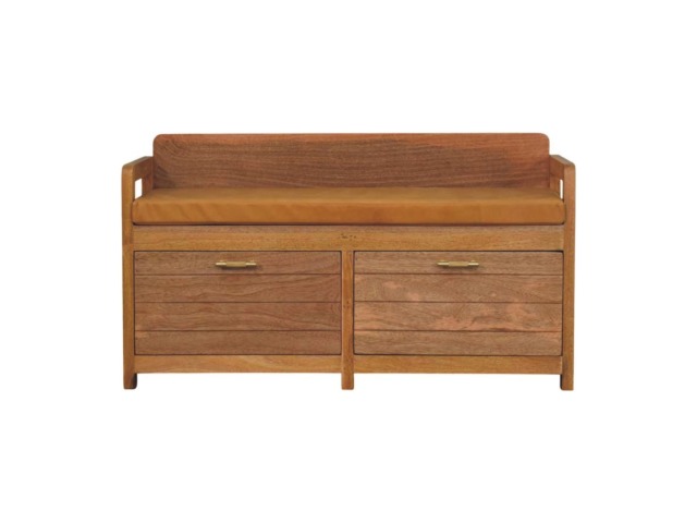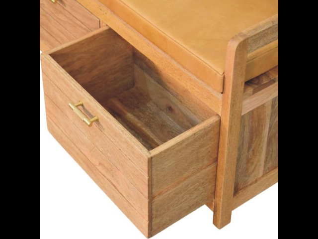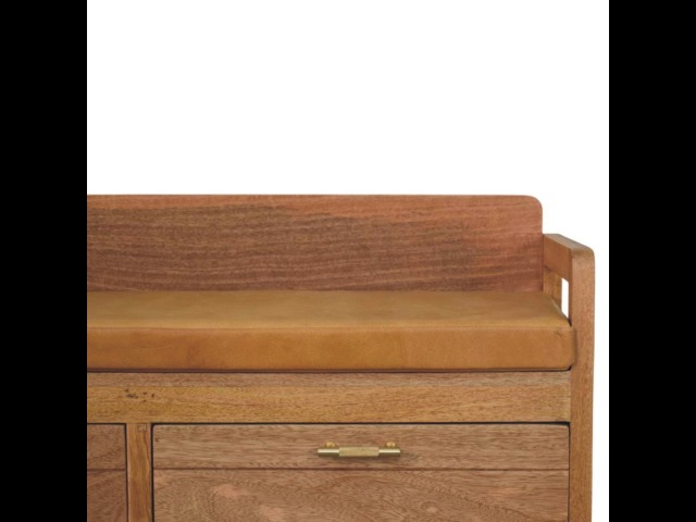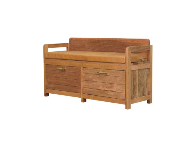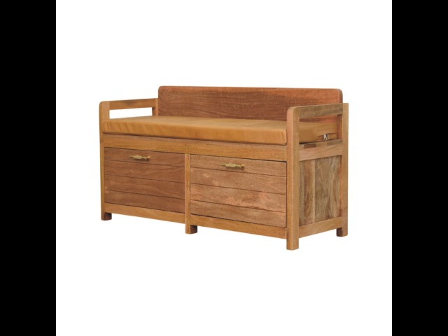 Introducing the Oxford Storage Bench, a perfect fusion of style and functionality. Crafted from 100% solid mango wood with a natural oak-ish finish, this bench features a comfortable buffalo hide leather cushioned seat in a warm tan tone, making it ideal for seating in entryways, bedrooms, or living spaces. Beneath the seat, two spacious pull-out drawers with sleek brass handles provide ample storage for shoes, linens, or everyday essentials. Its clean lines and sturdy frame exude rustic charm, while the compact design ensures versatility for various interiors. The Oxford Storage Bench is a timeless piece that elevates organization and style in your home.