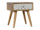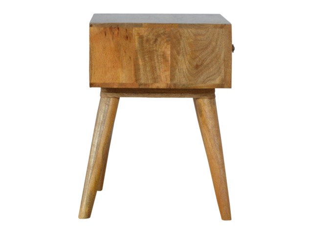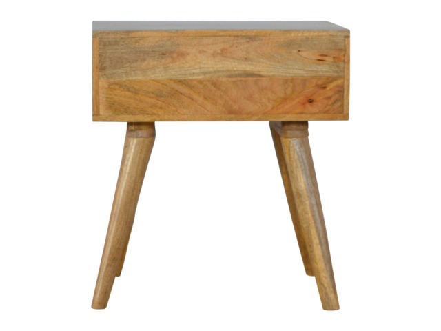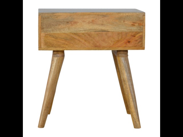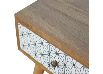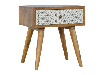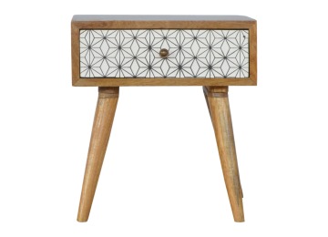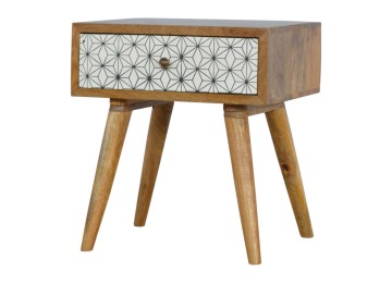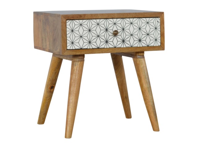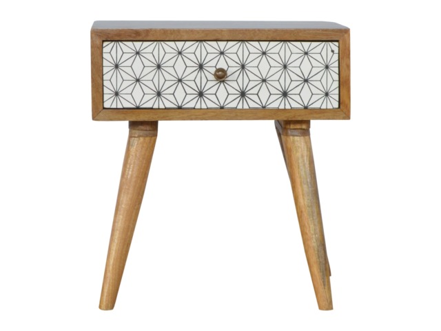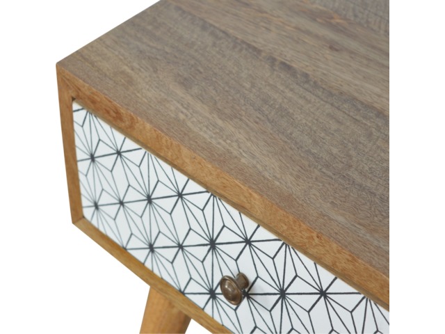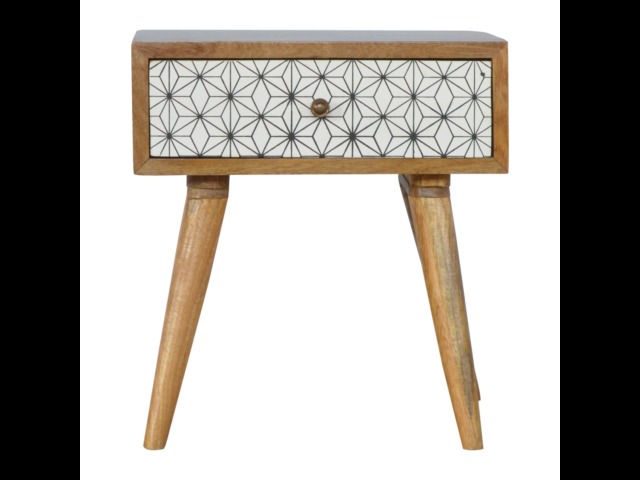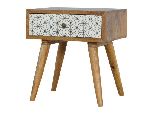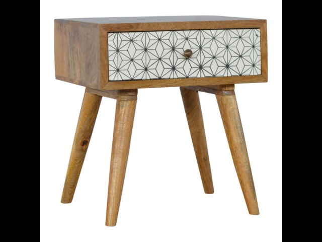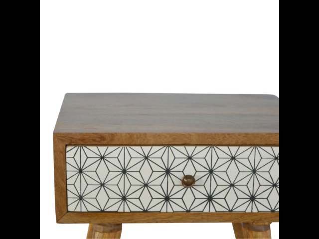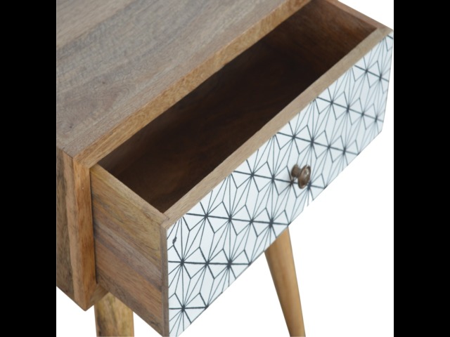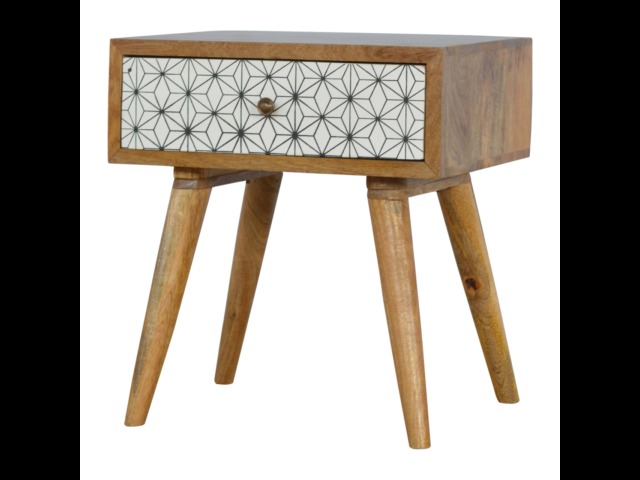 This bedside table is the perfect addition to add to any bedroom. It will prove handy all over your home and is made from 100% solid mango wood with a fine oak-ish finish. It also comes with a geometric design screen printed drawer that has a shiny brass knob and has 4 Scandinavian styled legs.