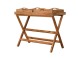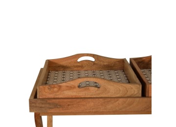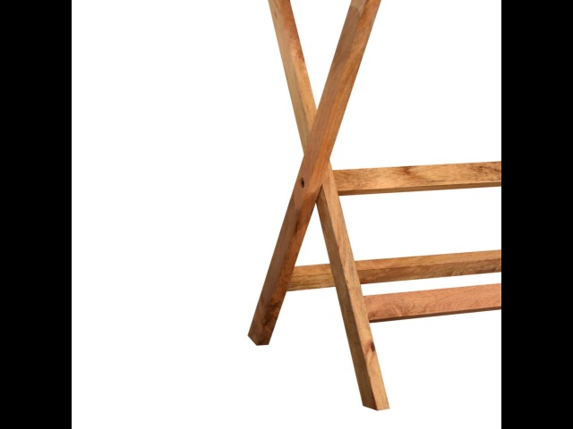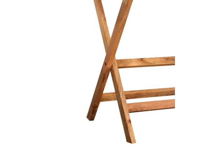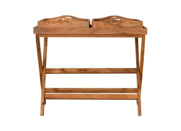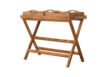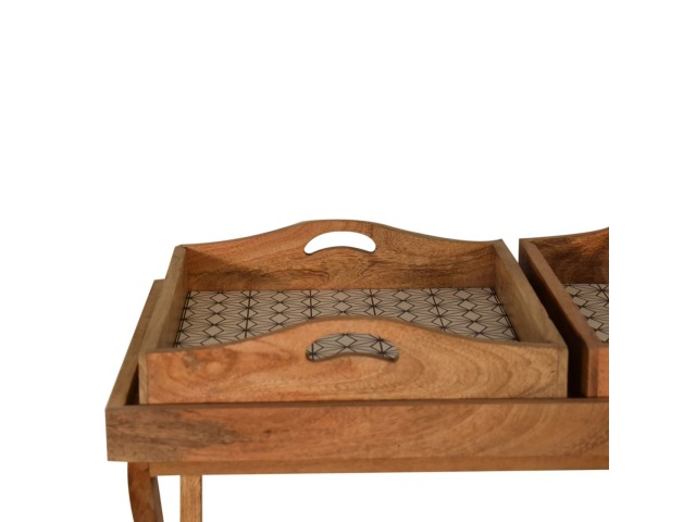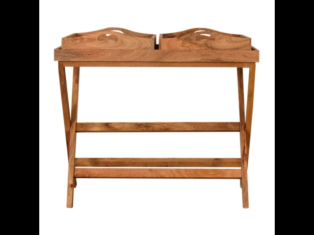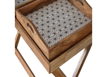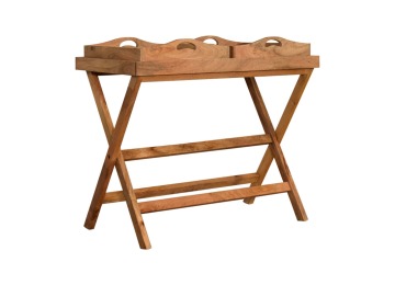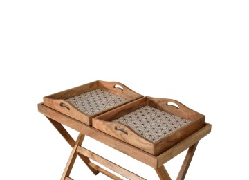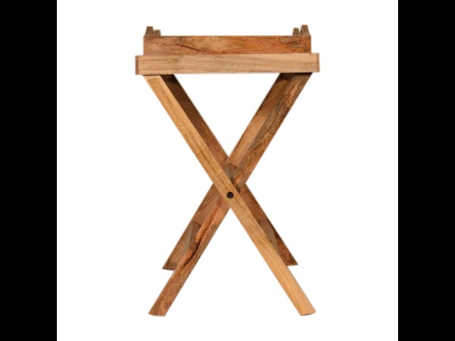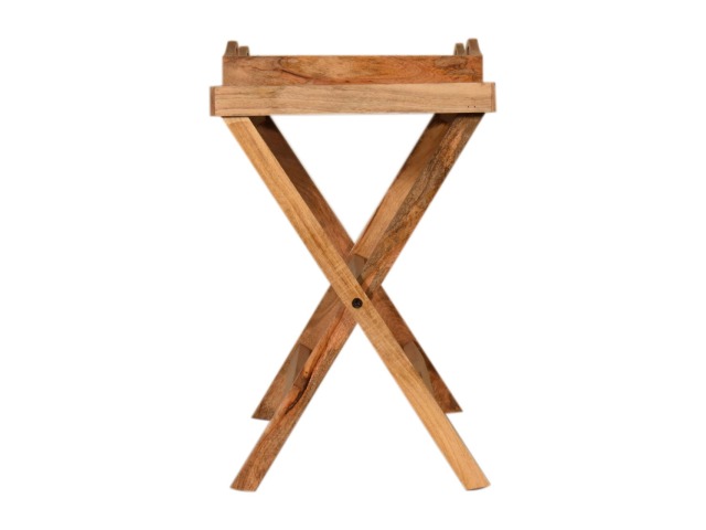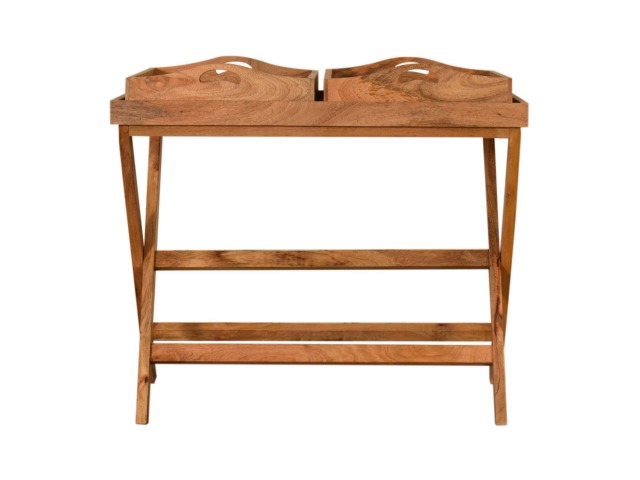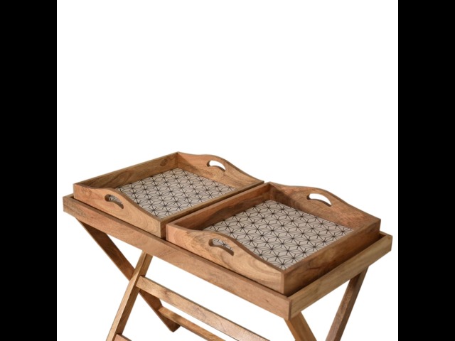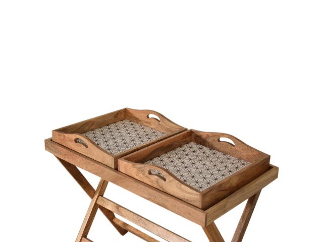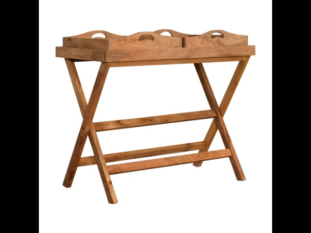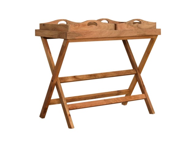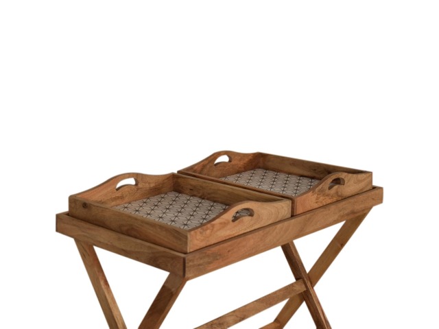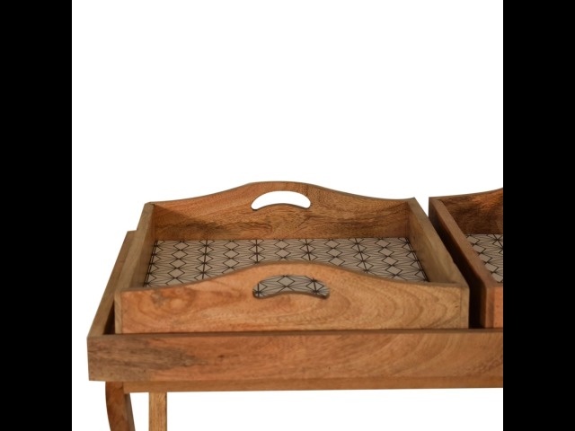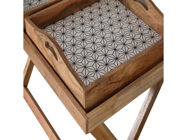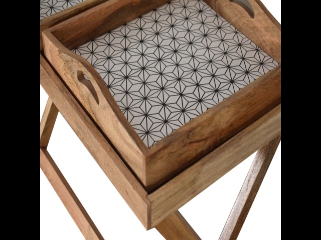 This practical and timeless butler style writing desk, combines both a modern and classic style for everyday use throughout the home. The piece has been constructed from 100% solid mango wood in an oak-ish finish and featues practical foldable legs. It also features a geometric screen printed design and cut outs for your convenience. The folding mechanism requires the tray to be removed prior to de-assembling of the base.