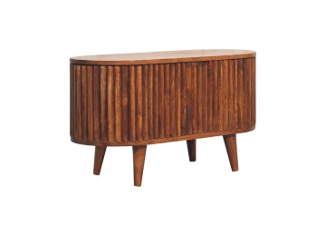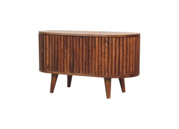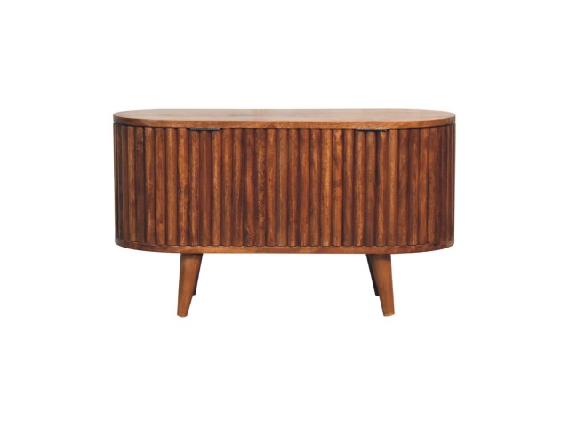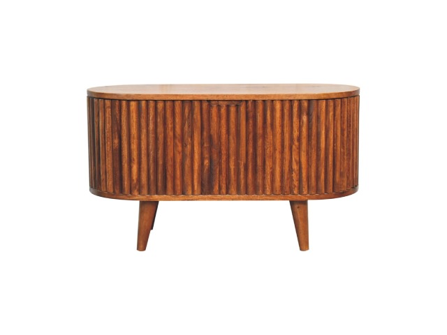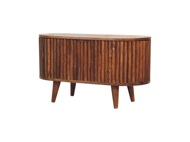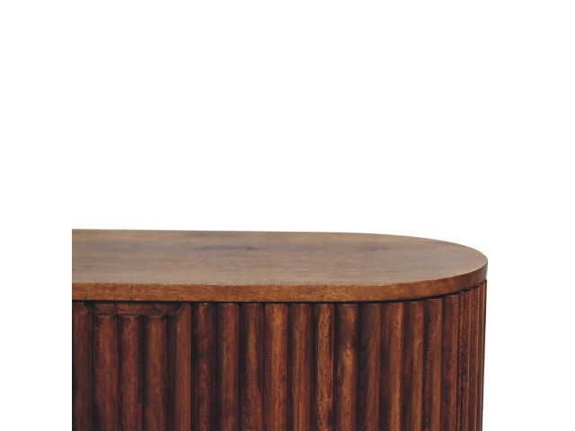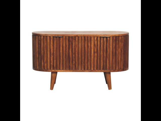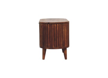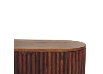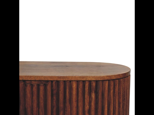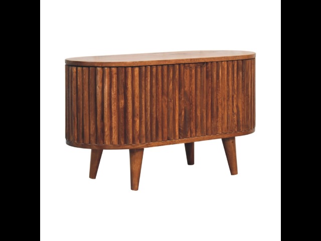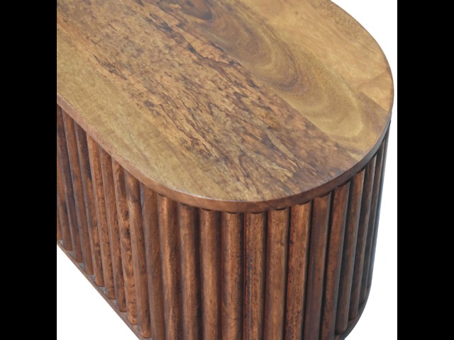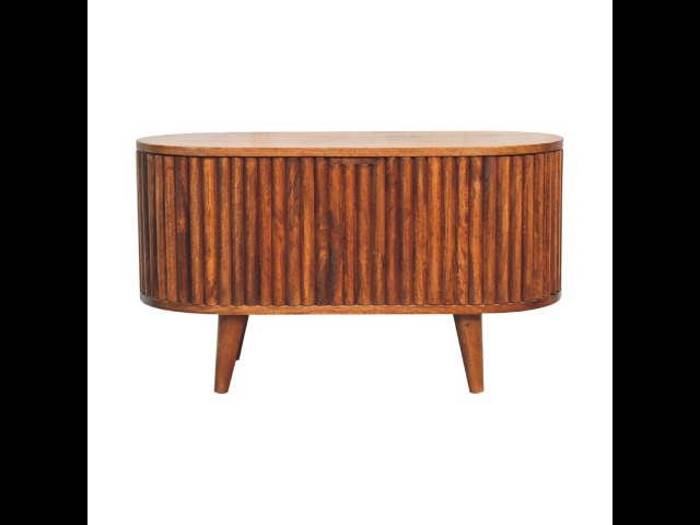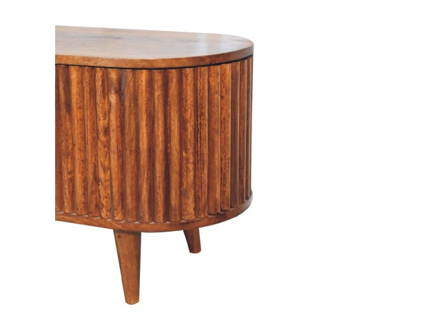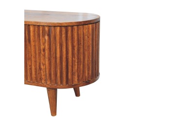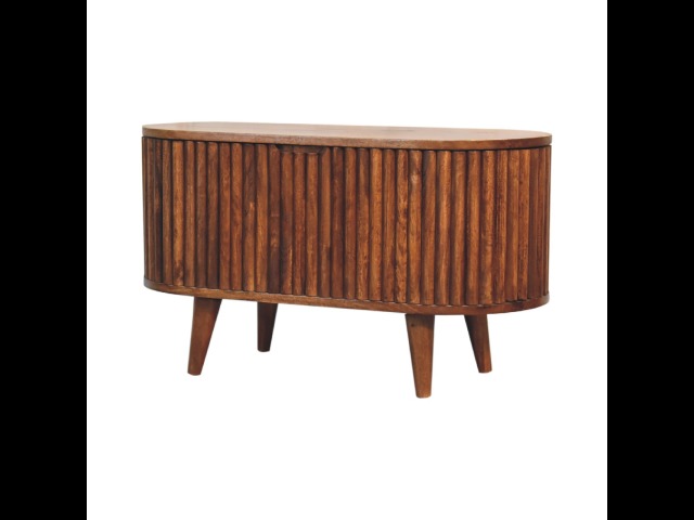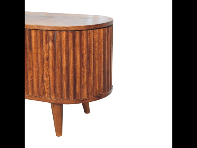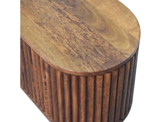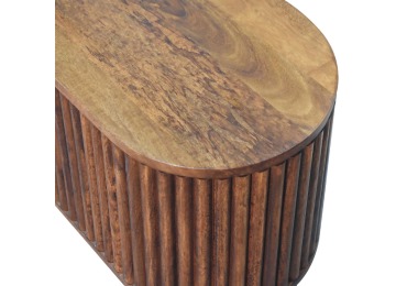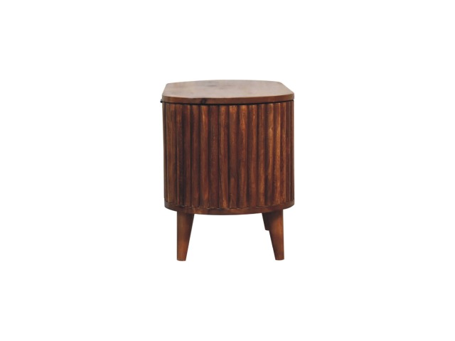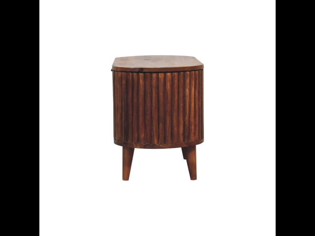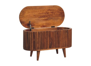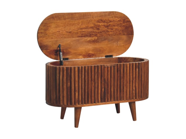 This rounded blanket box is crafted from 100% solid mango wood in an chestnut finish with a ridged edge surface, it combines elegance with practicality. Store your blankets and treasures with ease, ensuring your room is always neat, tidy and organized.