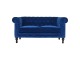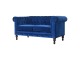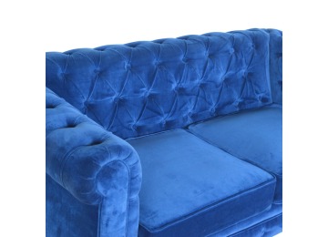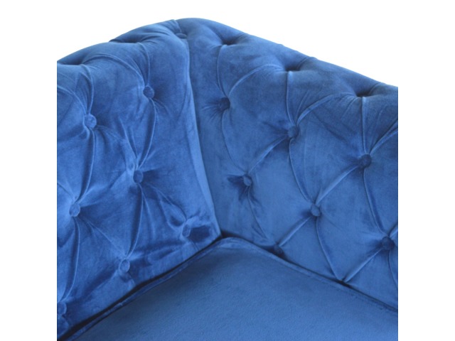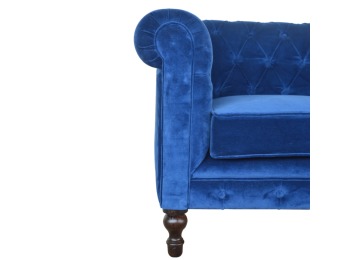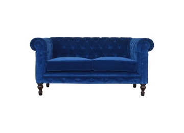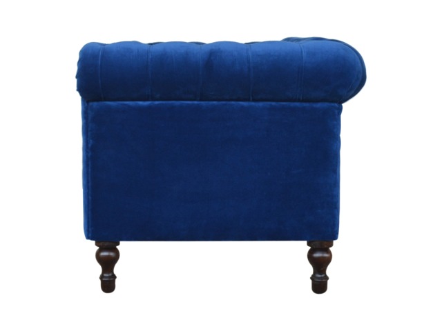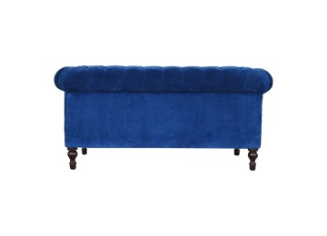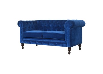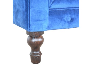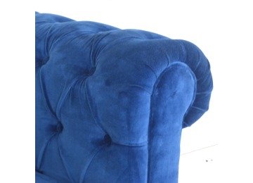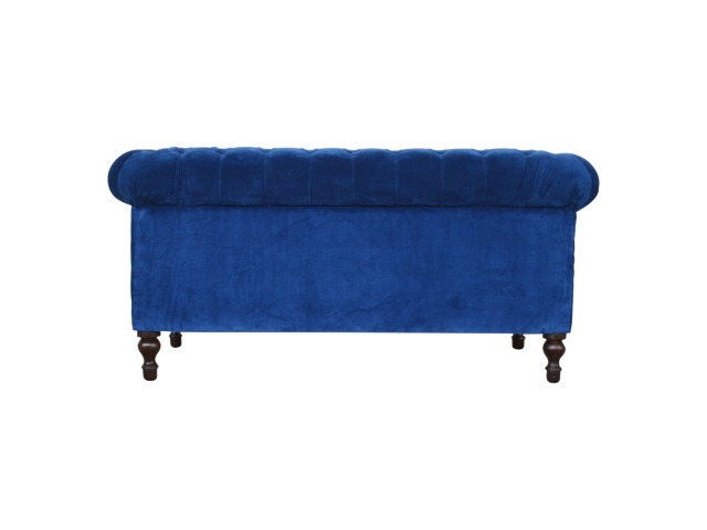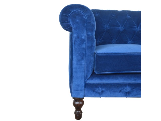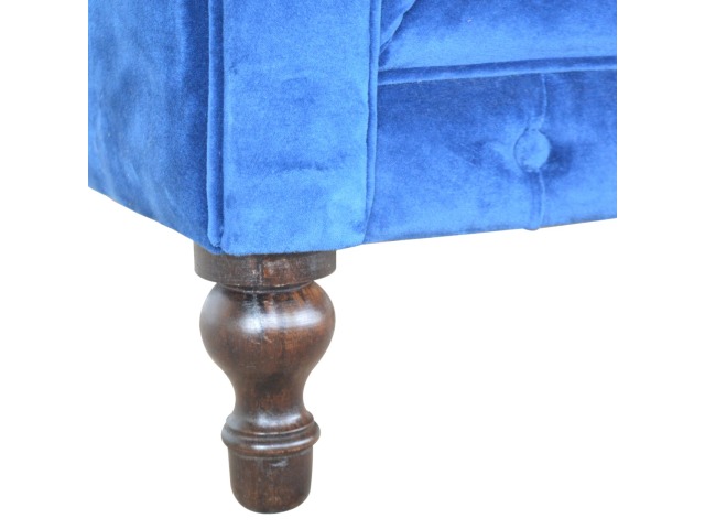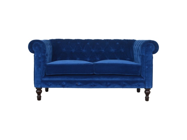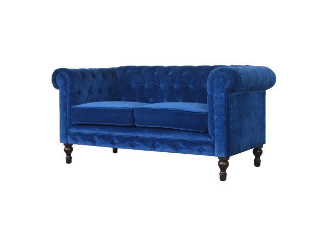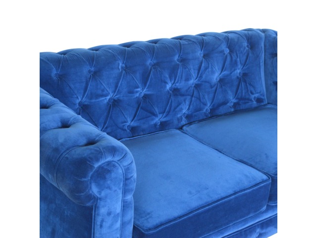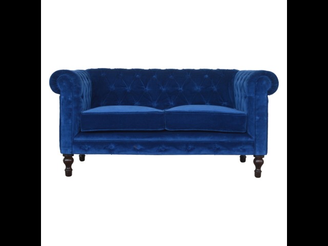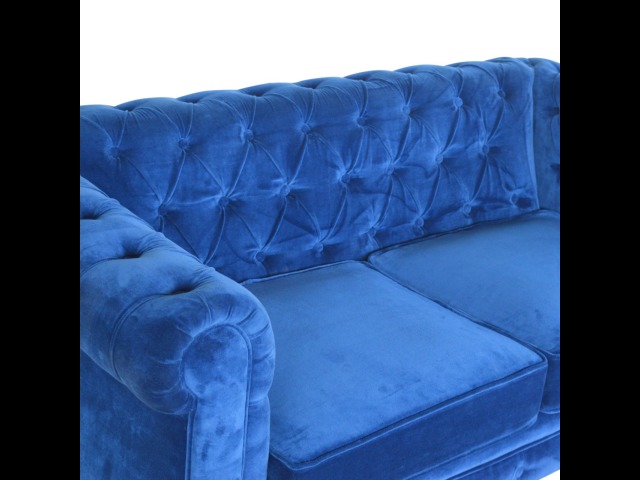 This beautiful 2 Seater Chesterfield Sofa has been upholstered in a luxurious royal blue cotton velvet and features 4 turned feet constructed from 100% solid mango wood in a walnut finish. This sofa is detailed with deep button tufts, piping, and sheltering arms. This is a statement piece for the home which can be added as a pop of colour to the living room in the home, it can be suited well with many different styles and colours of interiors being modern or classic. Product to be delivered on the pallet as a pavement/kerbside delivery. Customer needs to dispose off or use it if they wish to. For possible returns, we would require the original pallet alongside full packaging as part of returns policy.