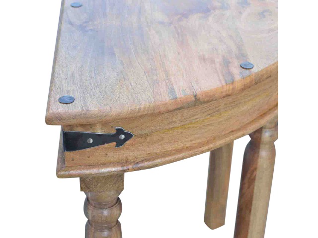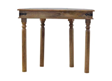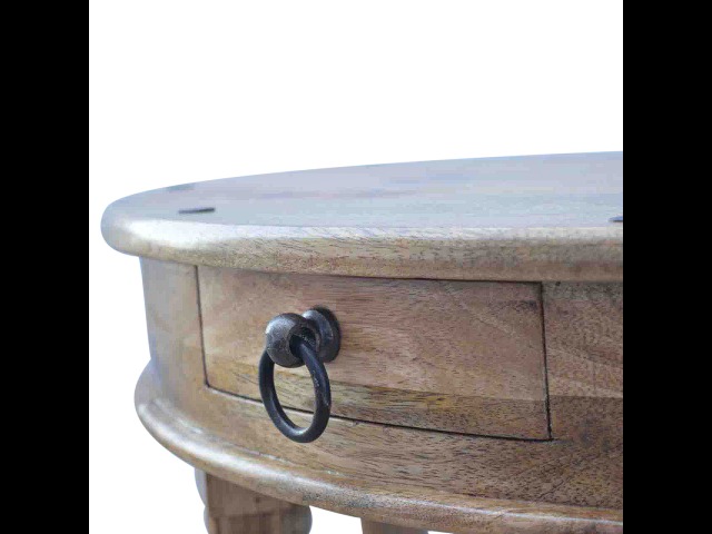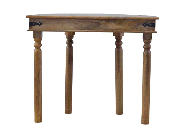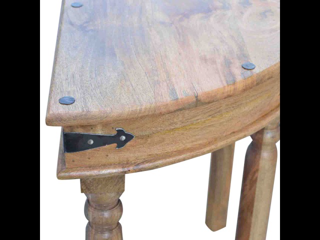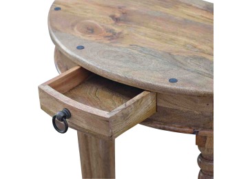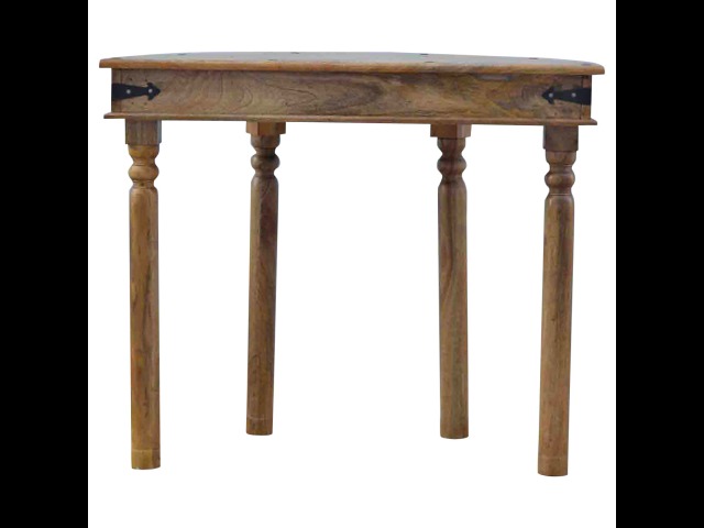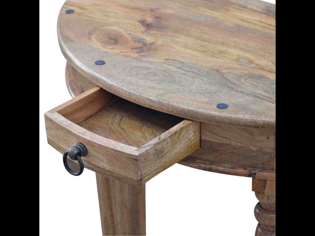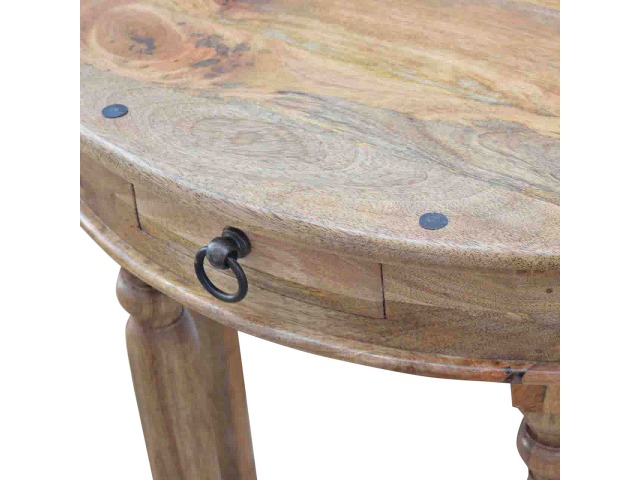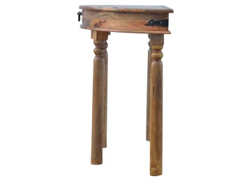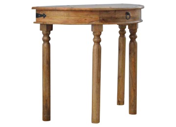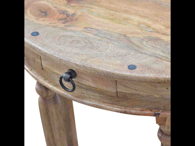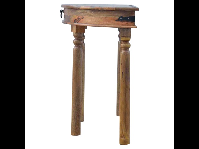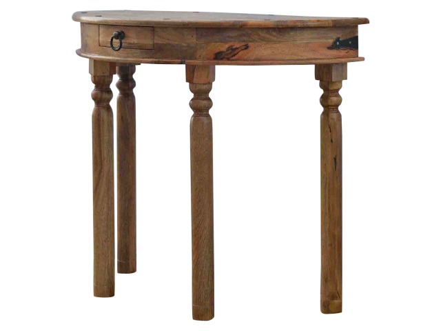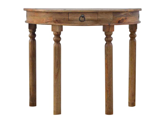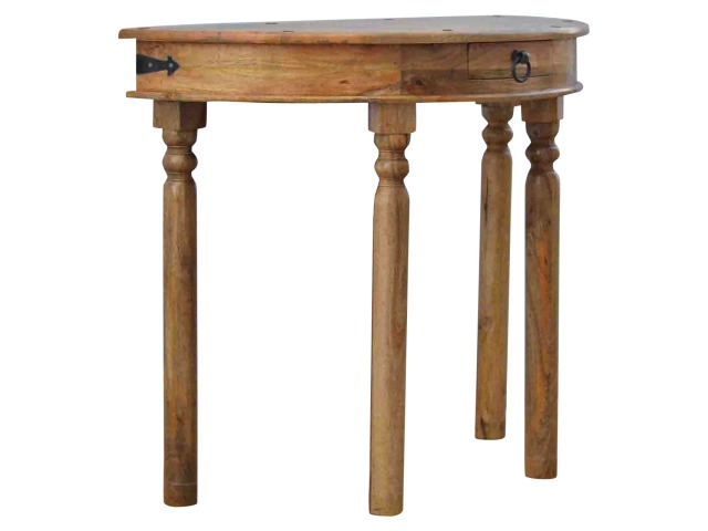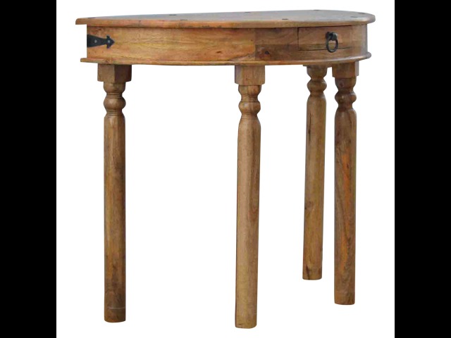 This console table is constructed from 100% solid mango wood and has a fine oak-ish finish. Other features include 4 hand turned legs, a ring knob, 1 drawer to store small house hold bits keeping your home tidy and organised. It?s the perfect addition to any home!