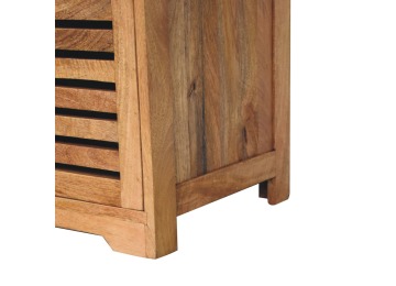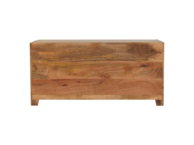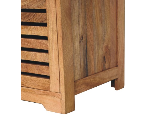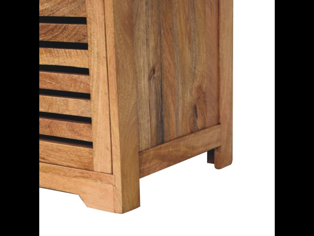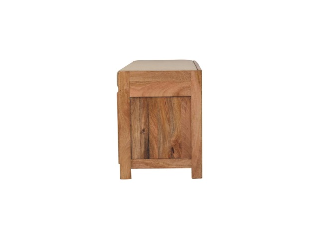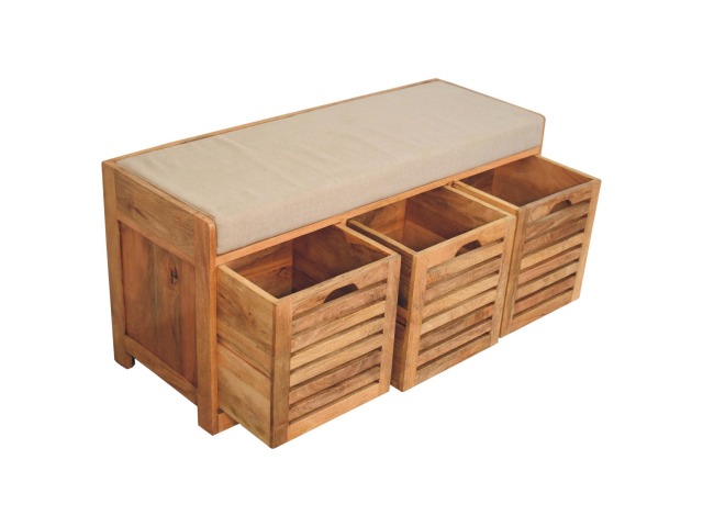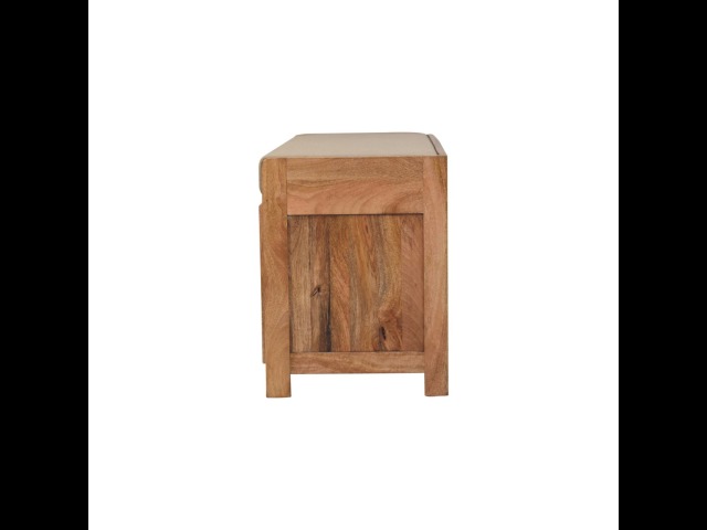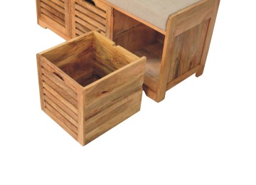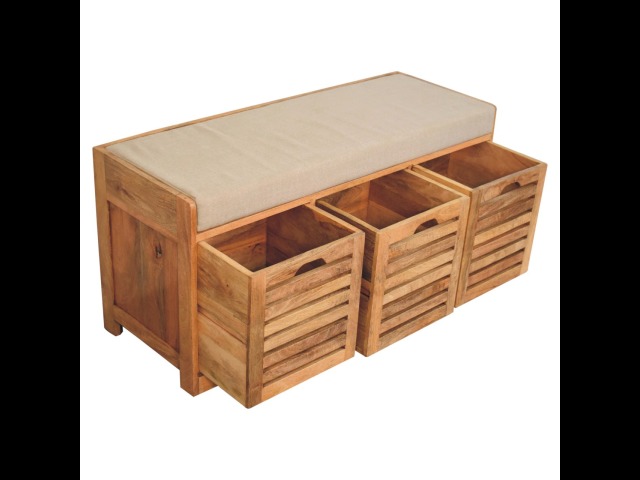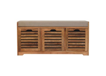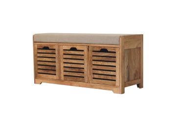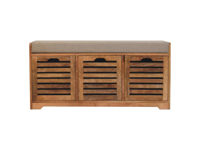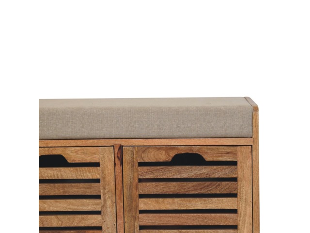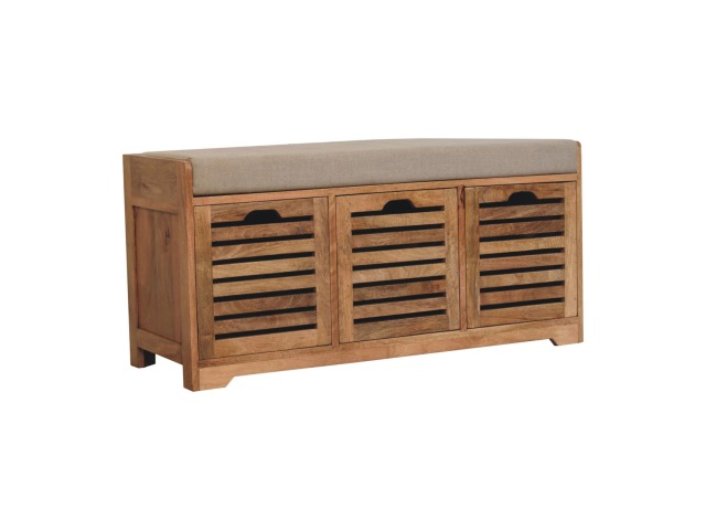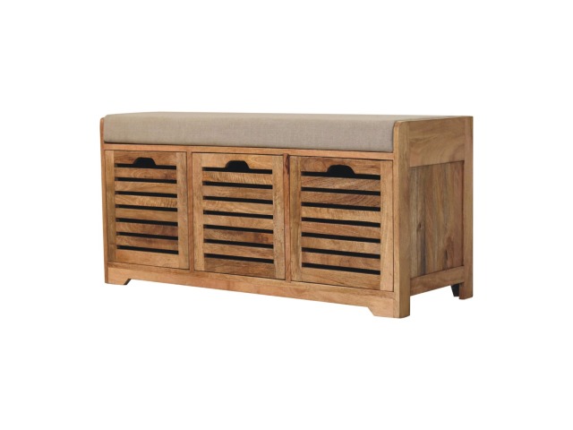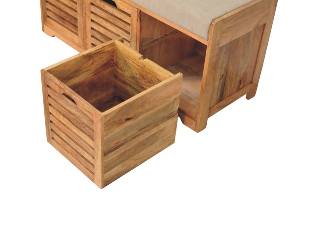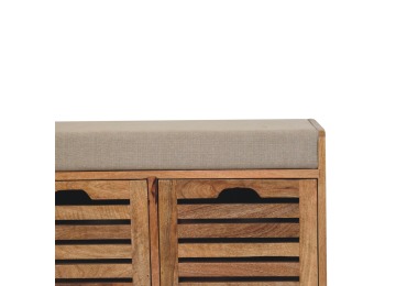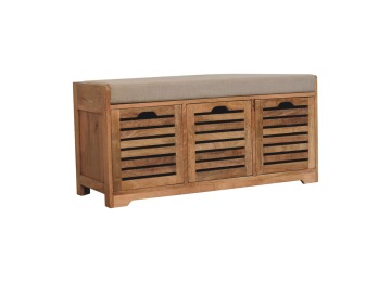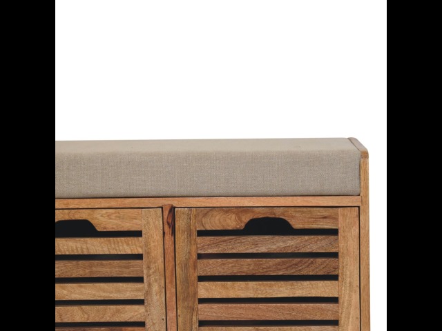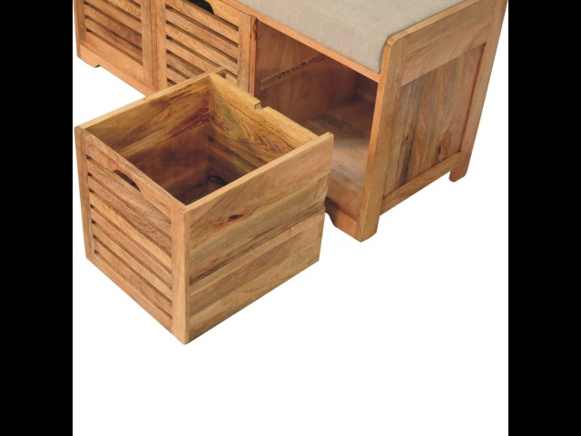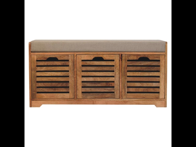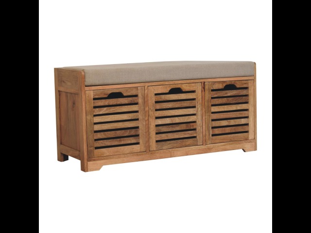 The Shutter Oak-ish Bench combines form and function effortlessly. Handcrafted from 100% solid mango wood with an elegant oak-ish finish, it features three louvered compartments perfect for organizing your footwear or other essentials. The cream boucle cushioned seat offers a touch of softness and comfort, making it an ideal piece for your entryway, hallway, or bedroom.