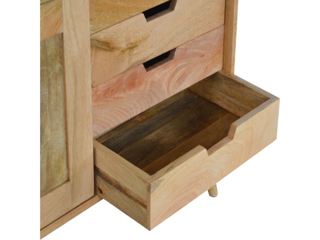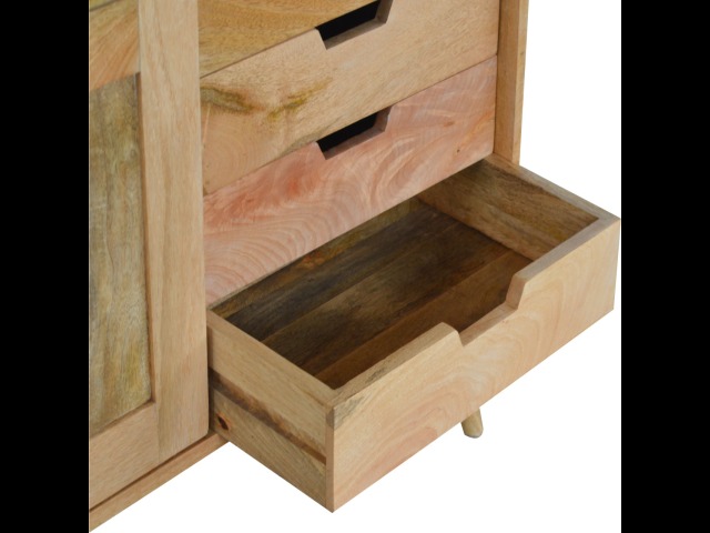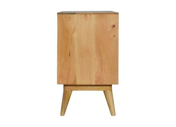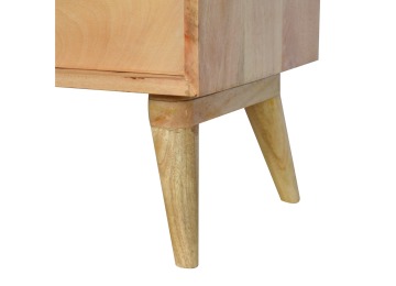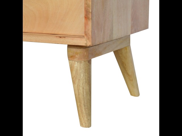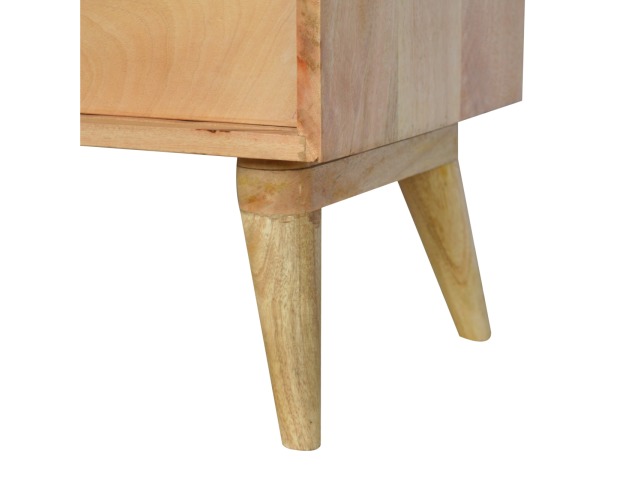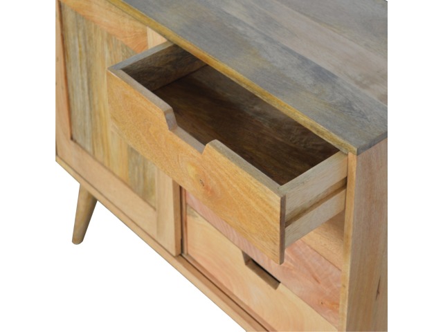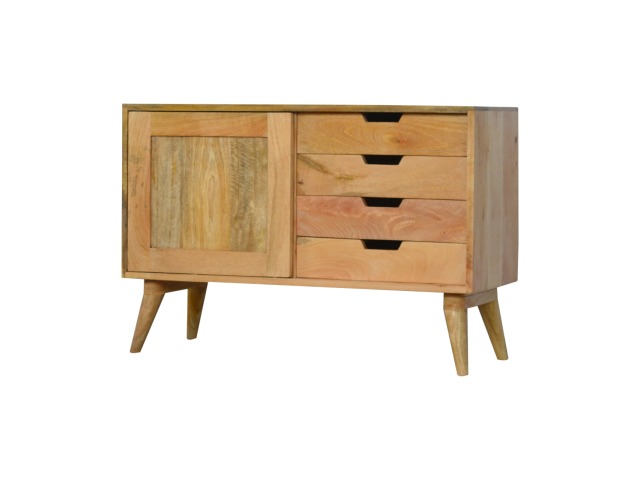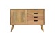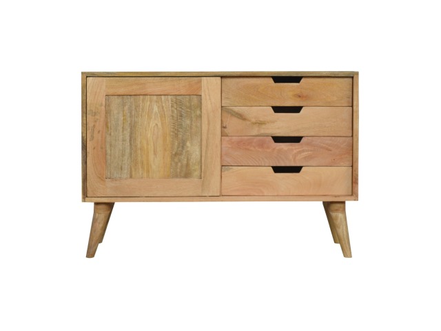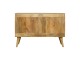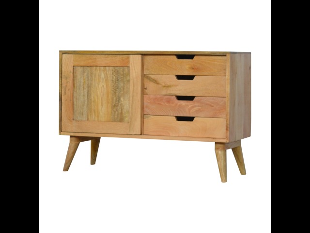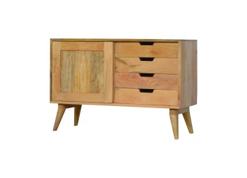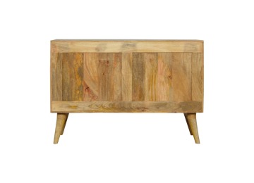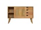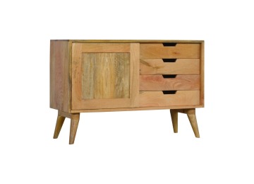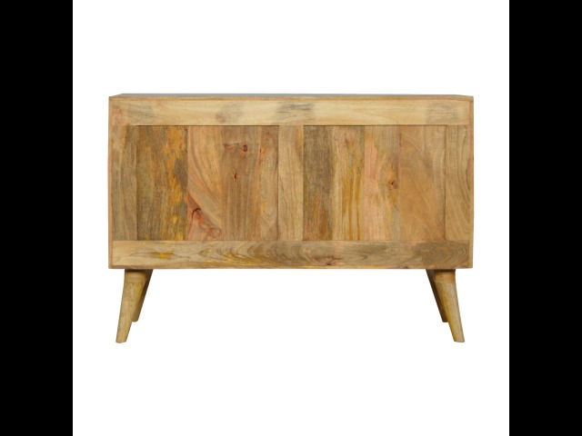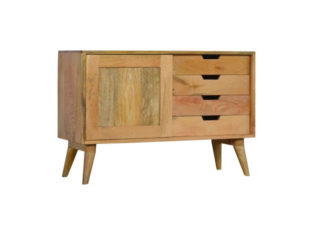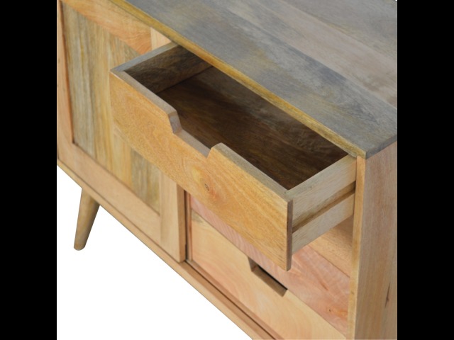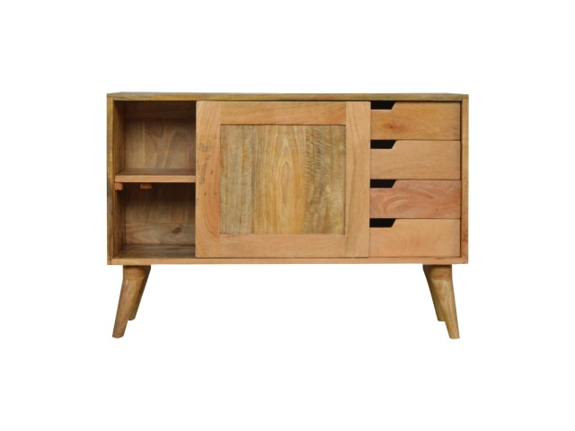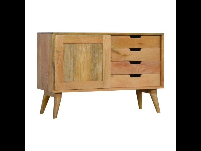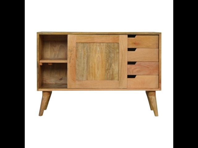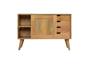This solid timber sliding sideboard is expertly constructed from 100% solid mango wood and has a clean and simple design to suit most homes. This piece has a lovely oak-ish finish meaning it can complement and fit into many different interiors. It is carefully finished in a durable lacquer to help protect and enhance the look of this solid oak piece of furniture.