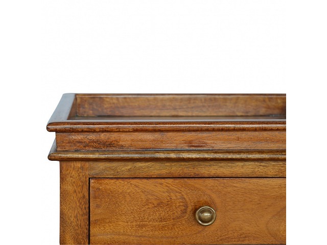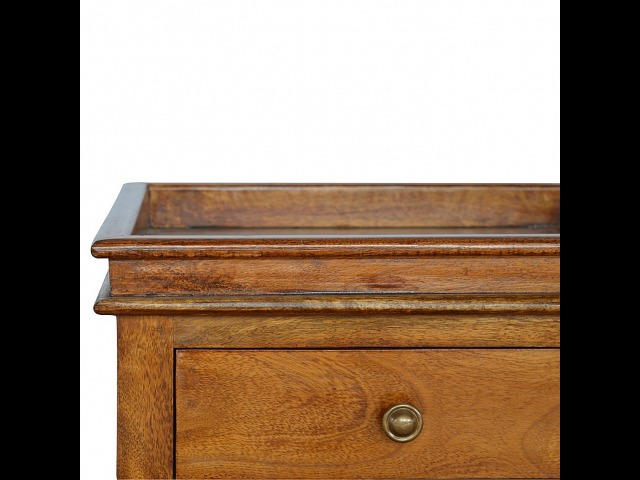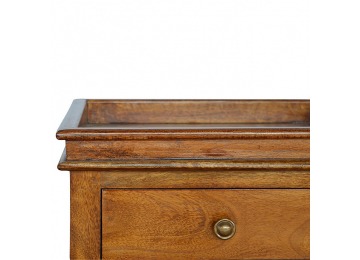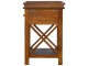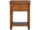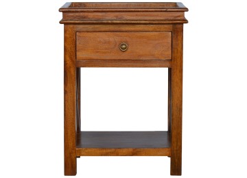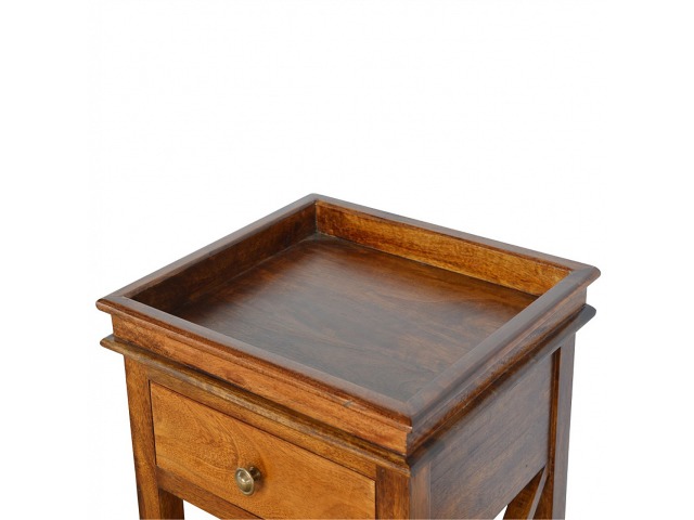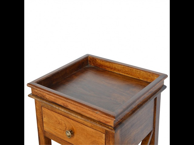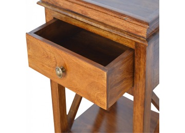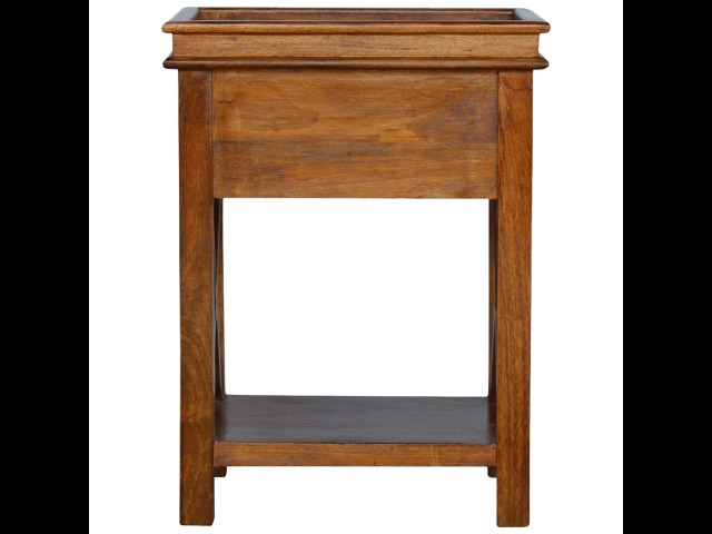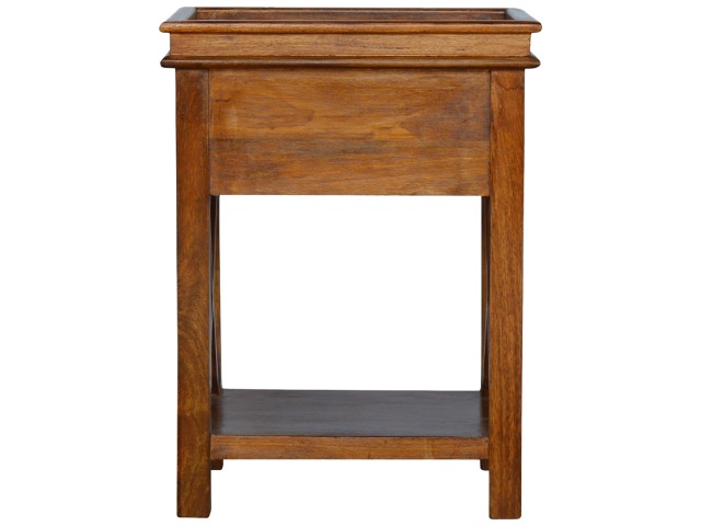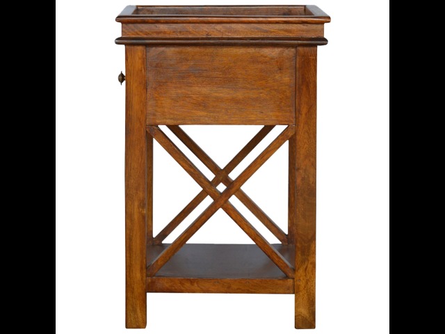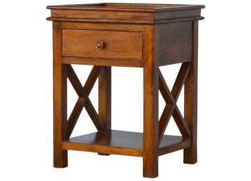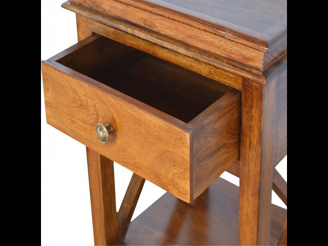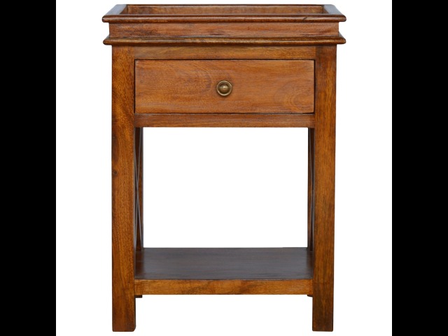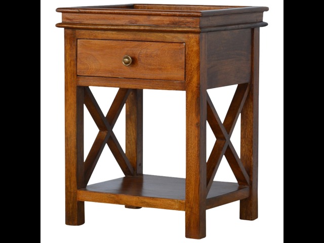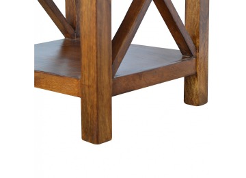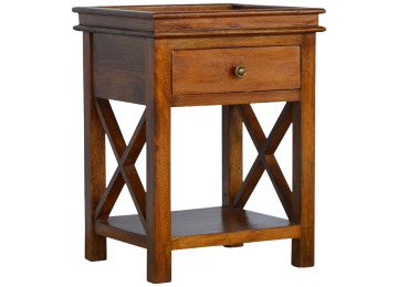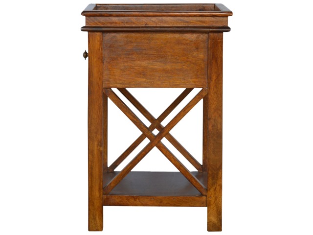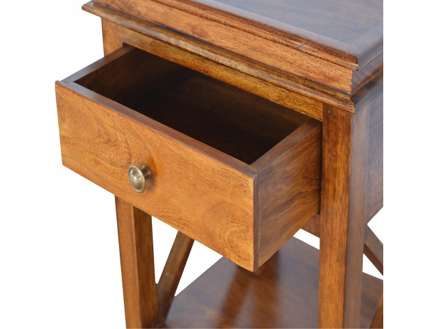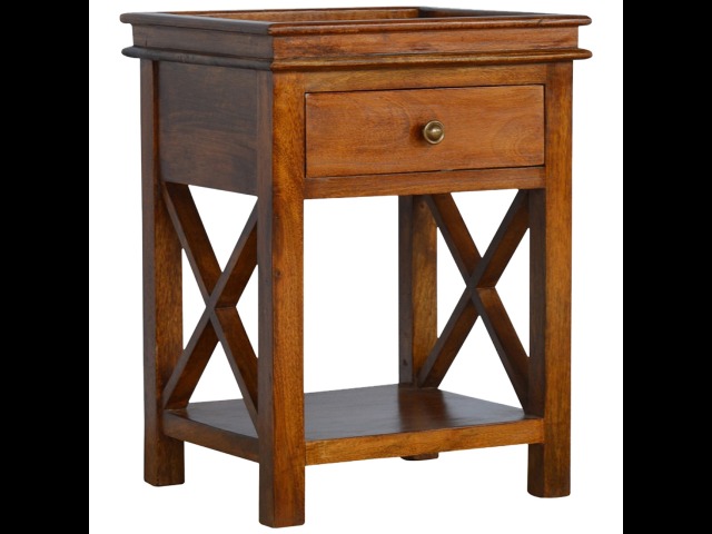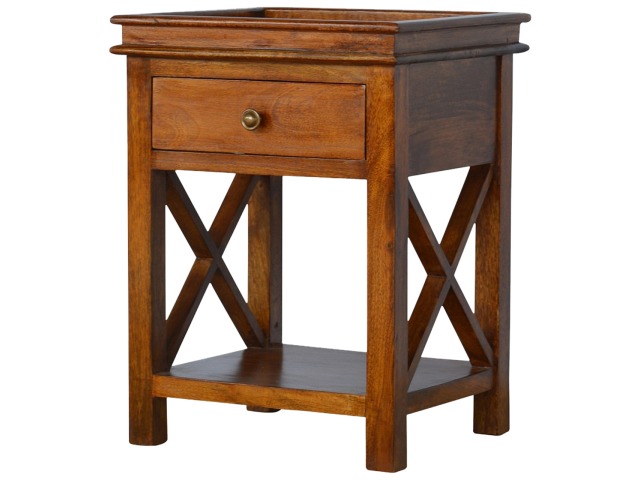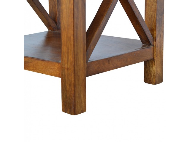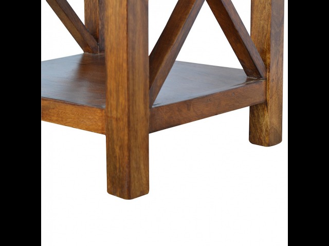 This end table has been constructed from 100% solid mango wood and finished in a beautiful chestnut colour. This product features 4 straight legs and a criss-cross design on each side of the panels. It offers some storage with 1 handy pull out drawer which has a shell handle and a small open slot to place any bits and bobs like books or magazines.