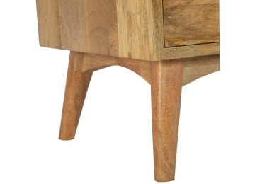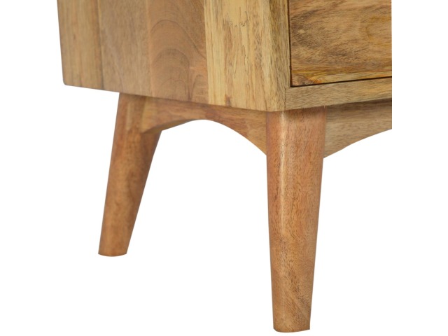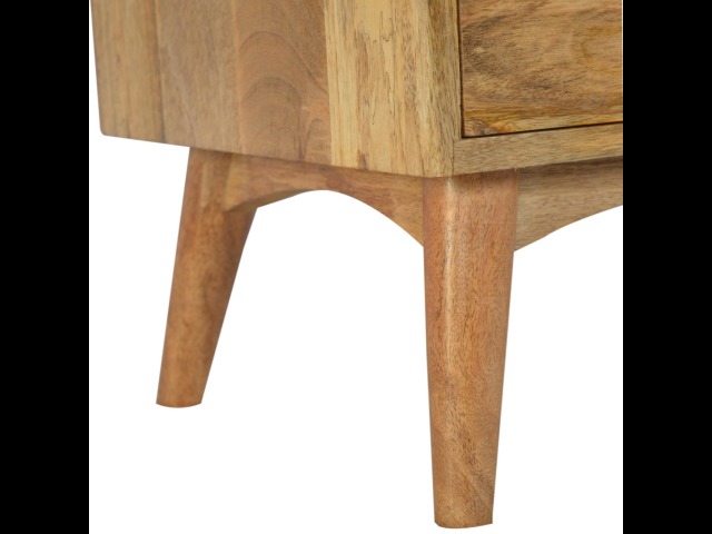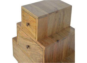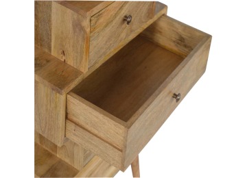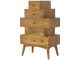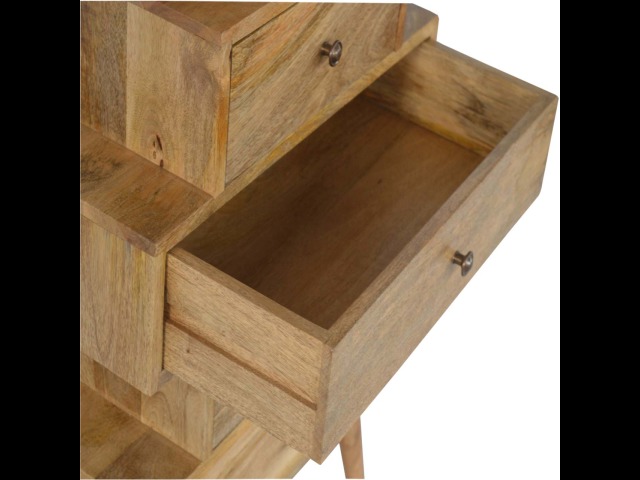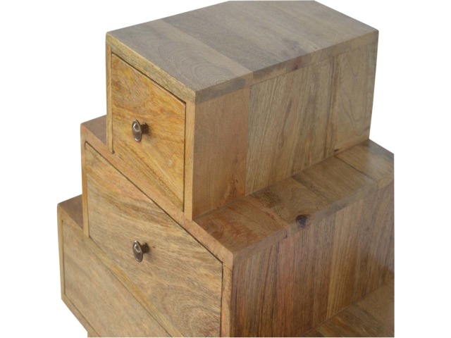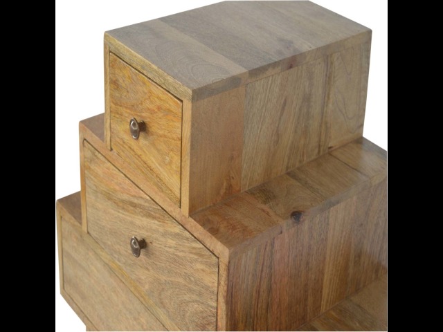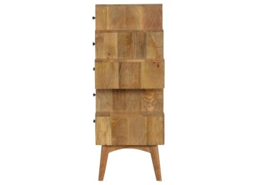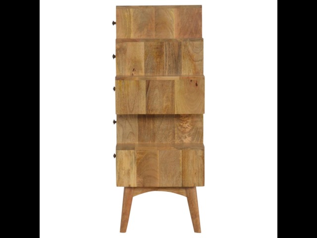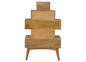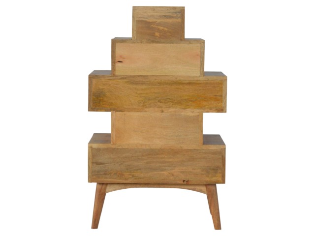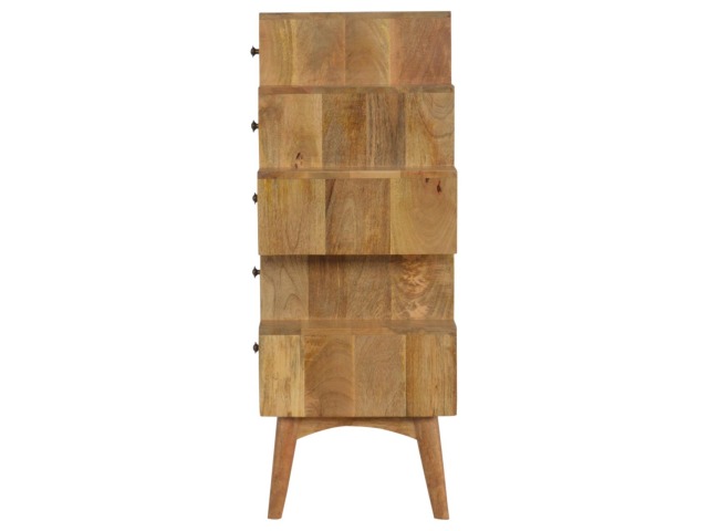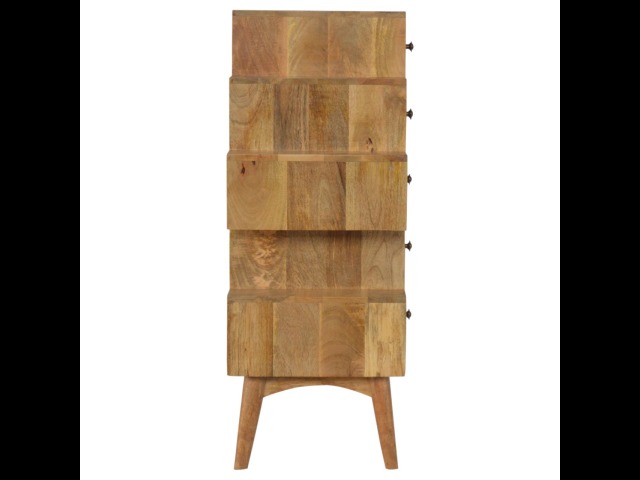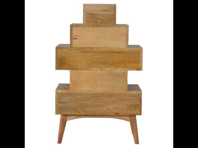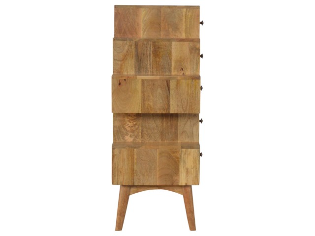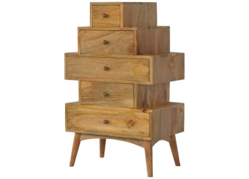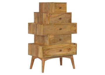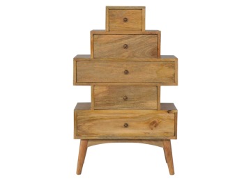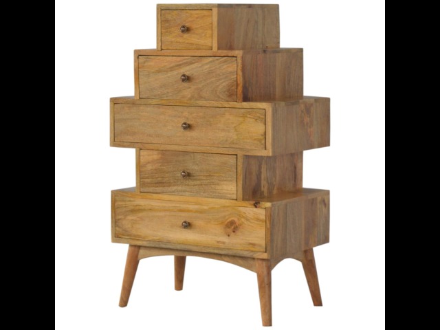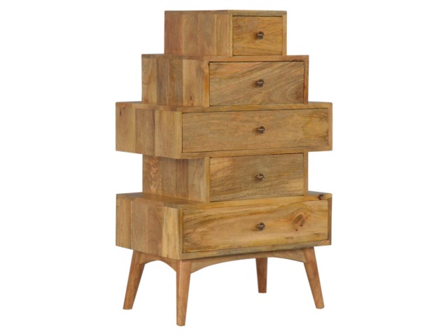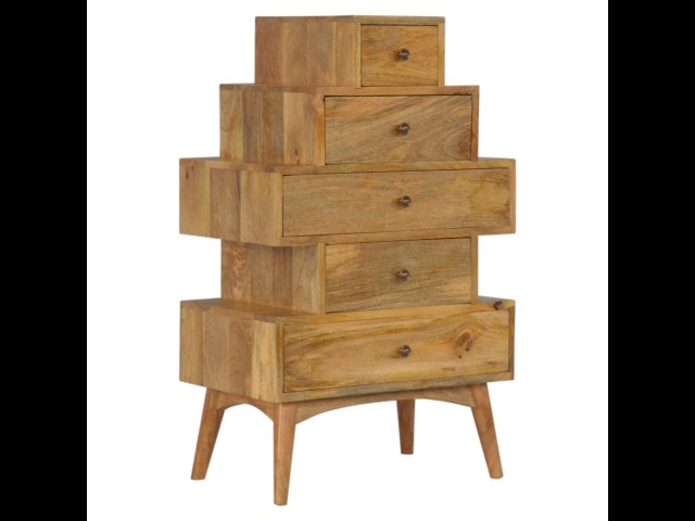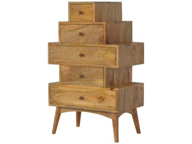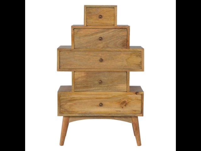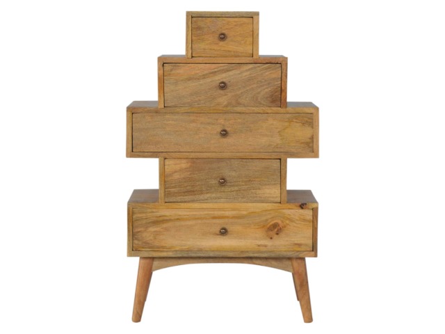 This Scandinavian styled 5 drawer chest is constructed from 100% solid mango wood and has a fine oak-ish finish. The five drawers in this chest are all different sizes resting on top of each other, adding a very unique beautiful style to your home. Other features include Scandinavian styled feet and round shiny knob handles which have a pewter finish.