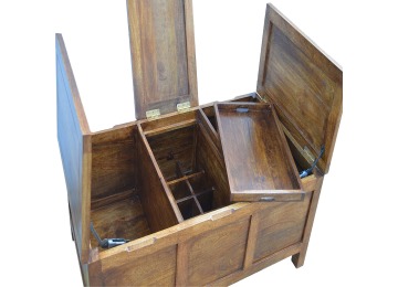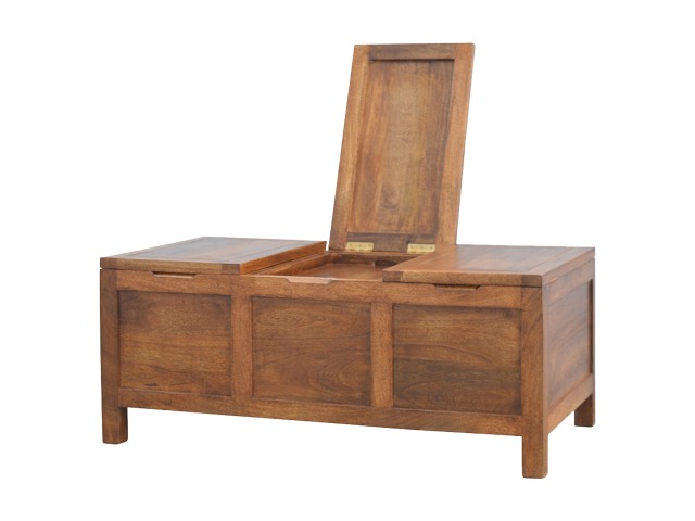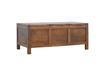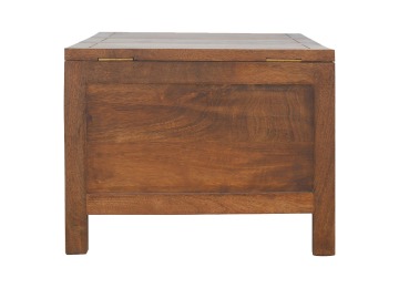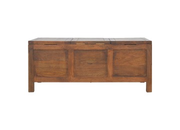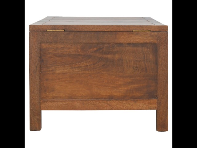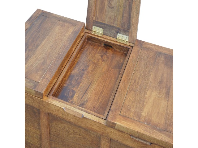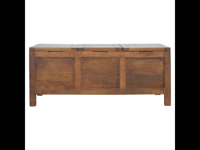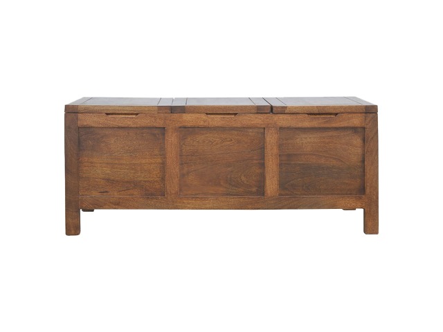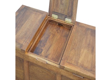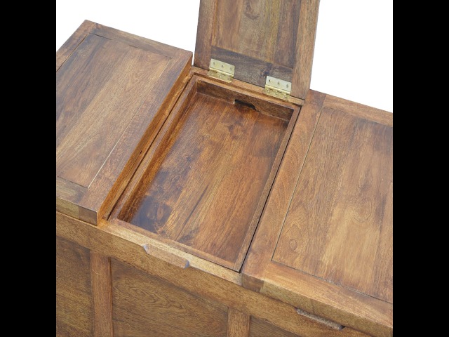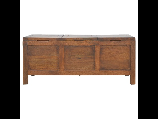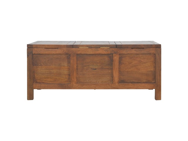 Add this folding tucker table to your dining room, conservatory or hallway. It features an open compartment in the middle which is handy for placing any bottles of wine and 2 lid up storage seats which can be used for late night laughs with friends and family, and perfect for stroring away any blankets or cushions. It has been constructed from 100% solid mango wood in a chestnut finish and 4 straight.
