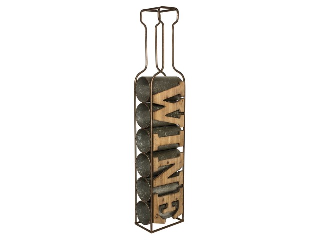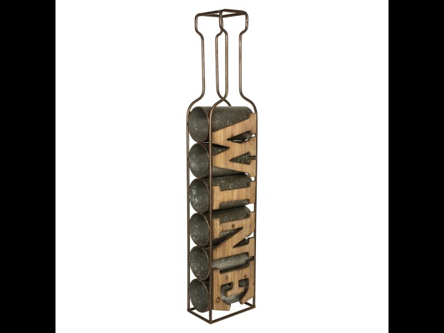 This vintage style wine rack features a metal frame with wooden lettering spelling out wine and cylinders on the from the base up. This item can either be used vertically or horizontally depending on your preference and will add a nice touch to your kitchen or dining room.