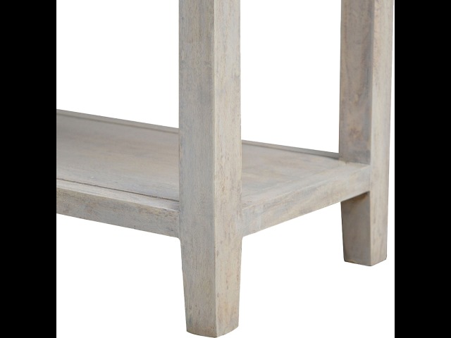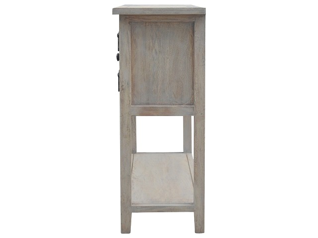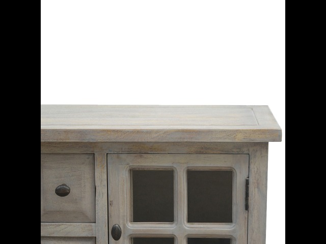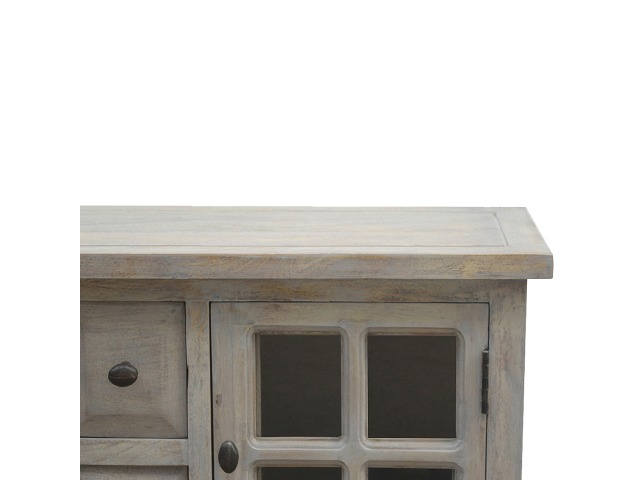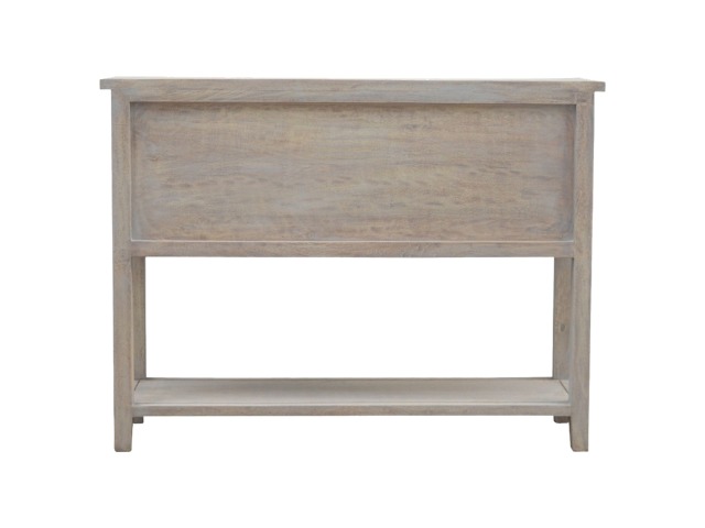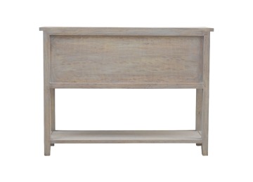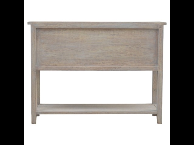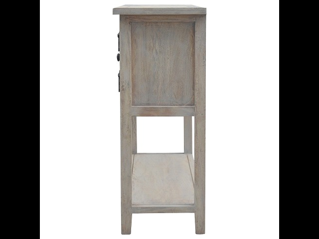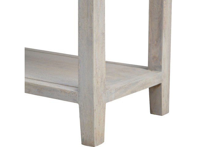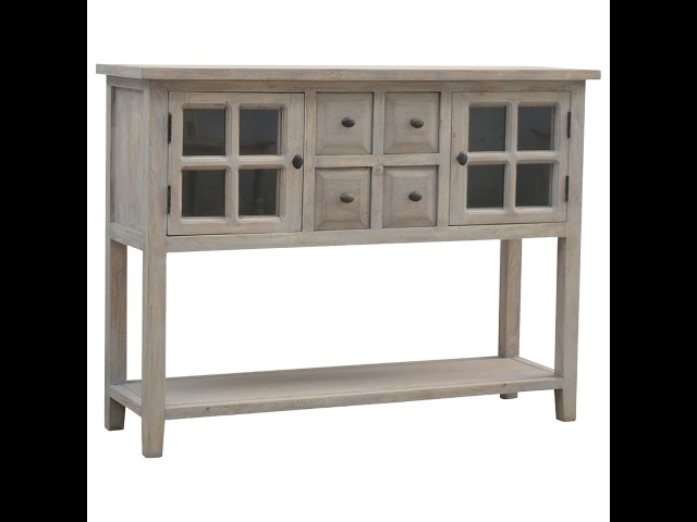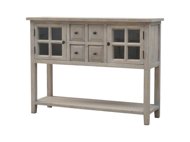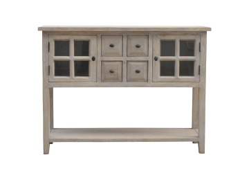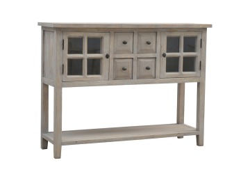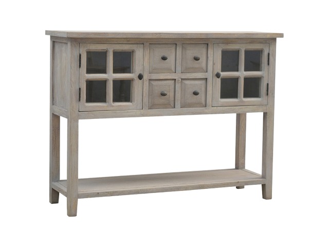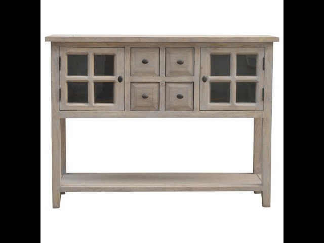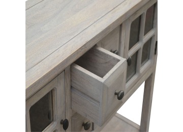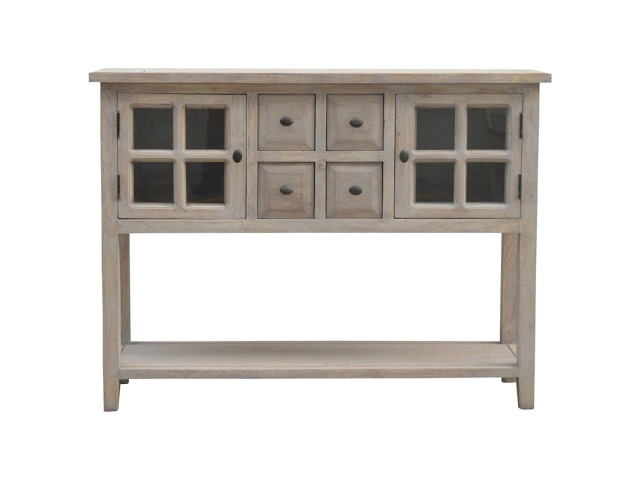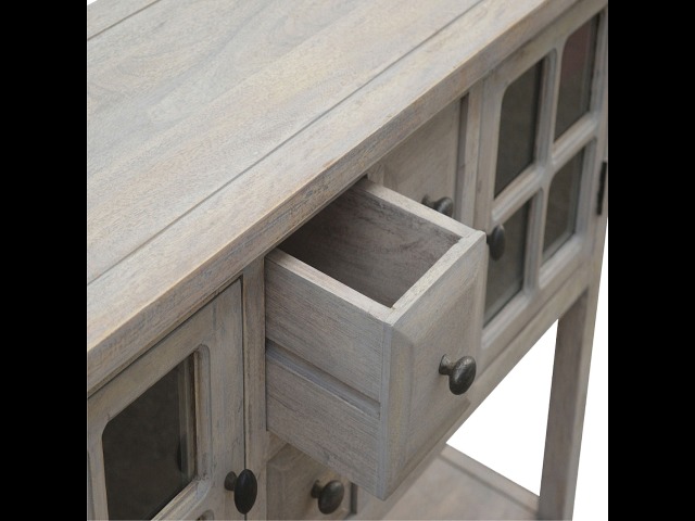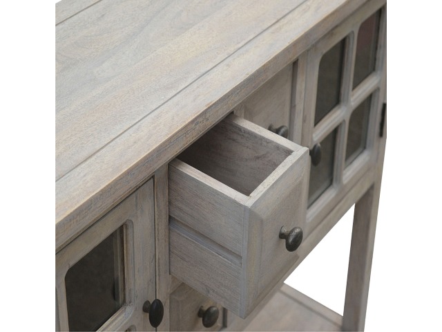 This console table would fit perfectly in any kitchen. It comes with 4 drawers and 2 glazed door cabinets with shelves inside providing useful storage space for your plates and cutlery. It is constructed from 100% solid mango wood which is meticulously hot dipped using a laborious caustic wash technique. This lengthy multi-stage finishing process gives a beautiful weathered and aged acid washed finish. Some other features include straight feet, round knob handles to the drawers, an under shelf and cabinets which are made from brass.