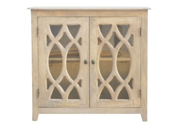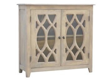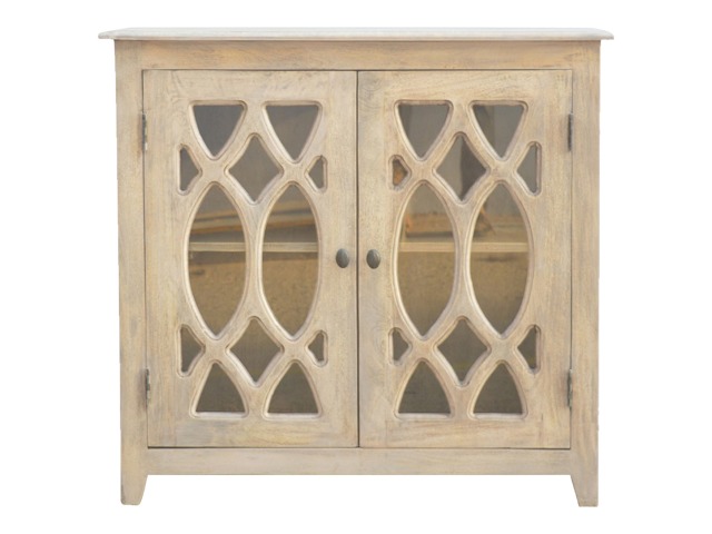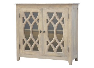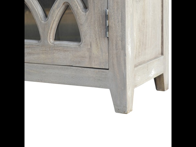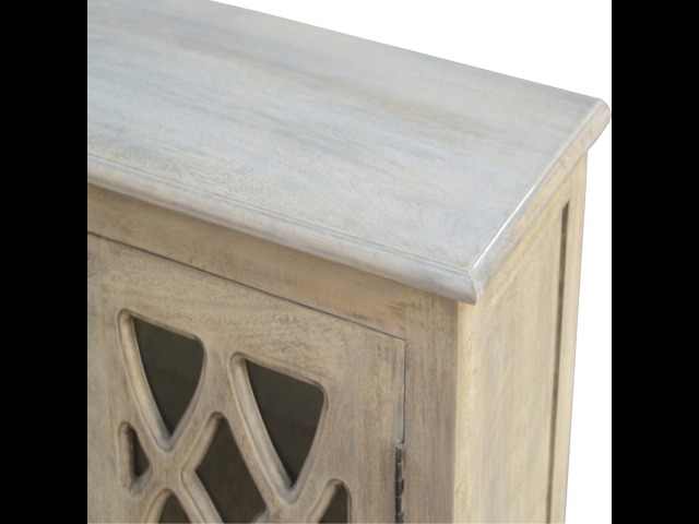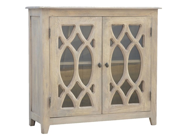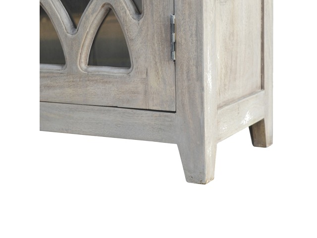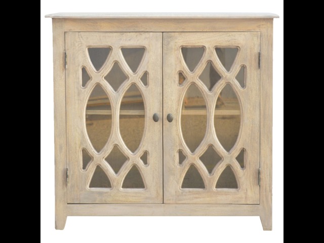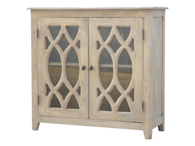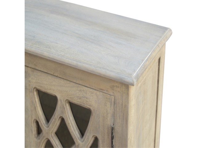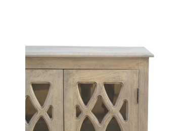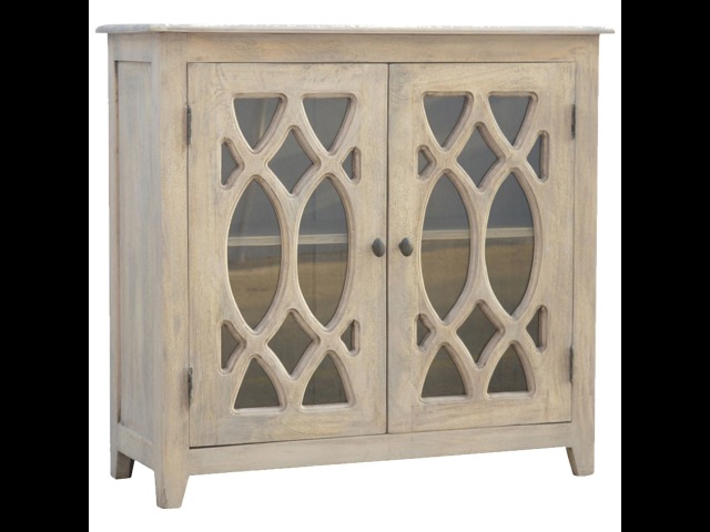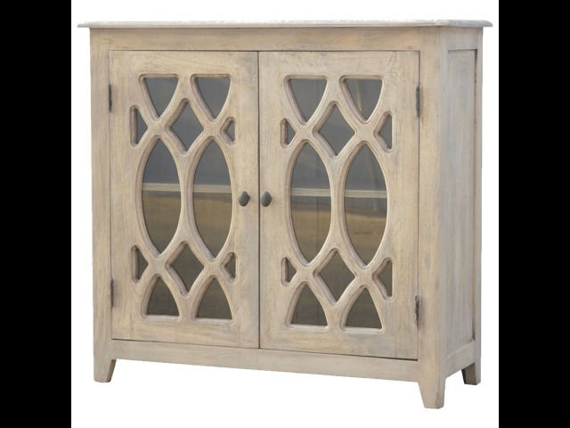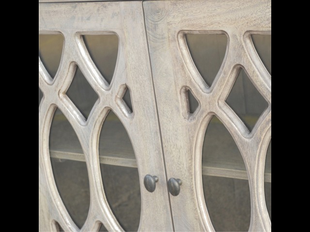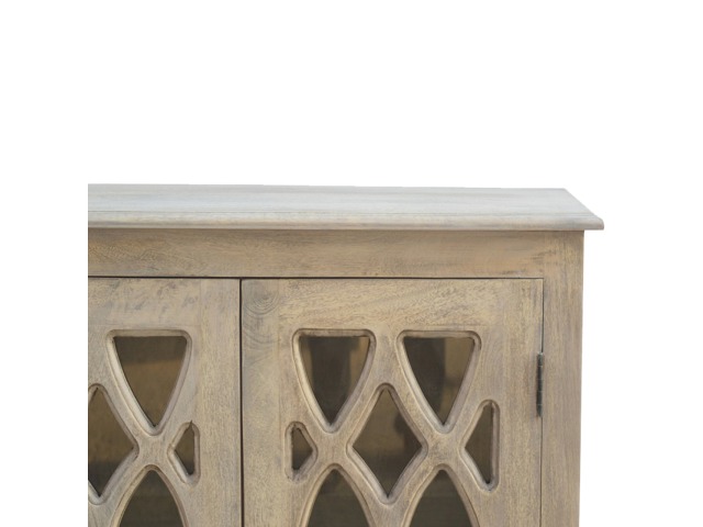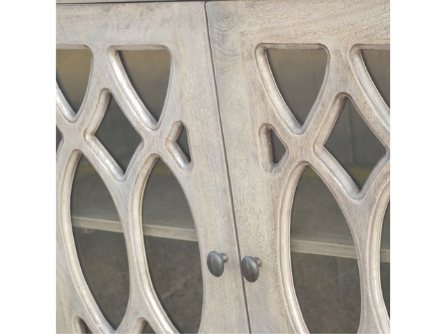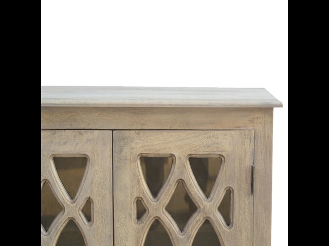 This sideboard is made from 100% solid mango wood and has smooth acid wash stone finish. This product offers excellent storage space with 6 open slots, 3 drawers and 2 glazed door cabinets which have a solid wood pattern, and a decent size top to place pictures and special ornaments etc. Other features include a plinth bottom, round knob handles made from metal and a thick top. Add this stunning sideboard to your home.
