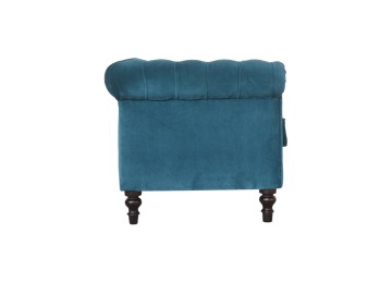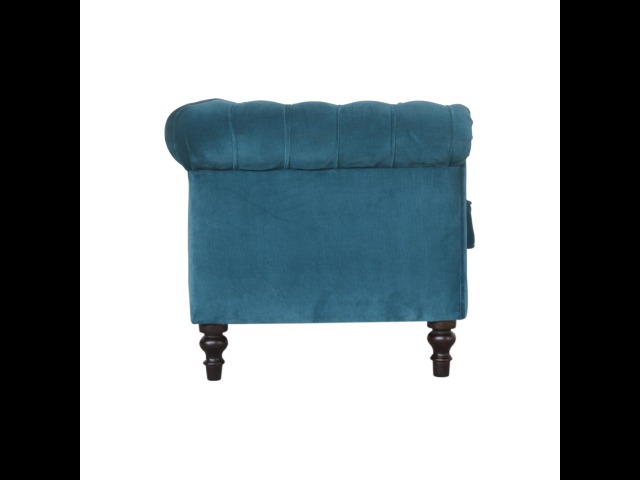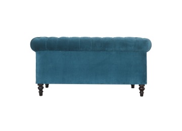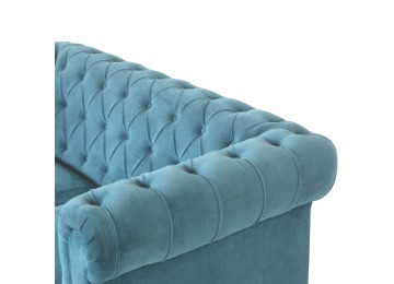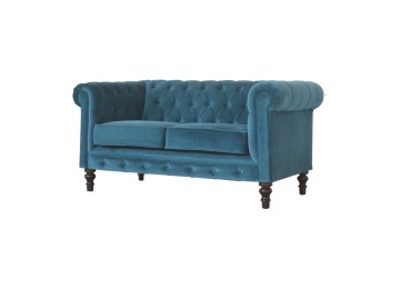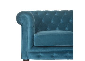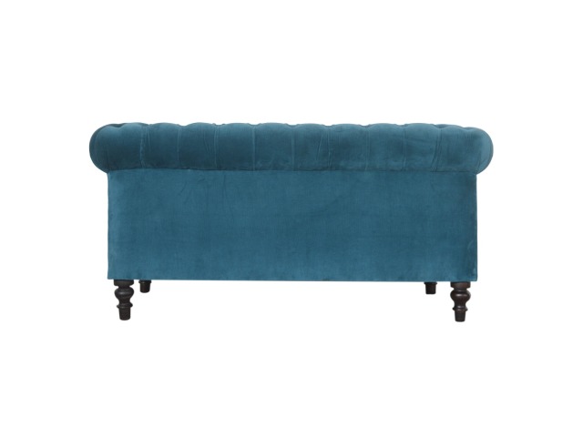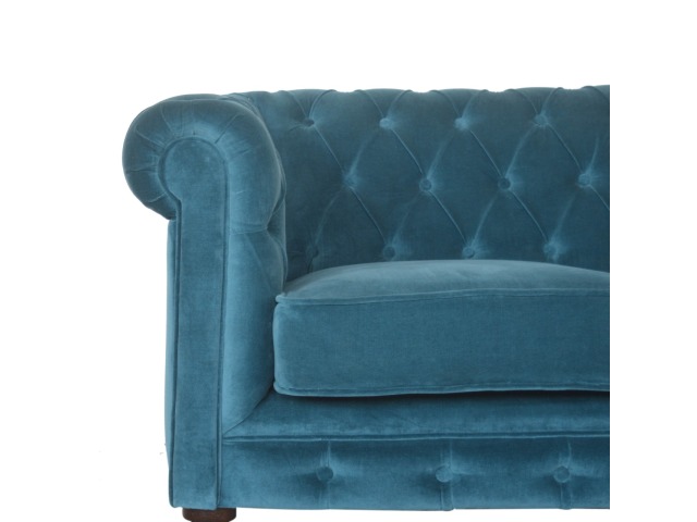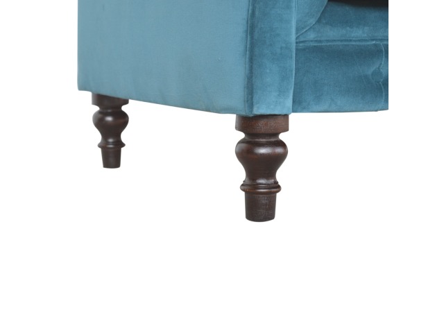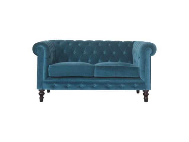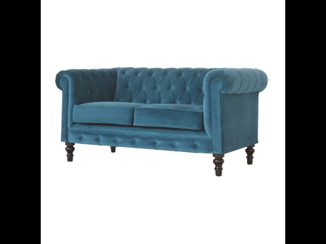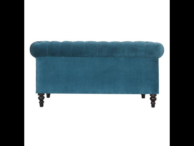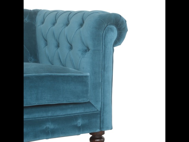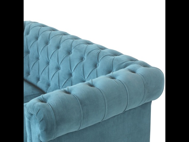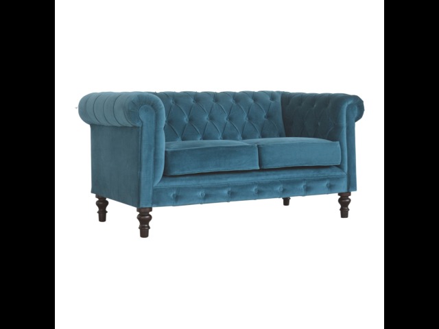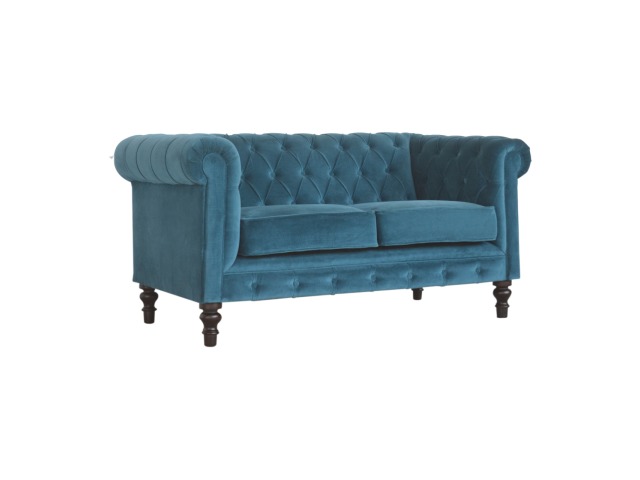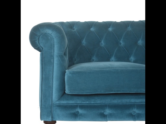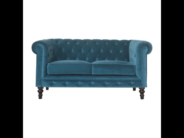This beautiful 2 Seater Chesterfield Sofa has been upholstered in a luxurious smooth teal cotton velvet, It features 4 turned feet constructed from 100% solid mango wood in a walnut finish. This sofa is detailed with deep button tufts, piping, and sheltering arms. This is a statement piece that can be added as a pop of colour and be suited to different home settings. Product to be delivered on the pallet as a pavement/kerbside delivery. Customer needs to dispose off or use it if they wish to. For possible returns, we would require the original pallet alongside full packaging as part of returns policy.