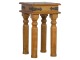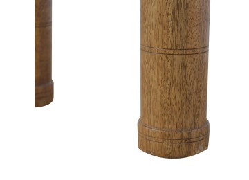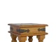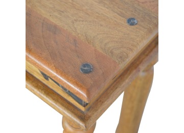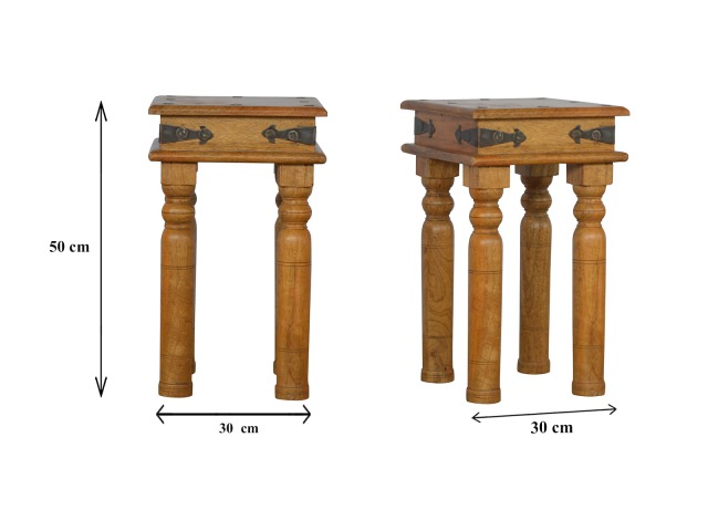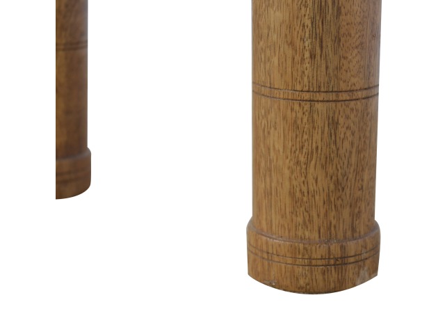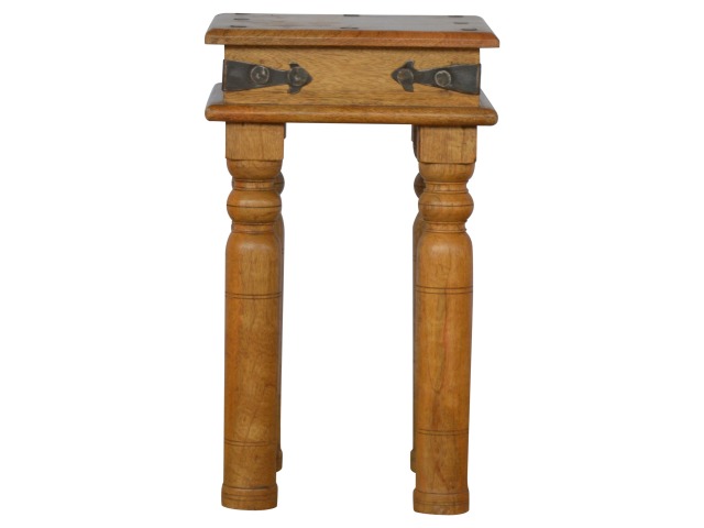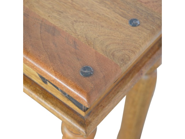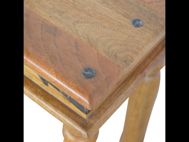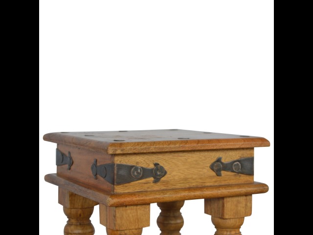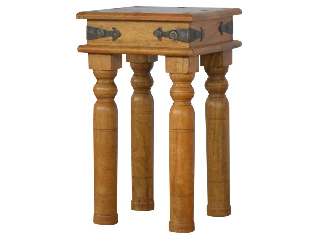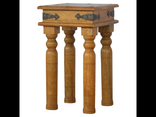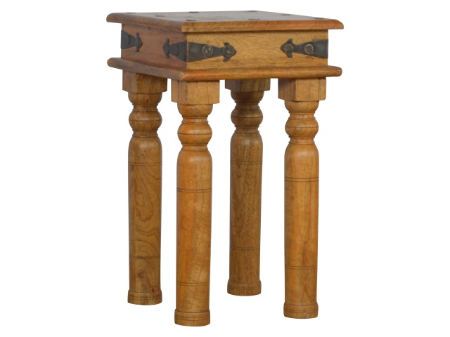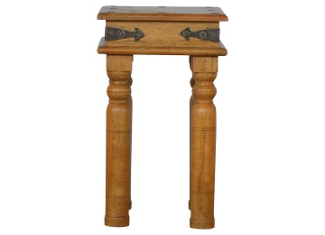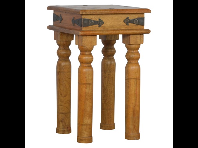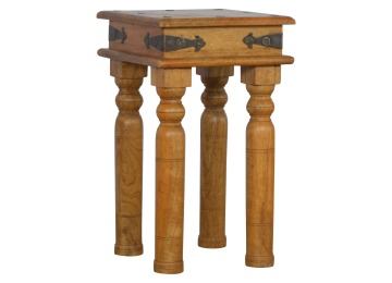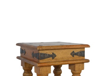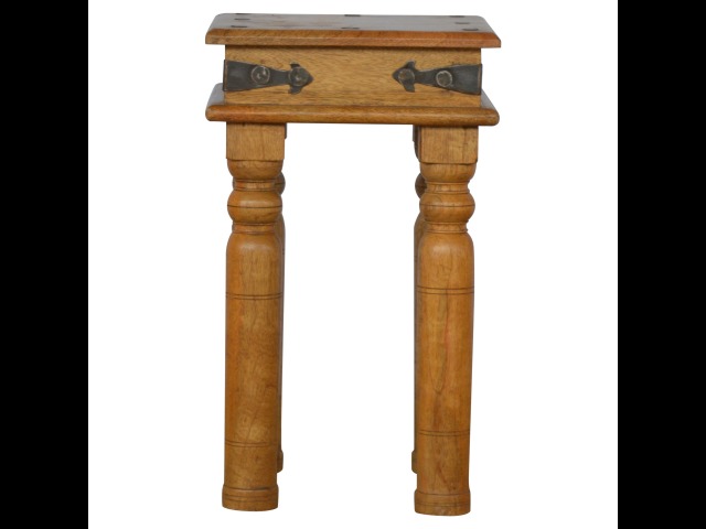 This petite coffee table has a beautiful oak-ish finish and 4 carefully hand carved turned legs that will bring a whole new look to your home. The attractive design with metal iron clips along with the rich colour of the wood makes it a superb piece of furniture to look at that is also highly functional.