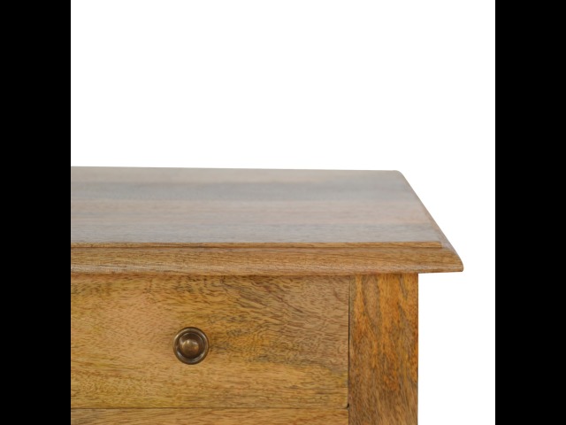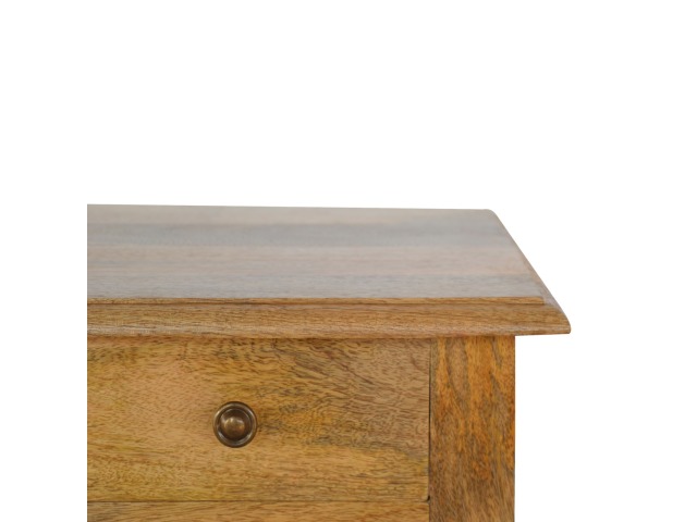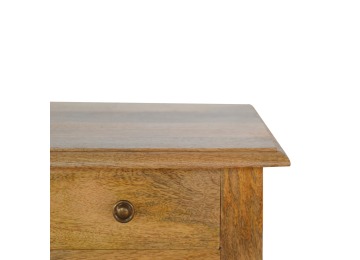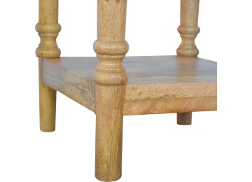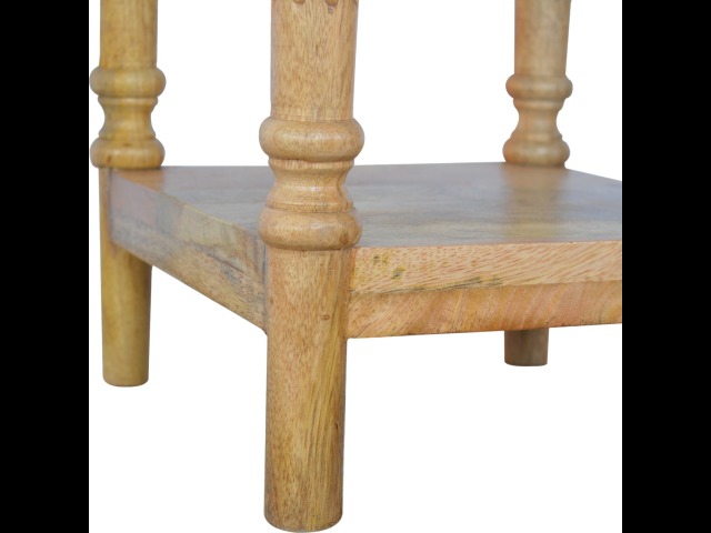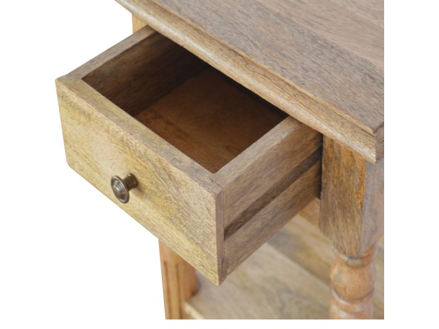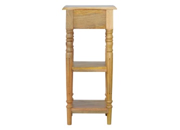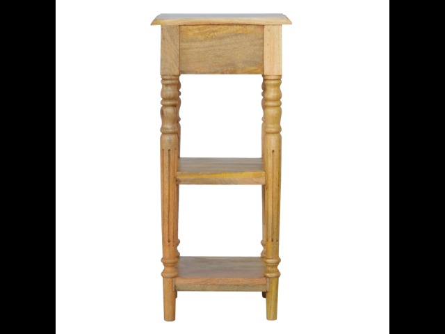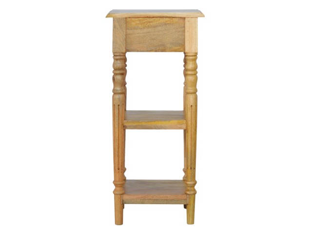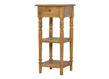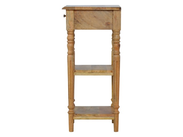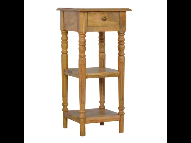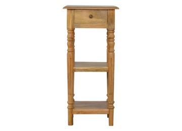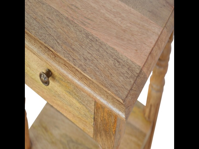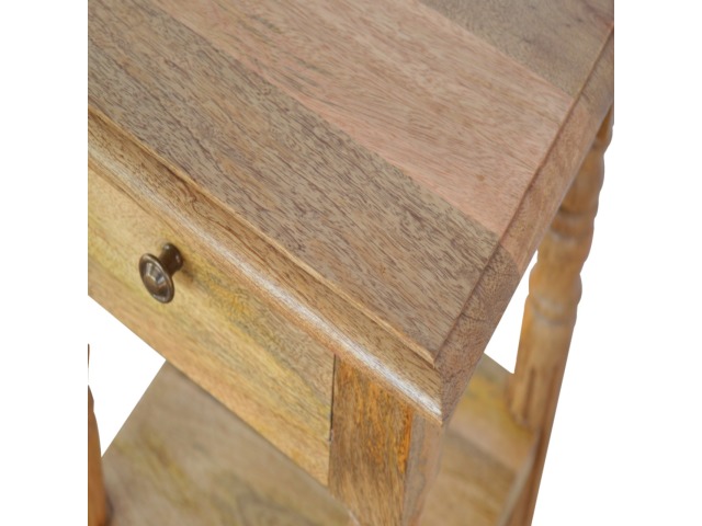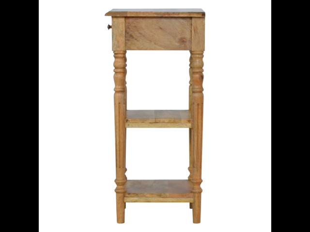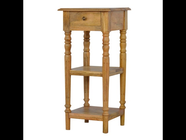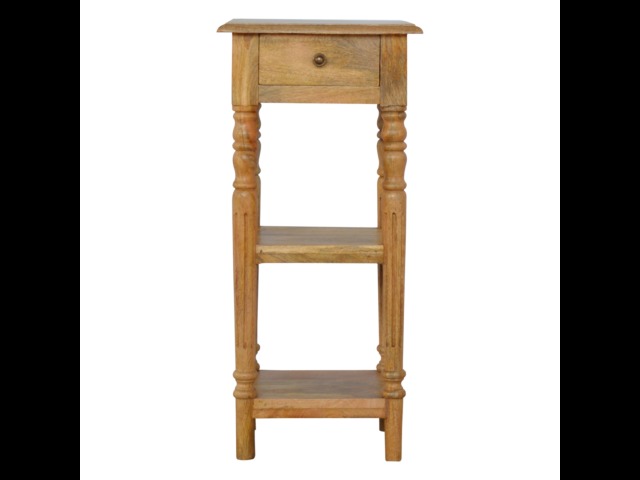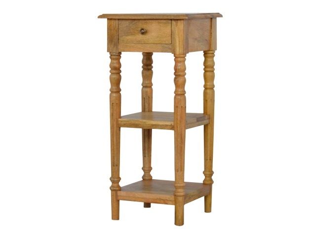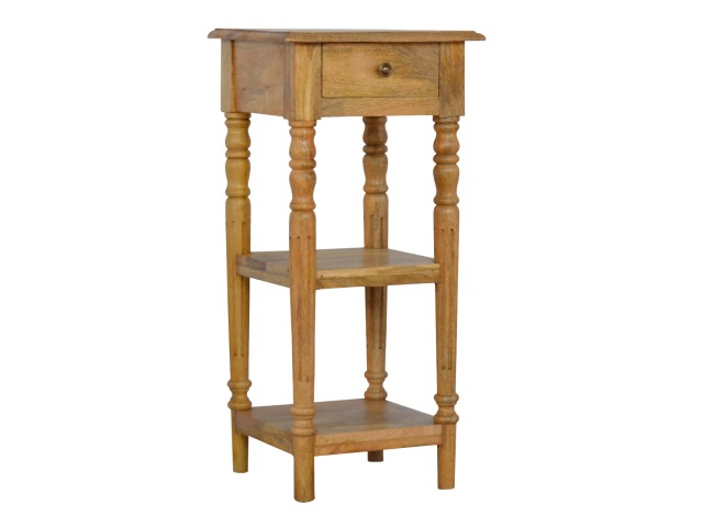 This 1 Drawer, 2 shelf occasional table is the perfect addition to any room. Suitable for narrow hallways as an ideal place to store small items like keys and address books. This table is a great storage solution with 1 drawer and 2 shelves to provide ultimate convenience. It is constructed from 100% solid mango wood and has a lovely oak-ish finish. Other features include beautifully hand turned legs and a round shiny knob for the drawer.