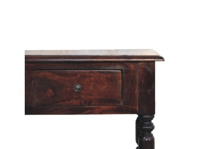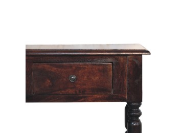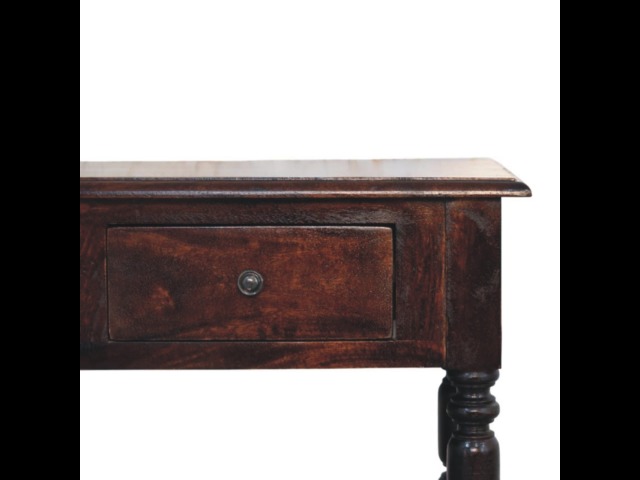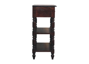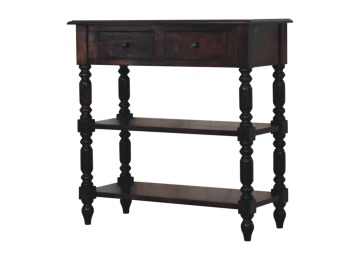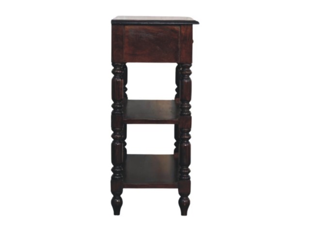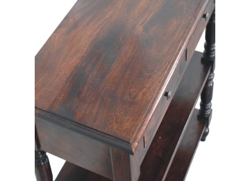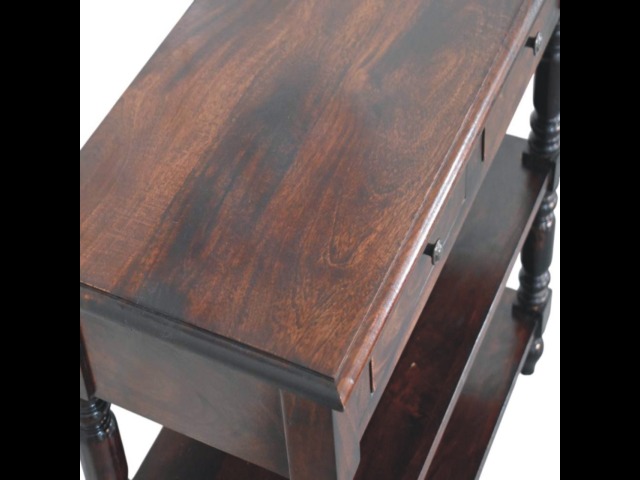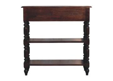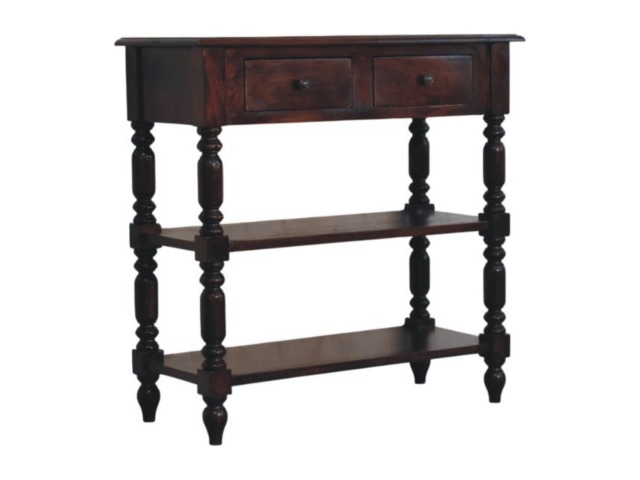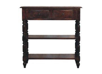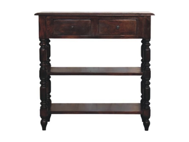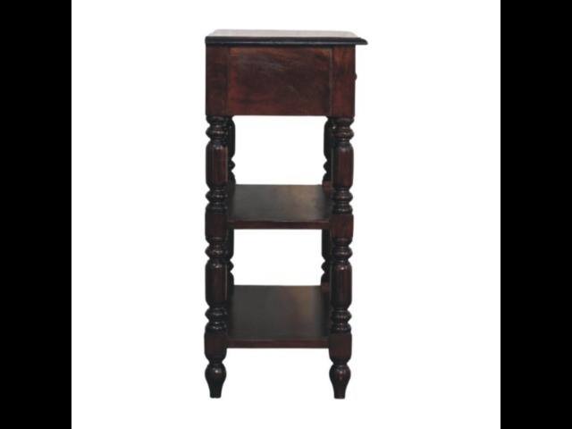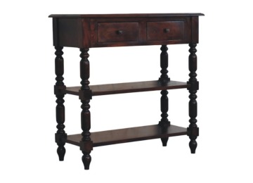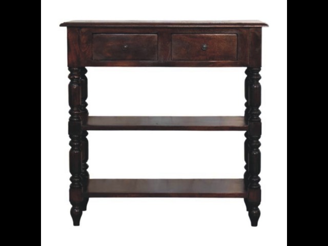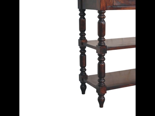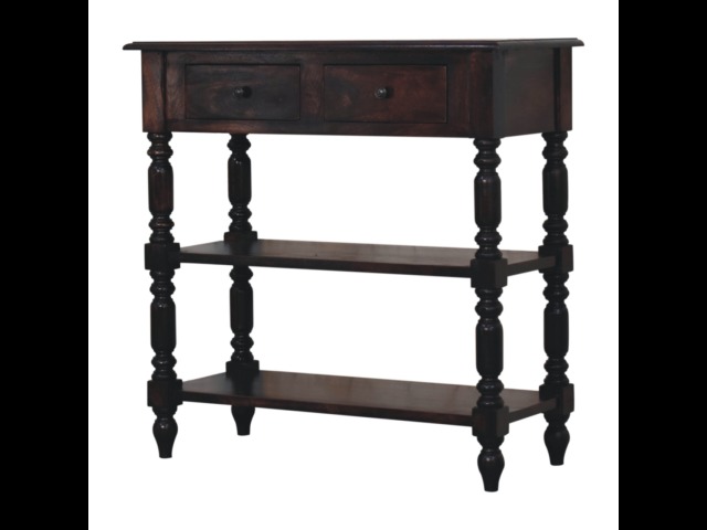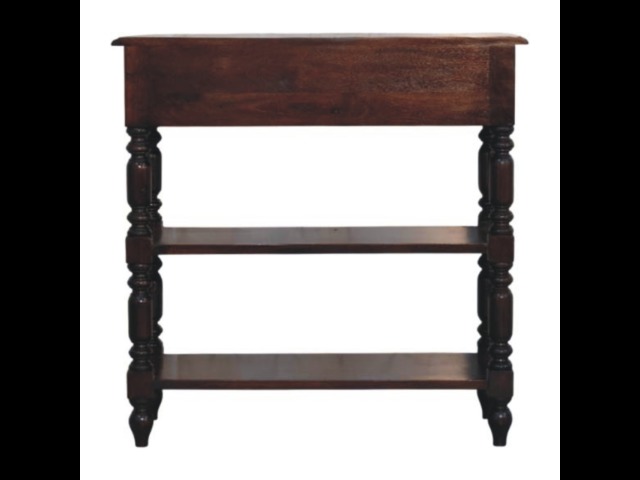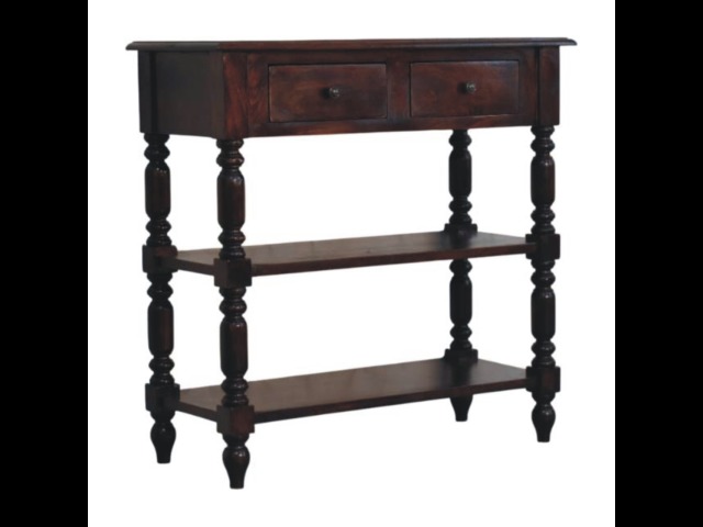 Elevate your space with the Turned legs Cherry Side Table, a perfect blend of classic charm and practicality. Crafted from 100% solid mango wood in a rich Cherry finish, this table features two compact drawers for discreet storage and two open shelves for displaying decor or organizing essentials. The intricately turned legs lend a timeless, elegant appeal, making it an ideal addition to entryways, hallways, or living rooms. Combining durability with sophisticated design, the Turned legs Cherry Side Table is a versatile and stylish solution to enhance your home décor.