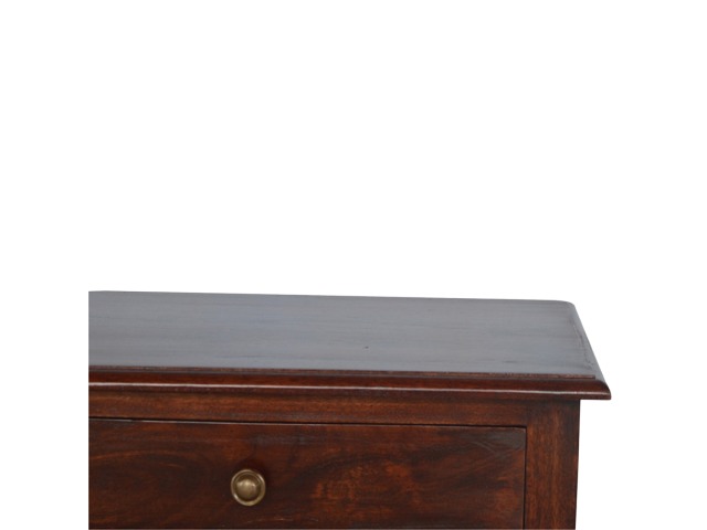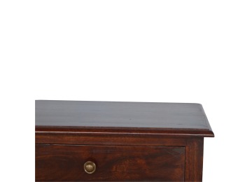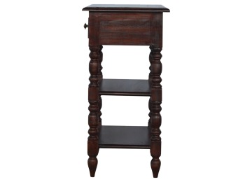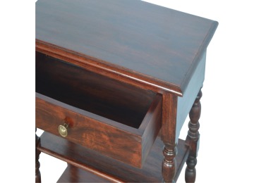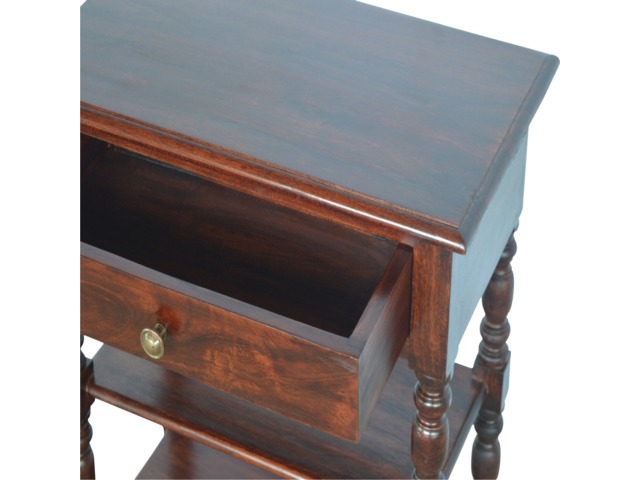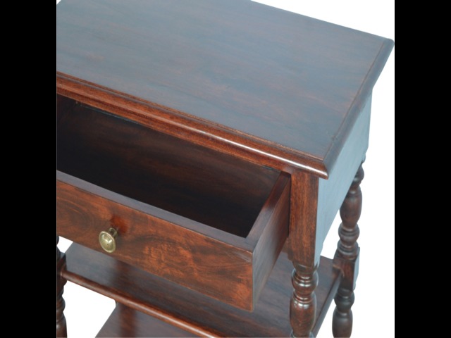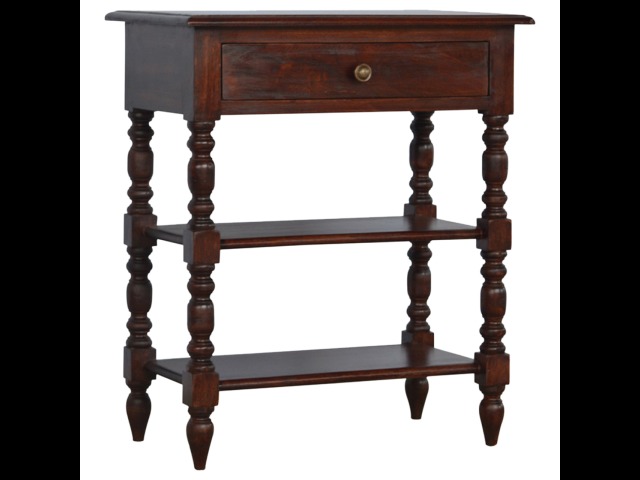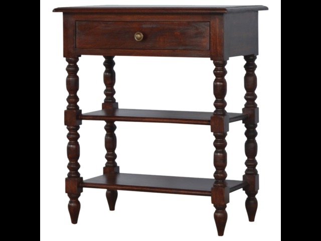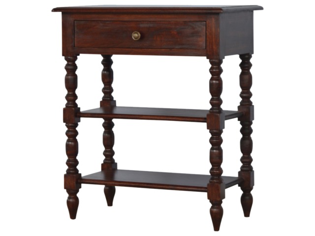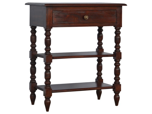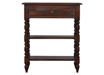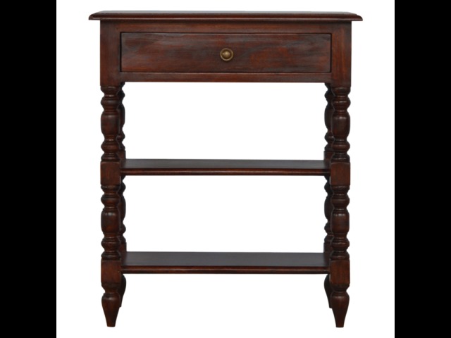 This 1 Drawer, 2 shelf occasional table is the perfect addition to any room. Suitable for narrow hallways as an ideal place to store small items like keys and address books. This table is a great storage solution with 1 large drawer and 2 shelves to provide ultimate convenience. It is constructed from 100% solid mango wood and has a lovely cherry finish. Other features include beautifully hand turned legs and a round shiny knob for the drawer.