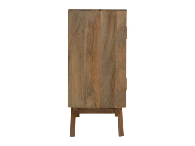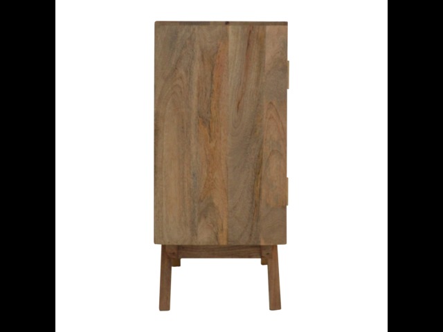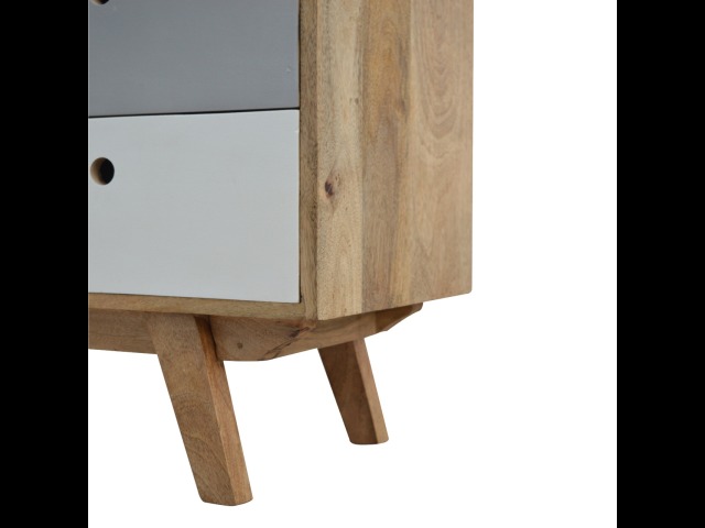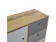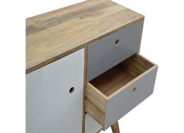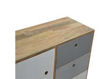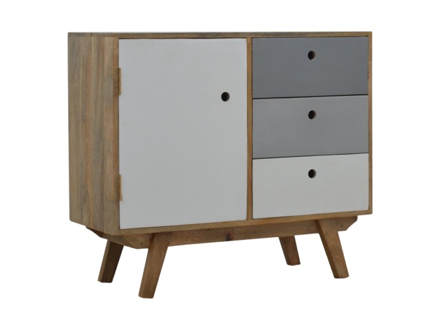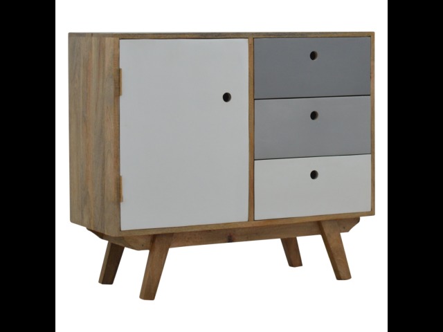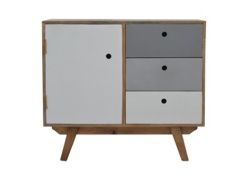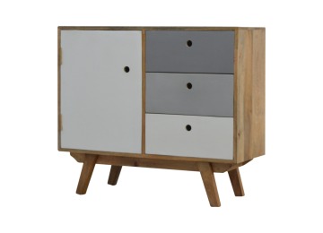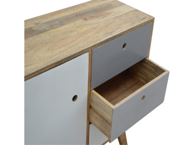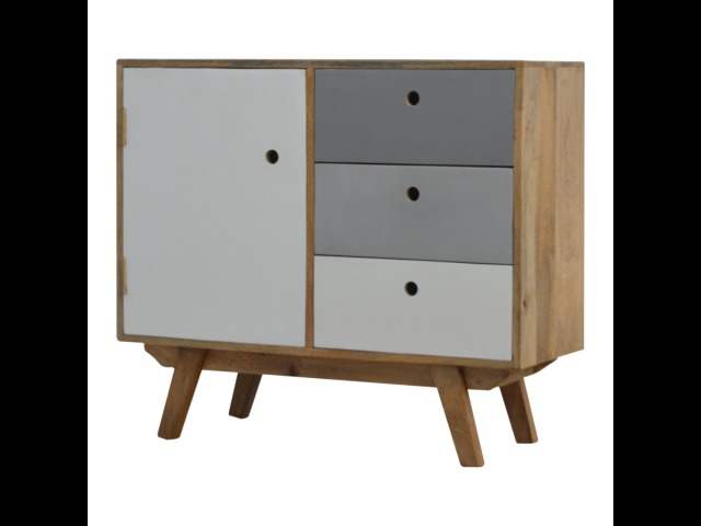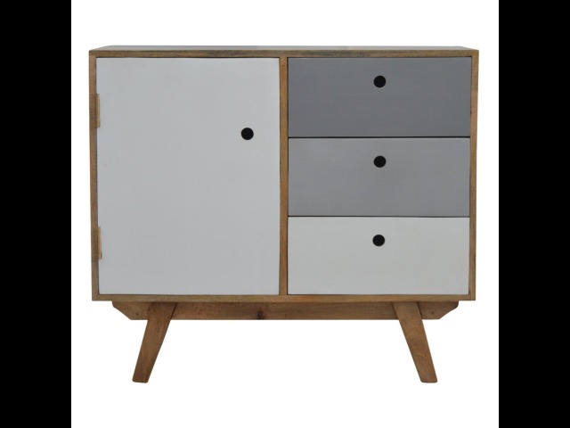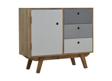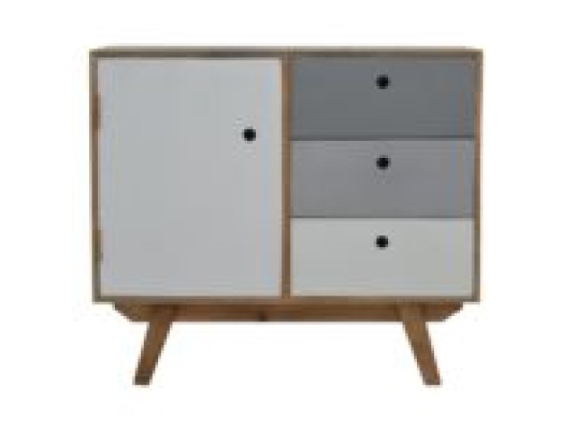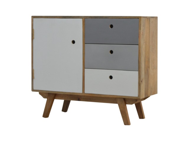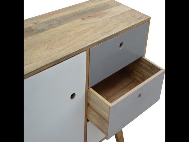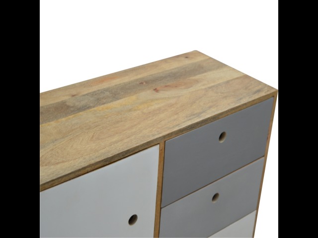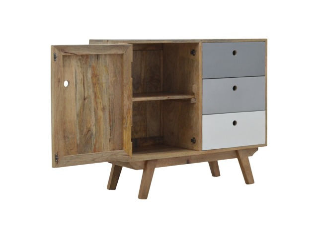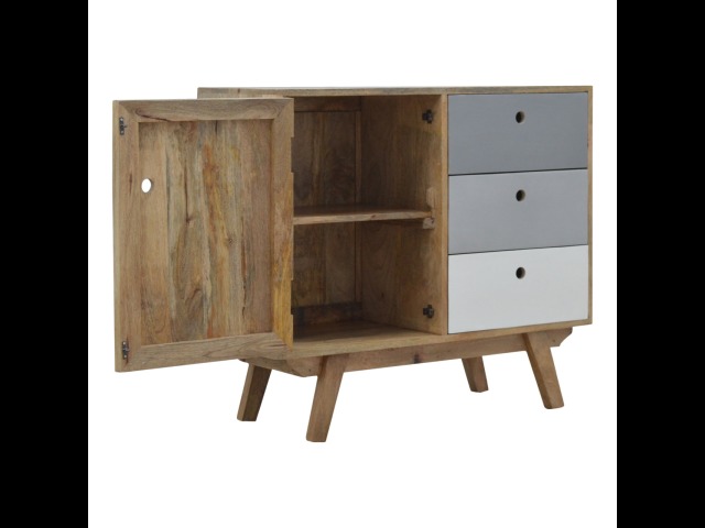 This Nordic style cabinet has been constructed from 100% solid mango wood in an oak-ish finish and features 3 drawers hand painted in two tones of grey and a cabinet with cut out open slots for easy access into the drawers. It can be used to store any bits and pieces in any part of the home and can suit interior styles for modern homes and apartments. It is a versatile product which can stand alone or be paired with the other pieces from the range.