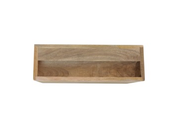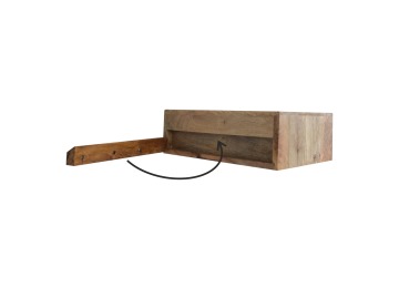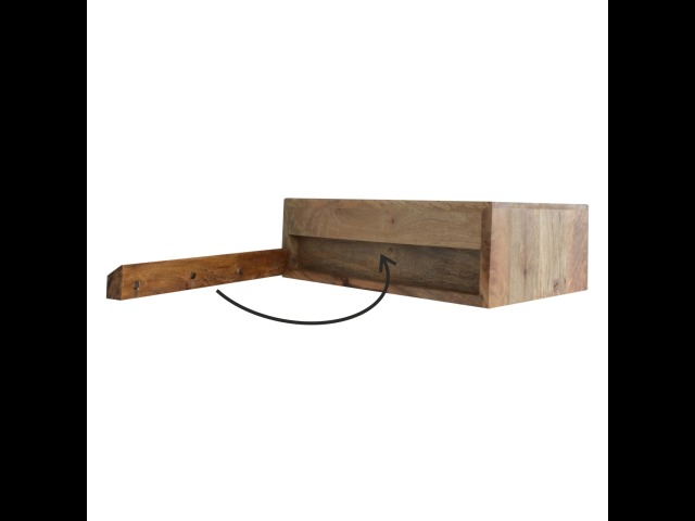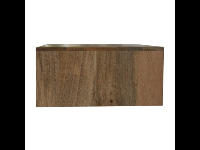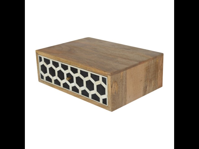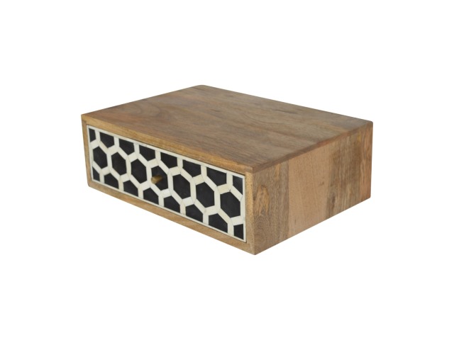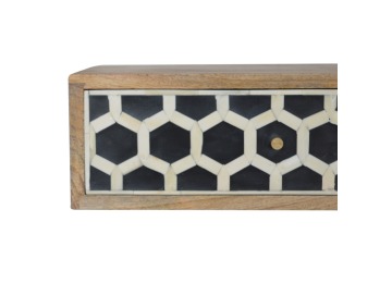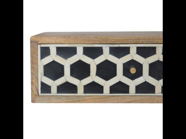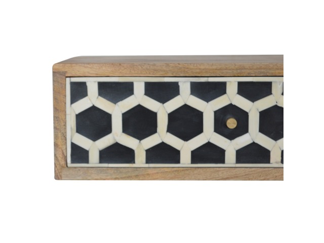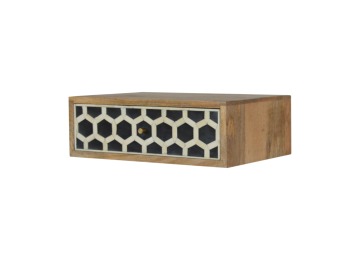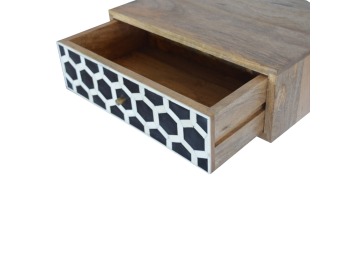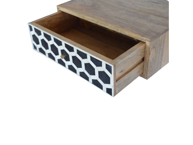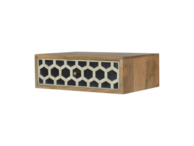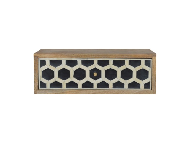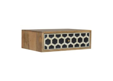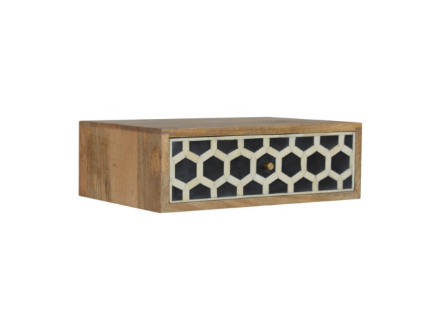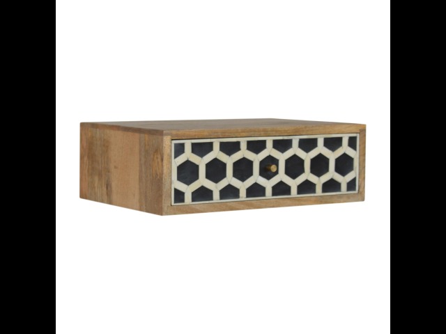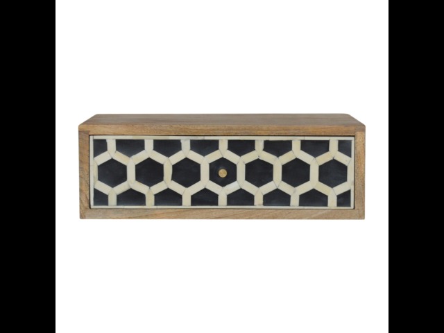 This minimalistic wall-mounted bedside has been constructed from 100% solid mango wood in an oak-ish finish and features a bone inlay design drawer with a shiny knob. This piece is perfect for storing any bits and pieces you wish to keep close by before bedtime. The bone inlay is sourced responsibly from deceased animals such as camels, goats, and buffaloes. Caution! Do not sit on the unit.