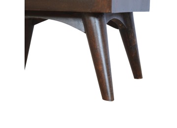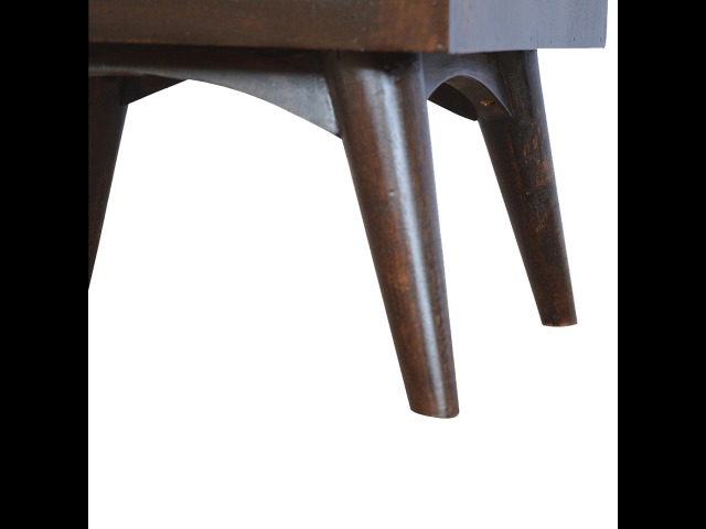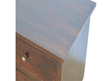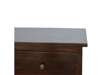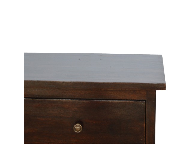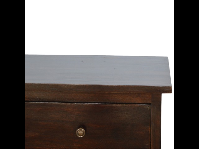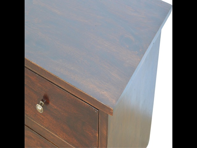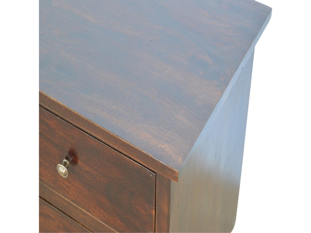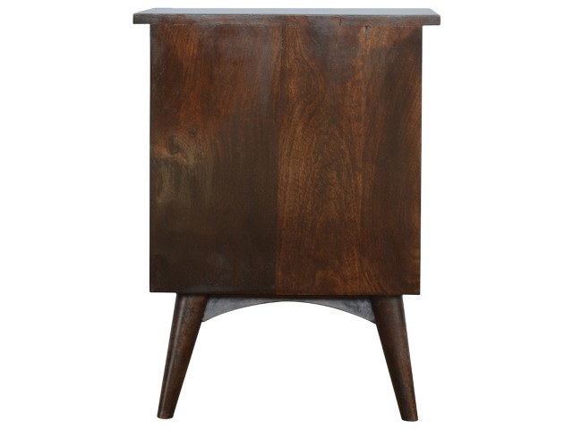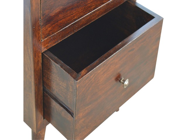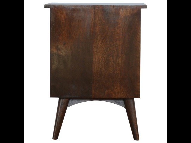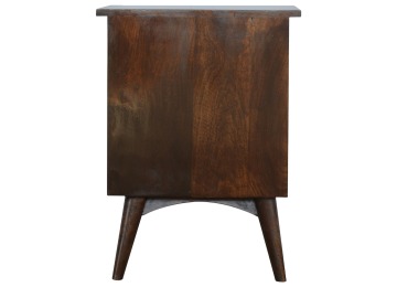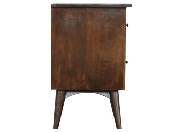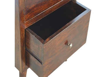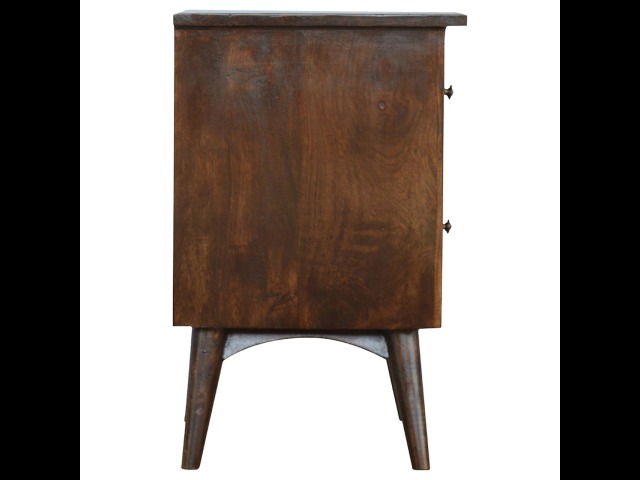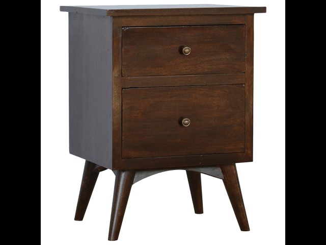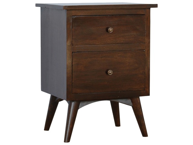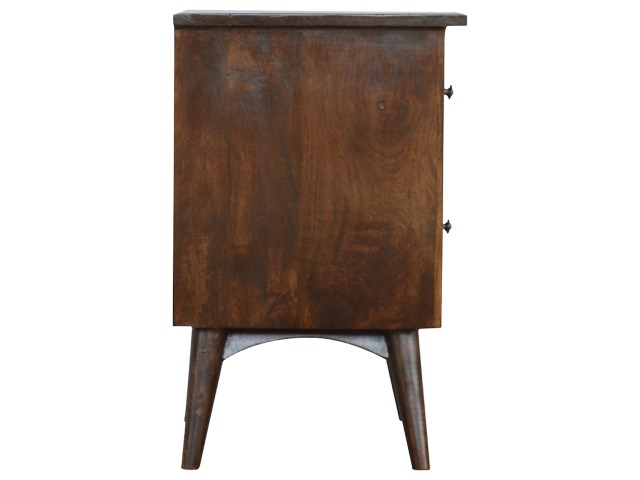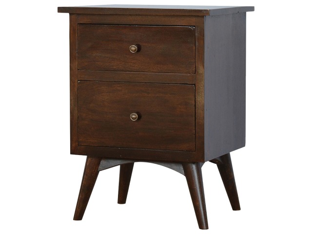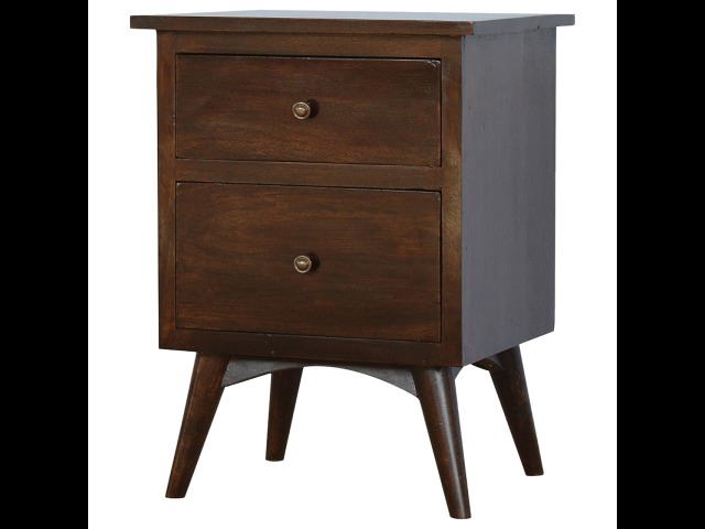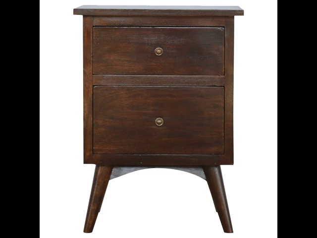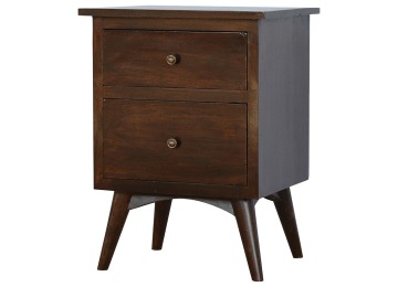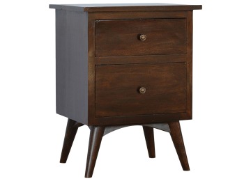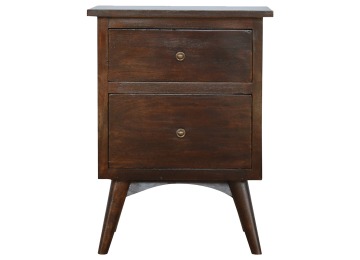 Enjoy the minimalistic and clean design that this bedside offers. It has been constructed from 100% solid mango wood and has a light walnut finish. It features tapered handcrafted legs and two deep drawers to take care of everyday utility items. This bedside or end table will add a definite and lasting character to your bedroom or living room. It can stand alone or be partnered with the other pieces from the walnut range.