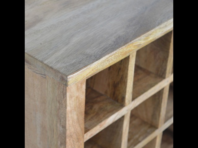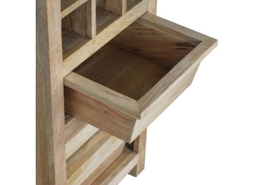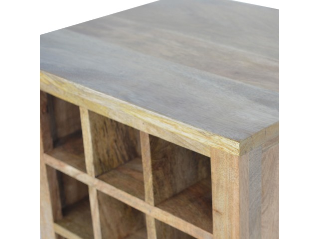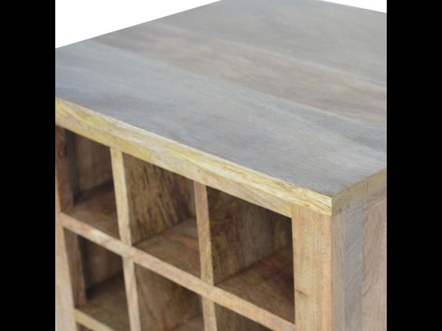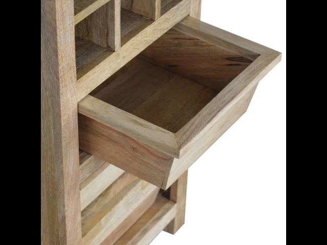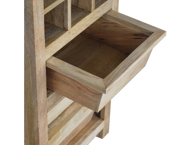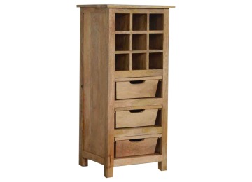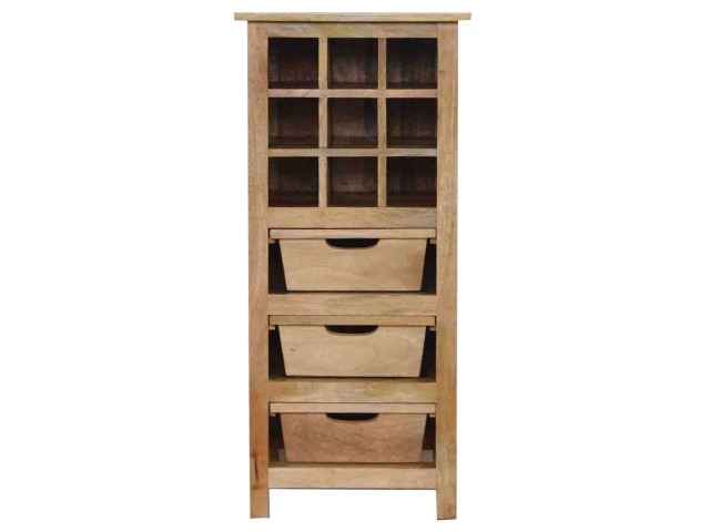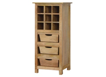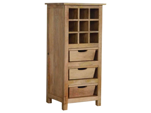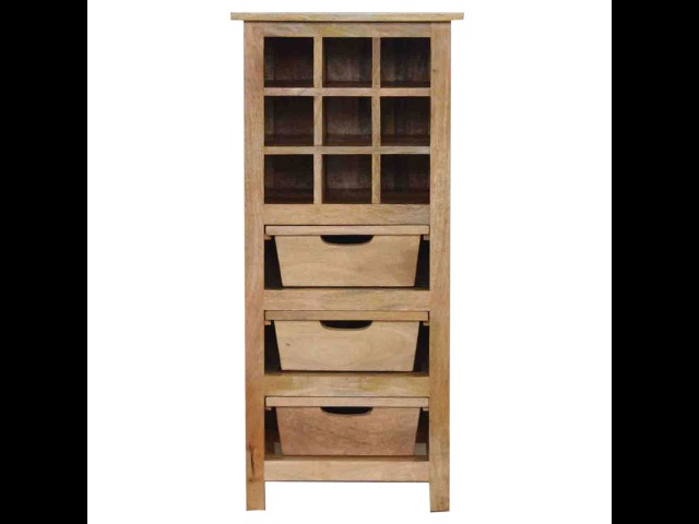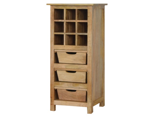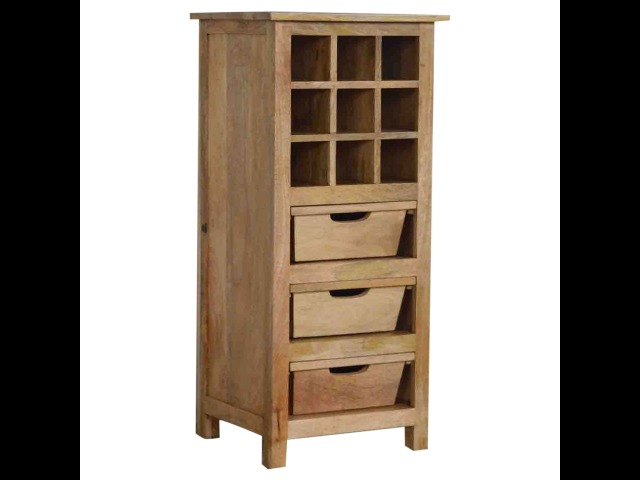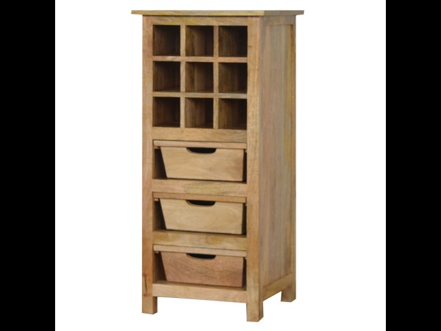 This is a beautifully handcrafted cabinet that offers 3 drawers and 9 wine bottle slots, it is constructed from 100% solid mango wood with an oak-ish finish. The slots are ideal to store any wine bottles and groceries or bits and bobs for the kitchen on the lower three shelves. It is practical storage that is built to last and is the perfect addition to any kitchen or dining room. Every piece of furniture is individually handcrafted and includes swing care tickets explaining the cautions and aftercare instructions.
